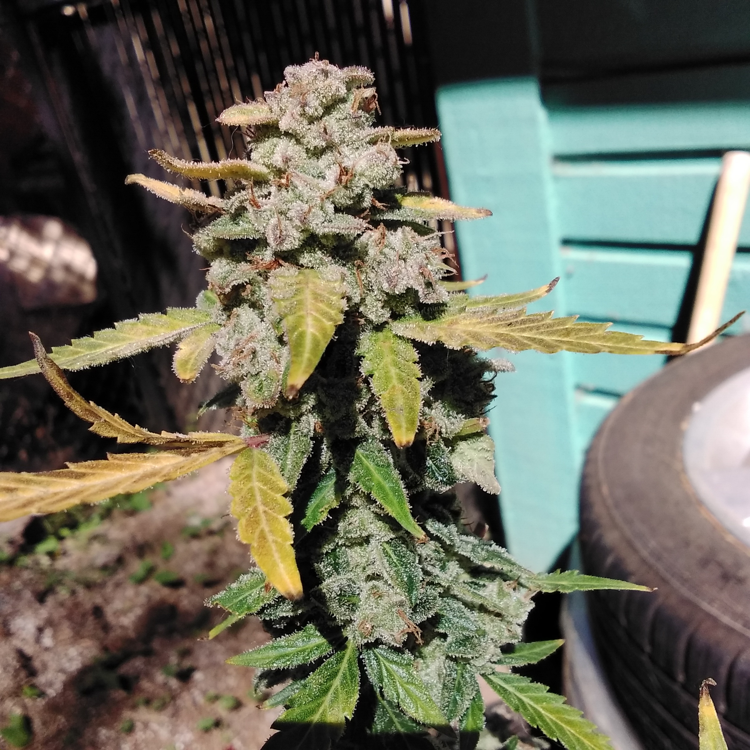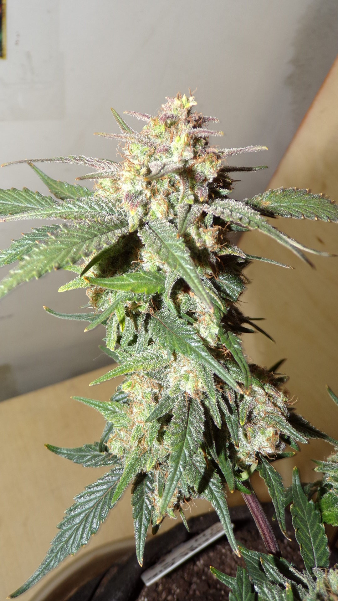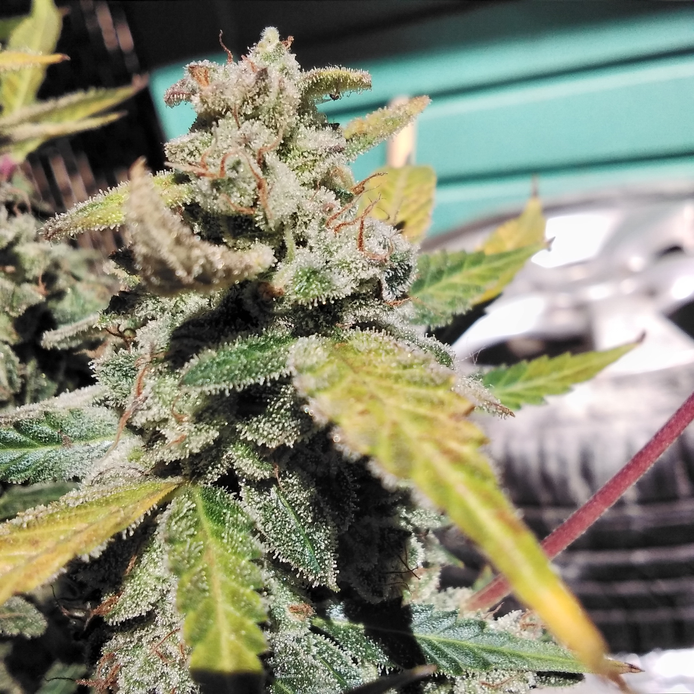 Last check tonight my eye caught something white on the runt, thought it was trouble. Appears to be the underside of a sugar leaf, covered in frost.