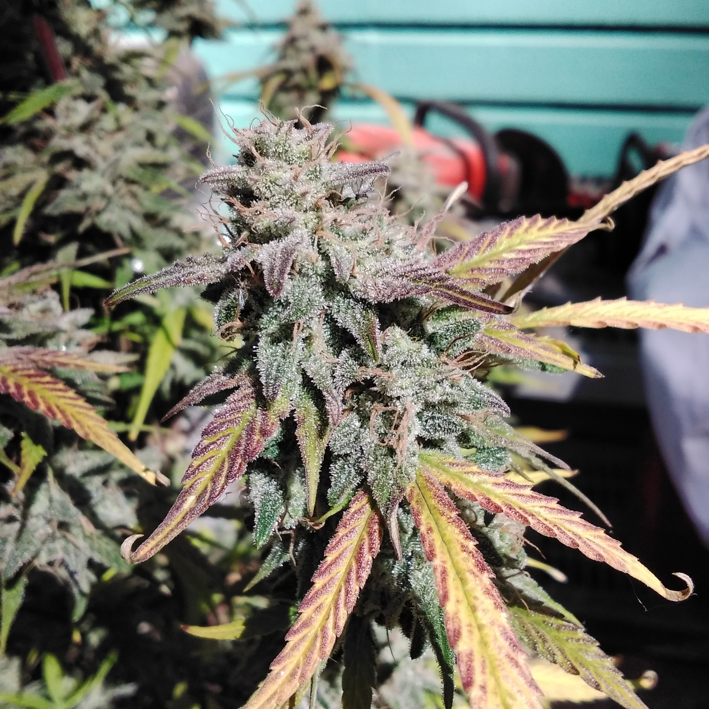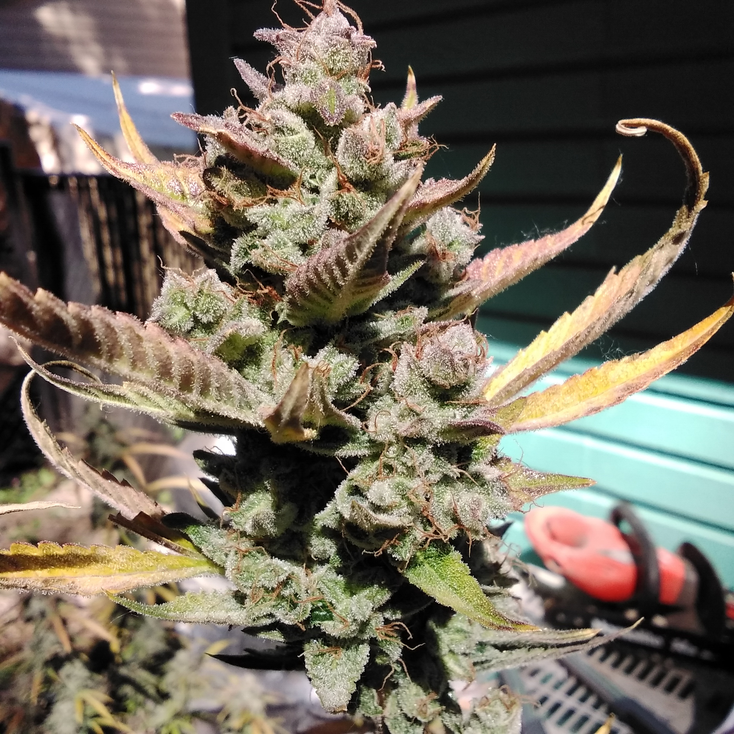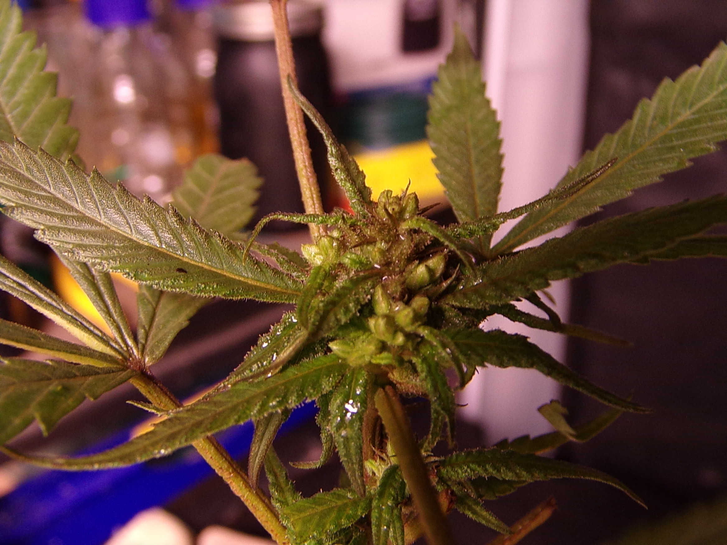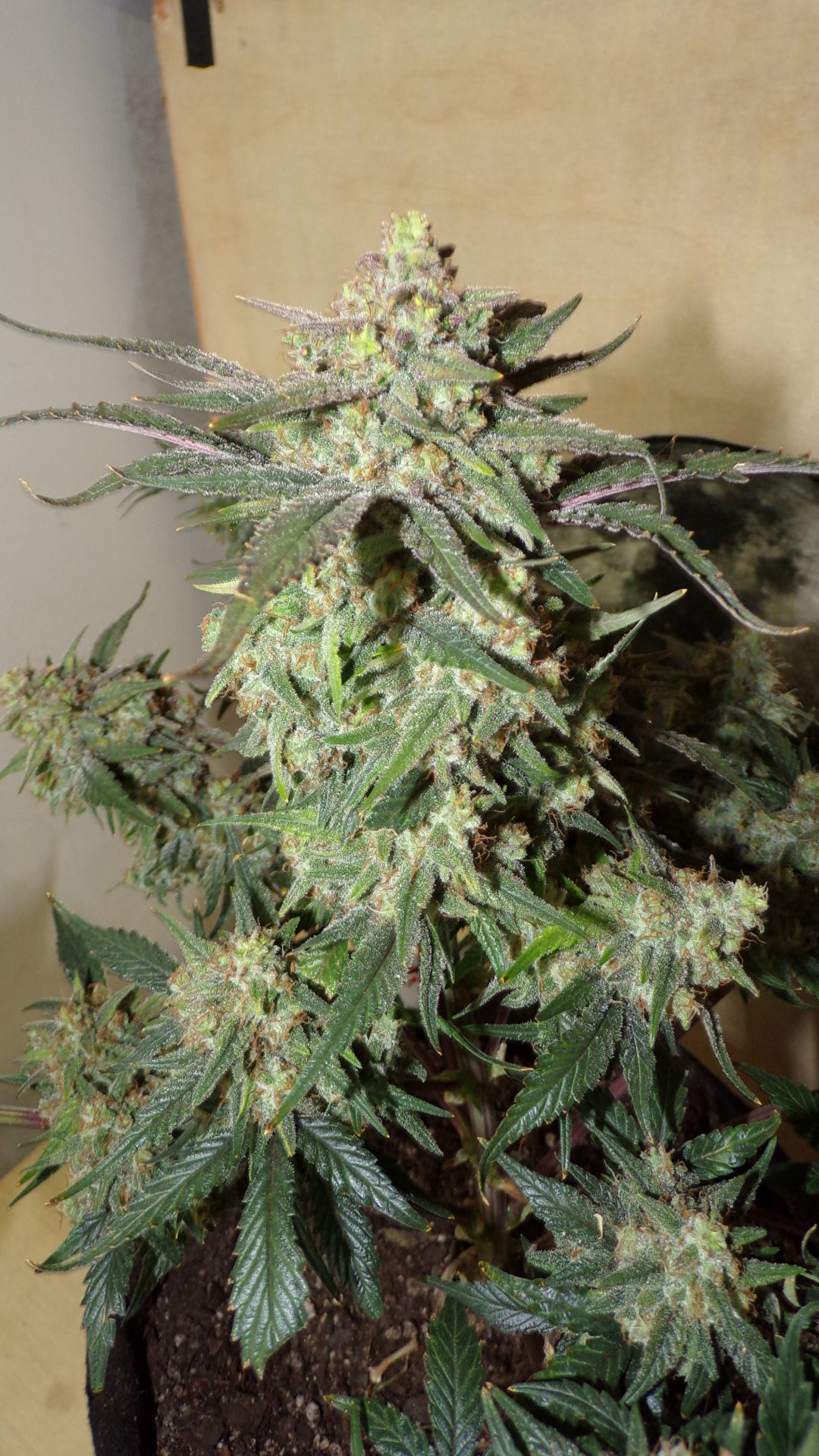 Last check tonight my eye caught something white on the runt, thought it was trouble. Appears to be the underside of a sugar leaf, covered in frost.