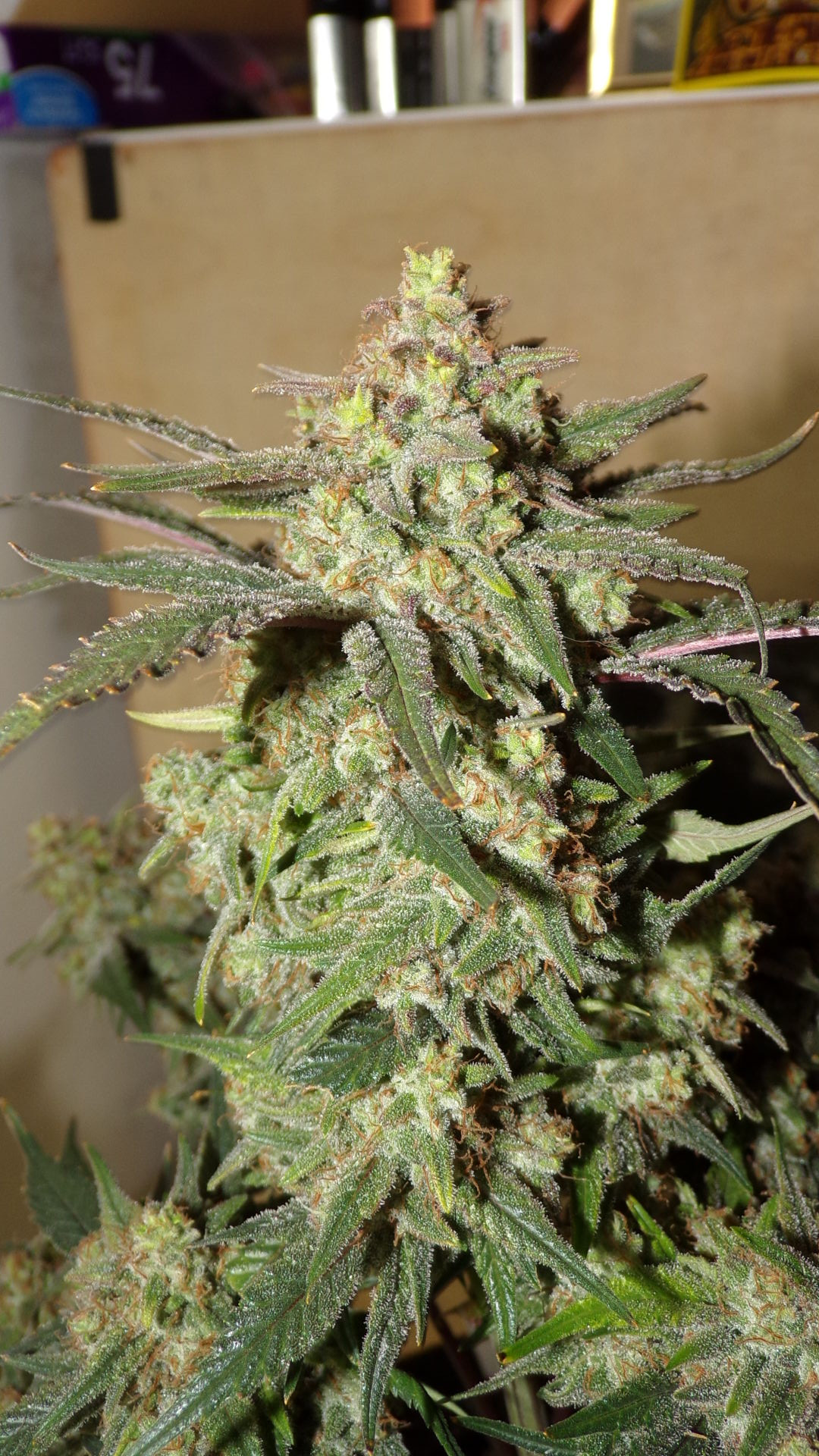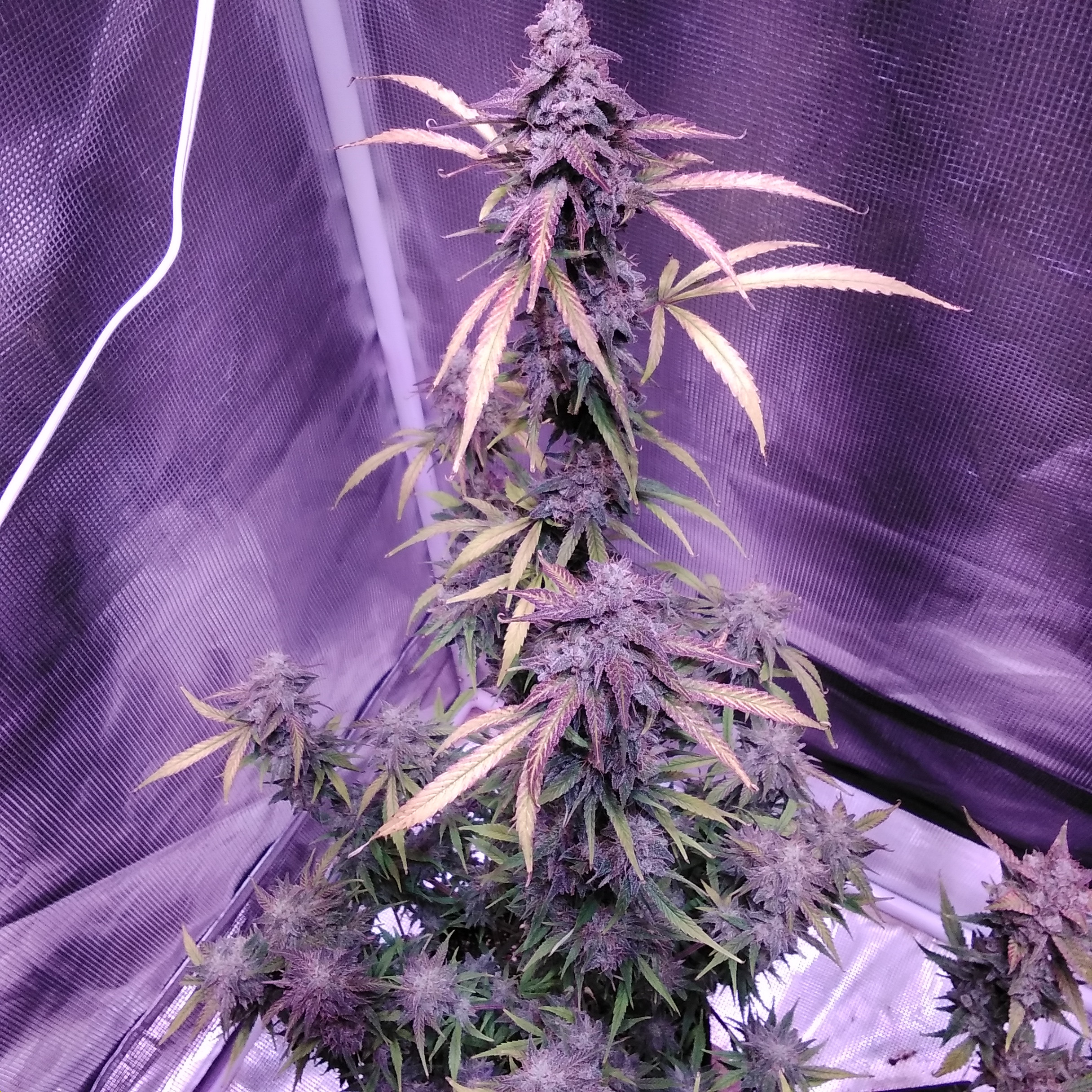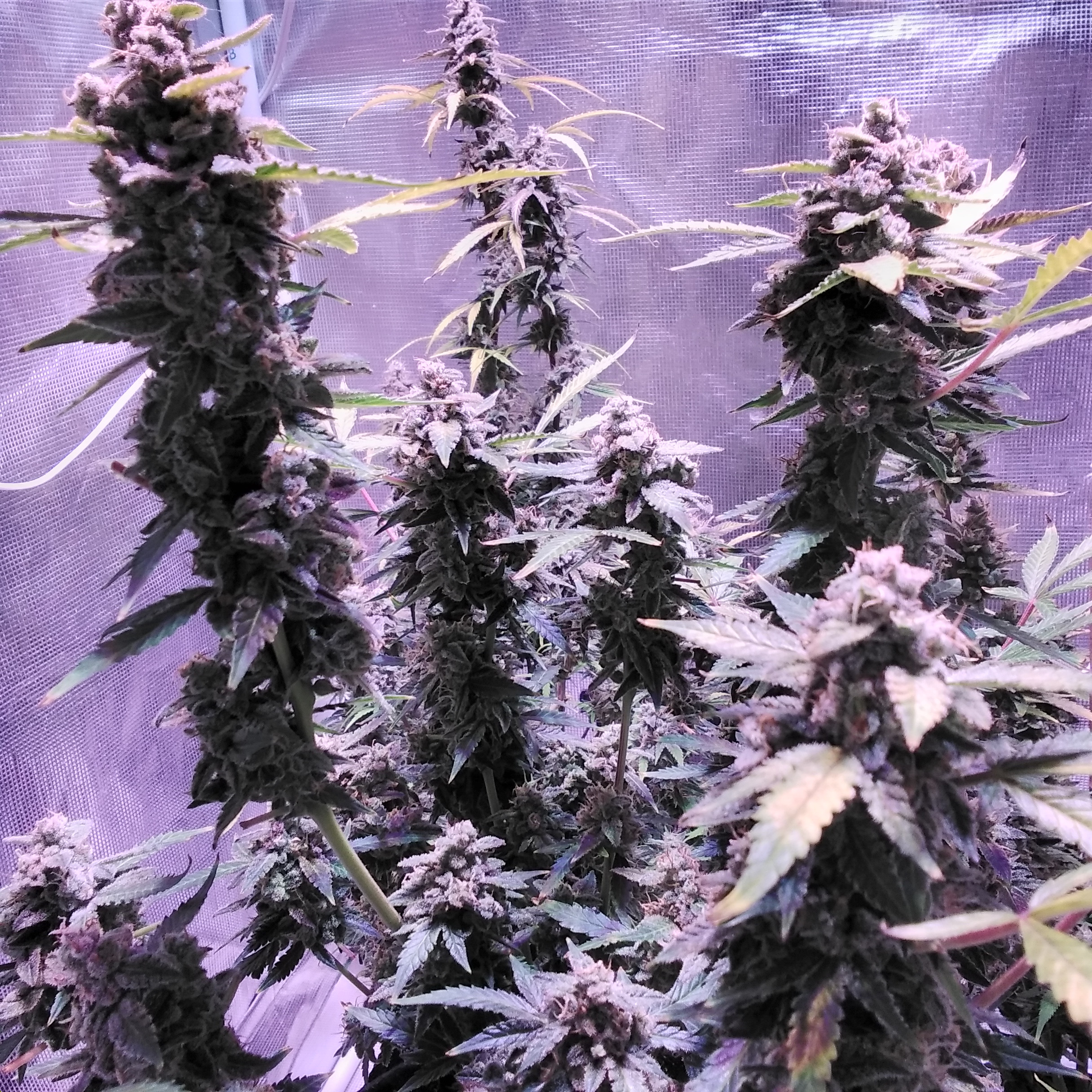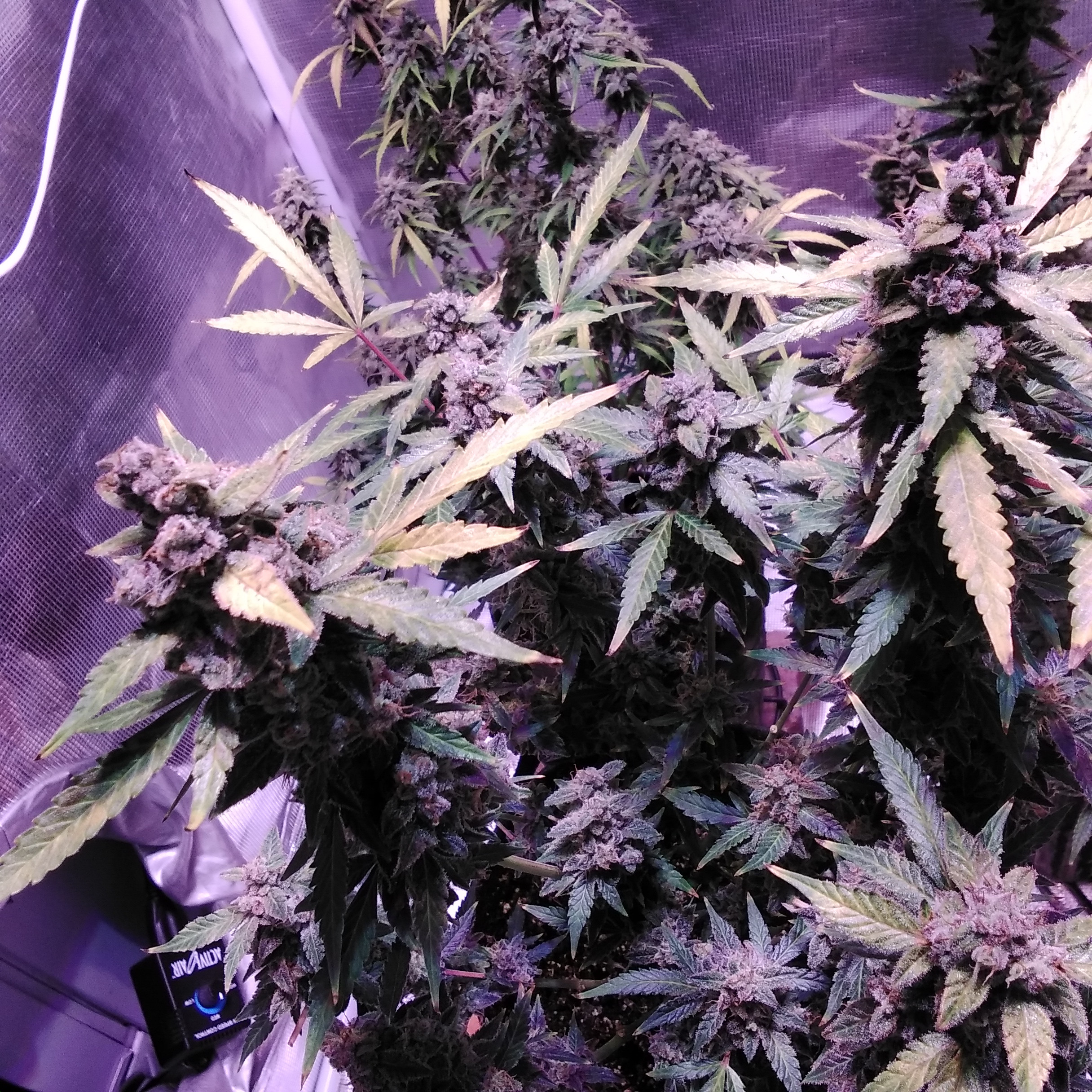Looking real nice Canuck147 Top pics really showing dark bud colours, almost purple. Chunky frosty buds too. I think I remember that you go pretty much full amber (hope that's right)...check the trichs yet?