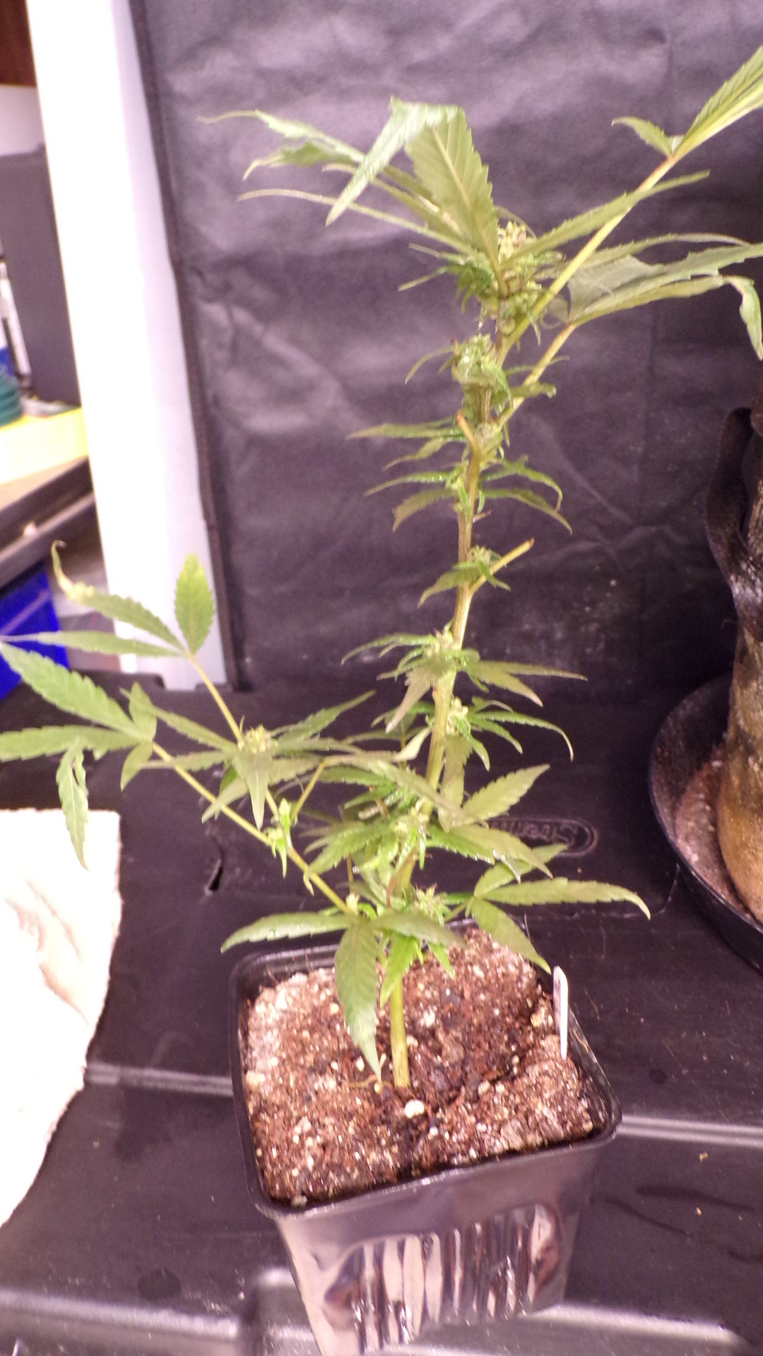 Might not look like much but I threaded the needle (plant hooks): Chewy is laid down exposing bud sites; you can see through Lemon's stem; part of the runt's stem is visible. The cat topped Chewy at node 4.3 PhotosSoil: Coast of Maine Stonington Blend, perlite; Seedlings: CoM org potting soil