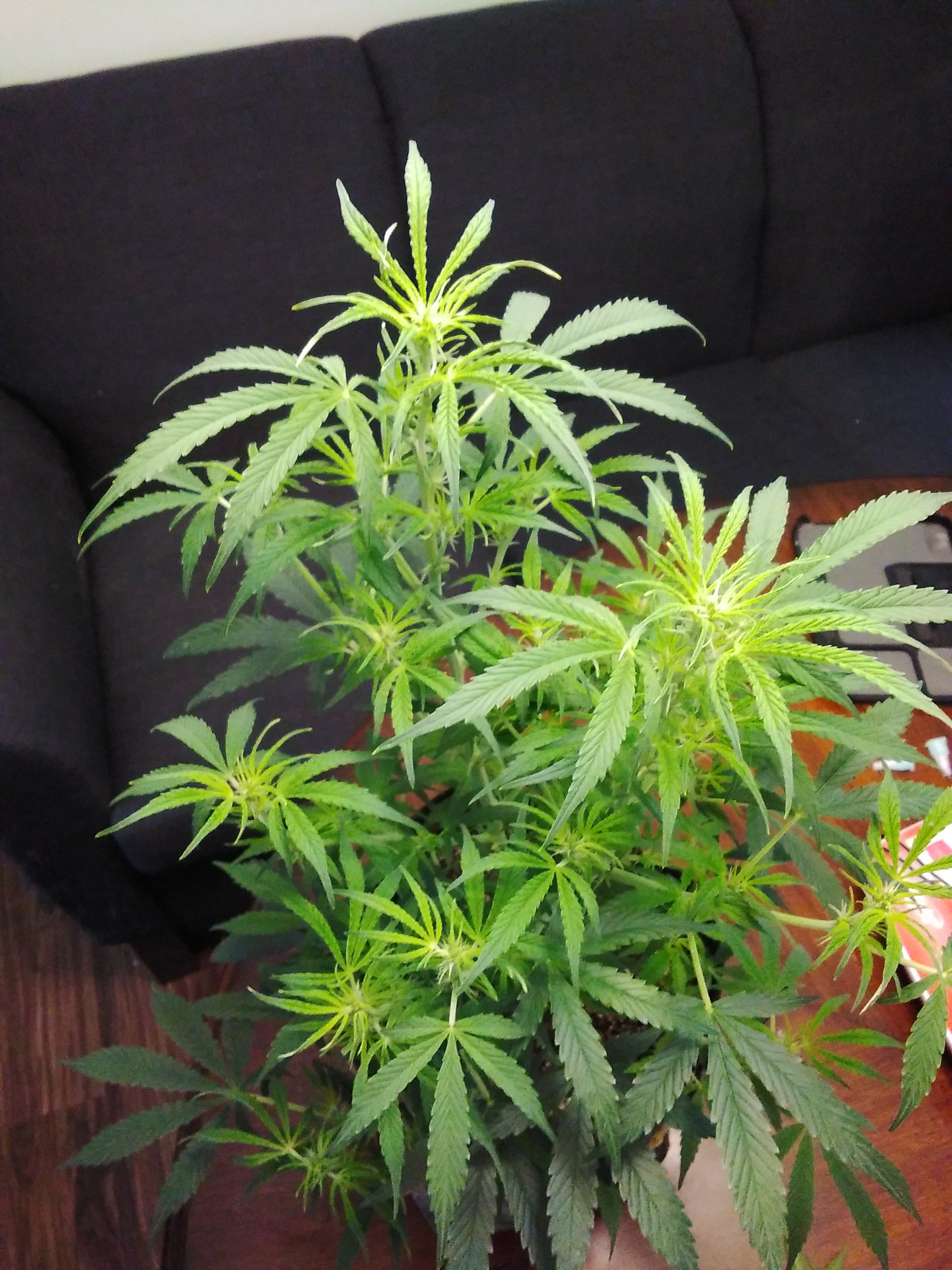 she is starting to flower. i dont know the genetic details so i dont know how much she will stretch. she is also suffering from a little nitrogen toxicity.
