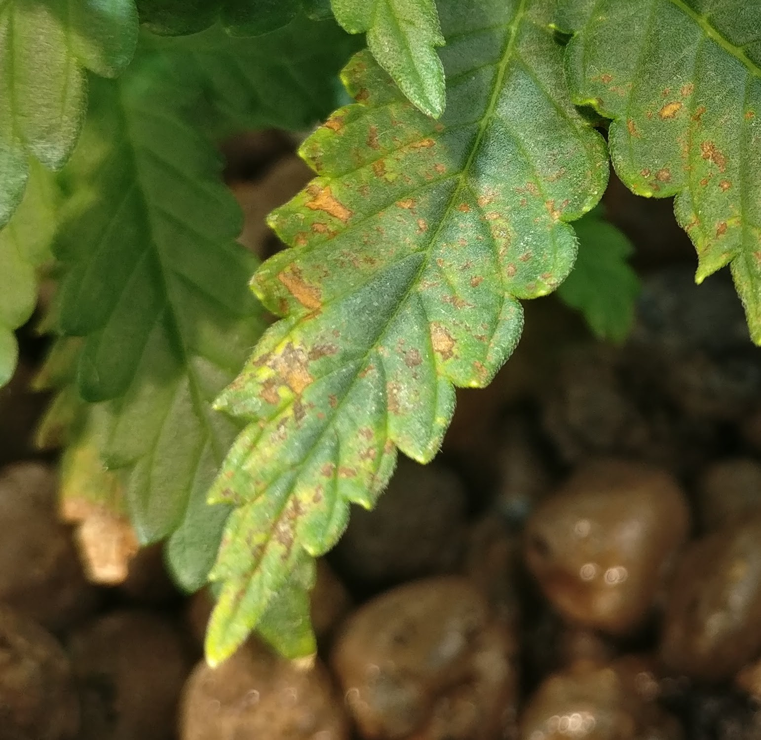 The old leafs start with brown spots and then they become yellow and curled on the peaks.