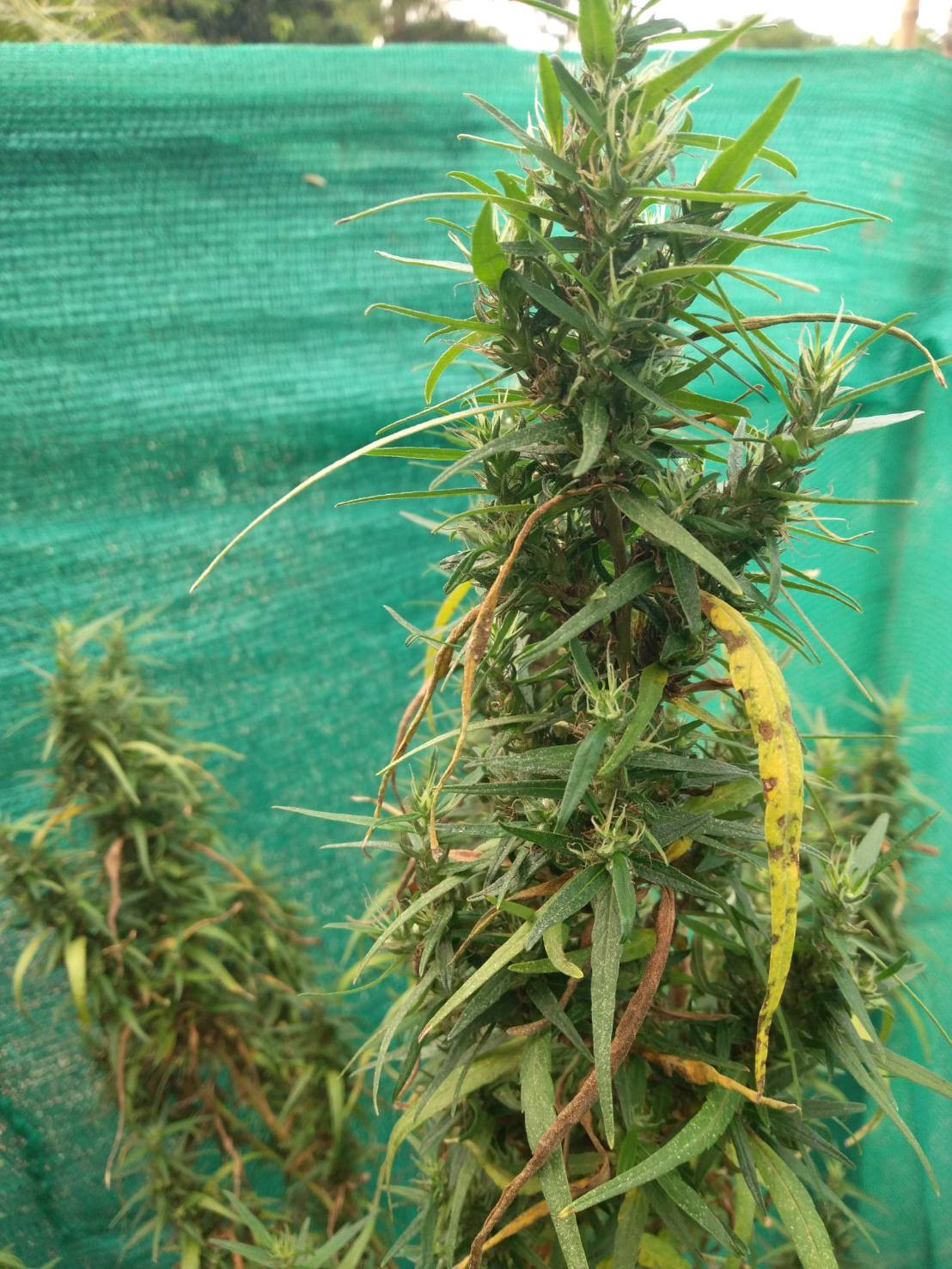 it is surprising how little attention in terms of veg these plants need if the soil or medium is naturally loaded with macro & micro nutes in Thailand as it usually is. Probably way too late but Im 99% sure those are spider mites and that strain you have there is called Squirrel Tail or Hang Kralok. It is a land race from the North East/Laos and a real shame she hermed but all do when they get stressed buy spider-mites which are bad this year, I know, I'm here...