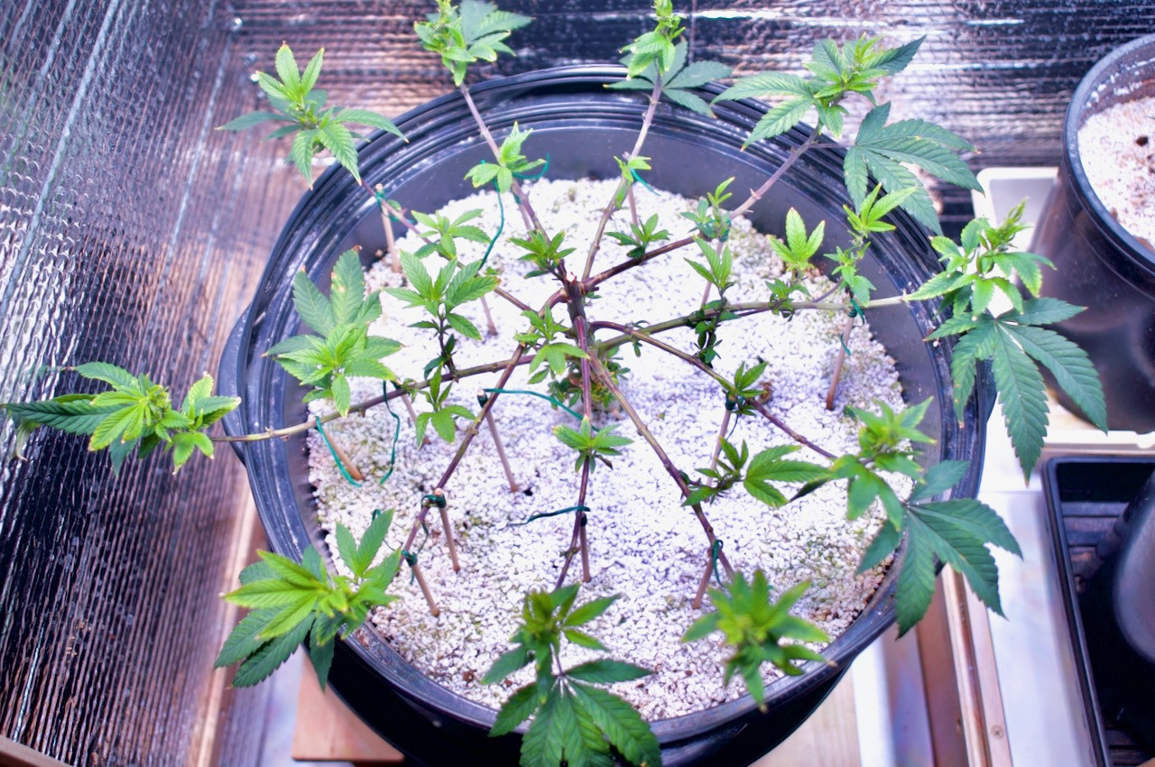 The GG#4 tells a different story. Here she is on April 9. Happy, growing, just been deci-folded. Something new for me and my lateral anchor stakes.