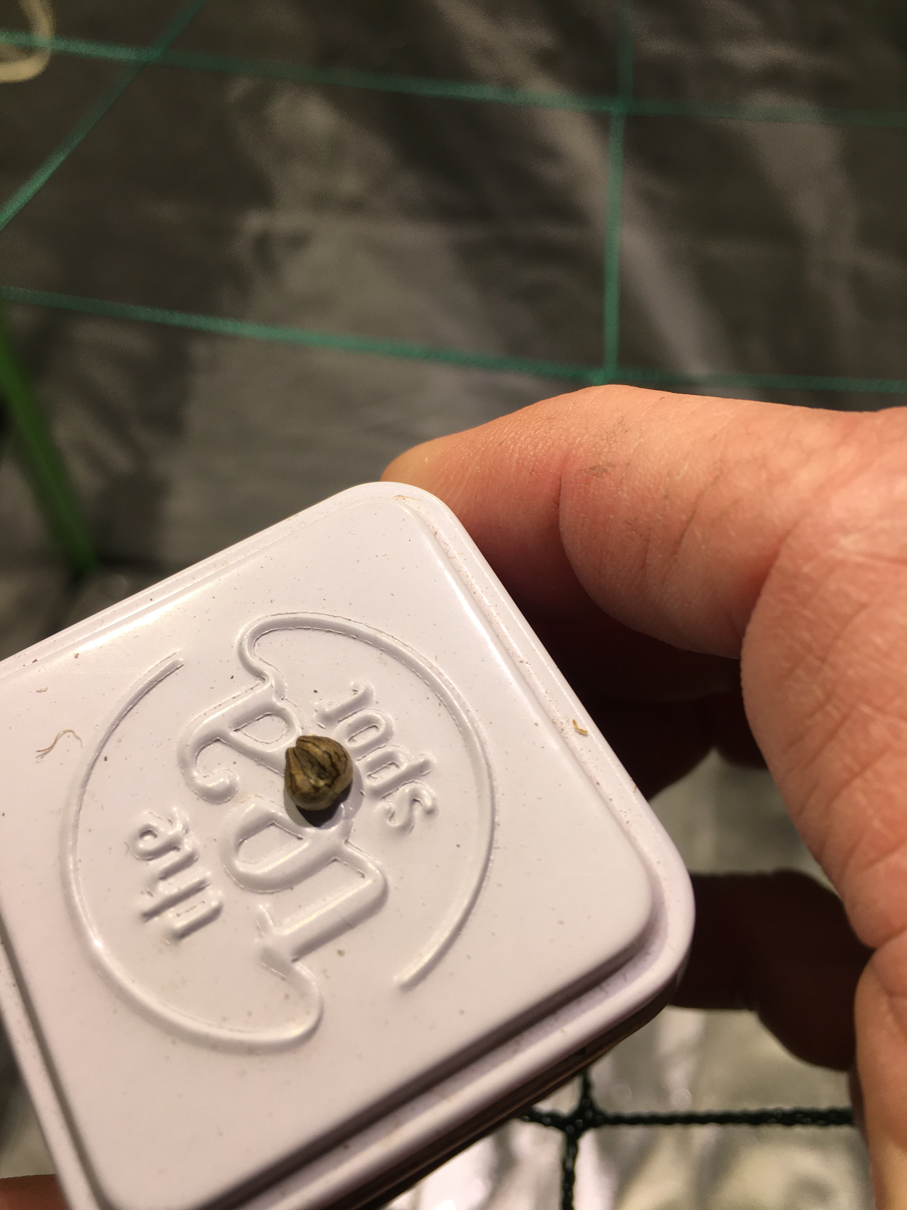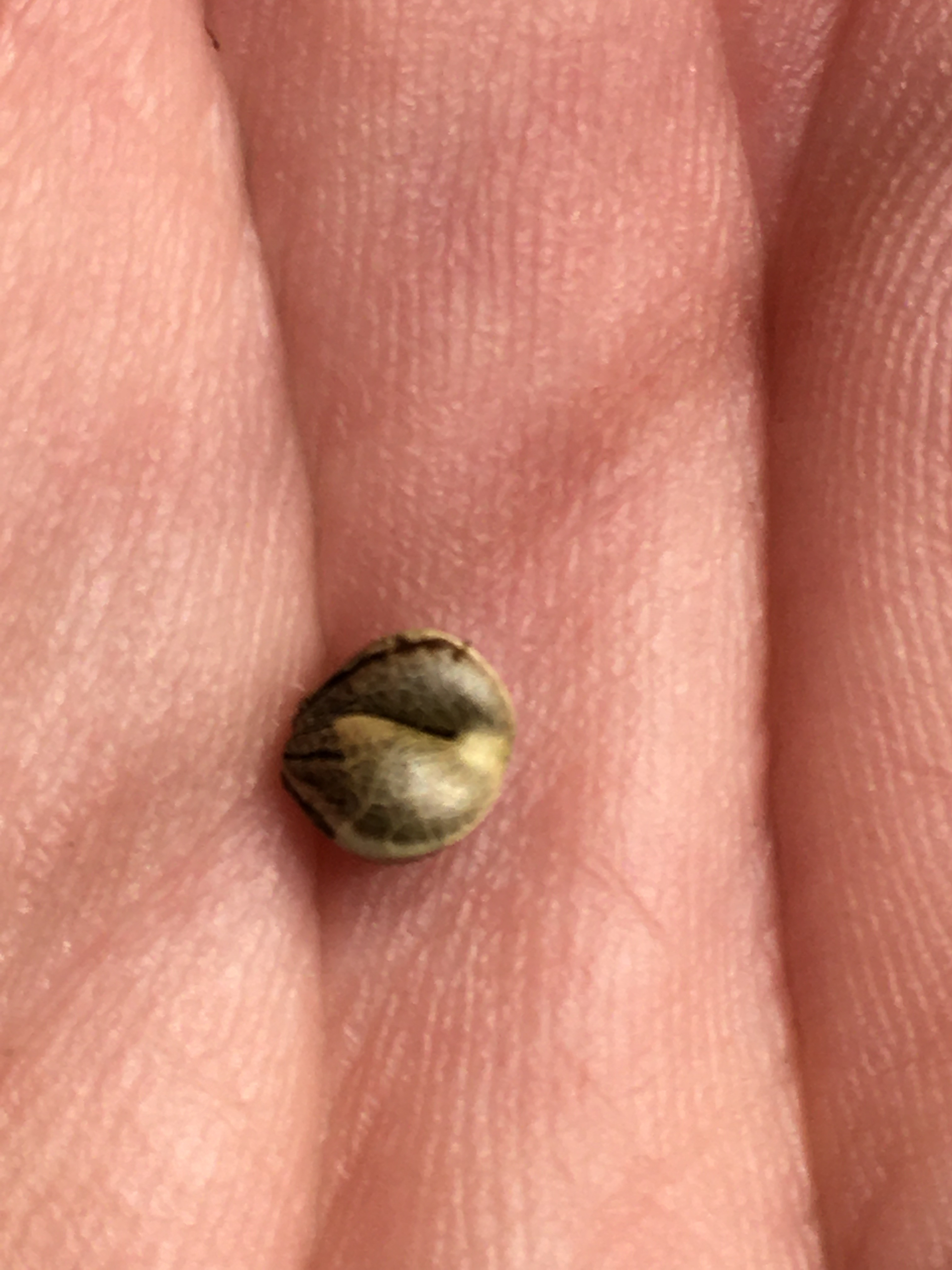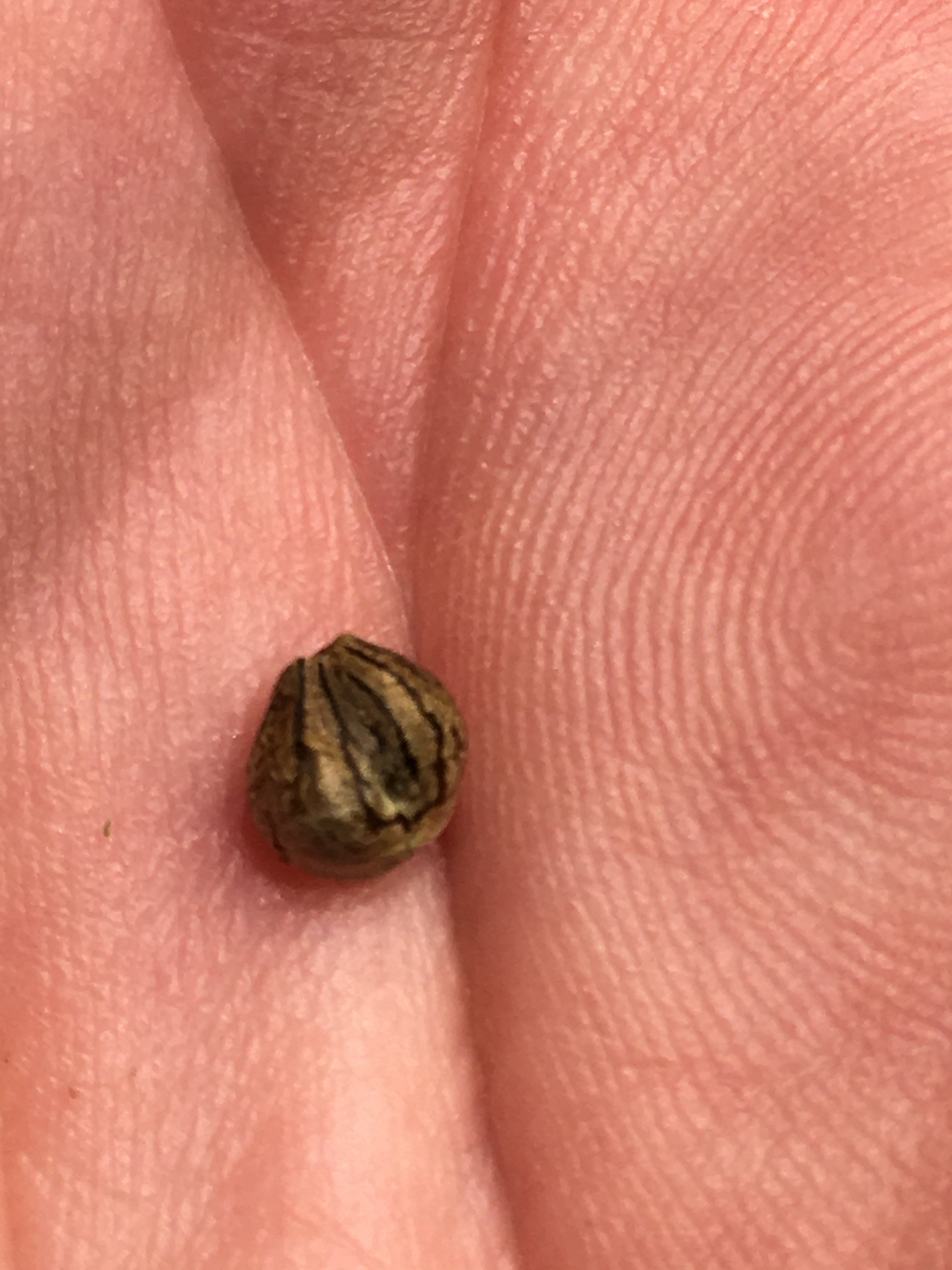 I was cleaning a bud from my drying Ghost Train Haze to see about how many viable seeds I could expect when I clean the rest of the bud. I got over a dozen good ones plus this freak: