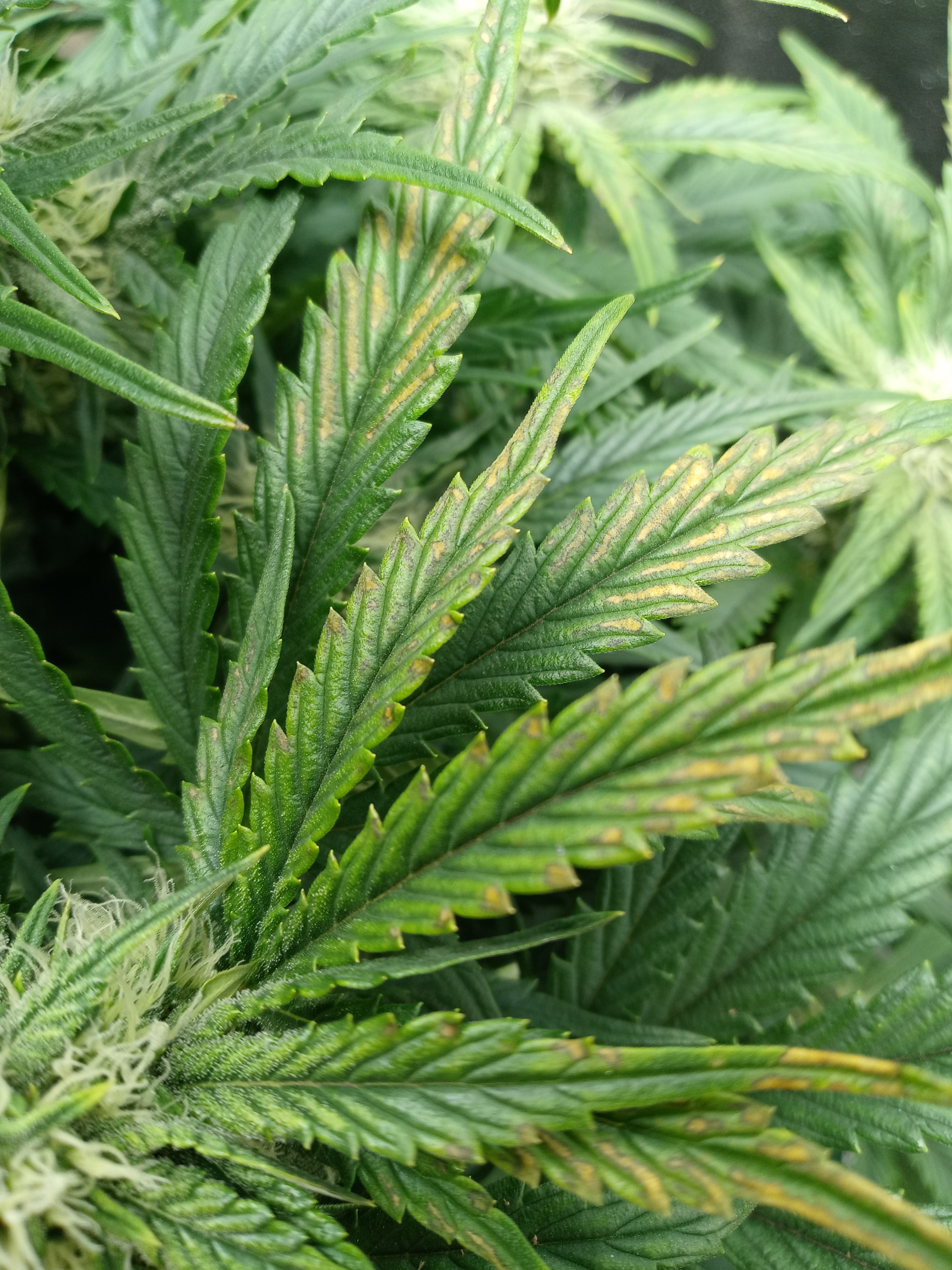 Hello all. Had some brown spots start showing up yesterday. Think I have a light burn issue and was just looking for a second opinion. Most of the leaves with brown spots are around the middle and top of the plant. Growing CDLCxSkywalker in a 5 gal fabric pot under a mars hydro tsl2000 LED with FFOF and trio of nutes, ph has been 6.3 to 6.8 and runoff been 5.7 to 6.5. I had started 3 other plants and thought they were stretching a bit so I lowered my light 4 inches or so but only left it lowered for about 12 hours or so. Lowered the light on monday I think. If I did burn her a little should I cut the brown leaves away or just leave them? Plant has been growing beautifully so I'm a bit frustrated I messed up but live and learn. Thanks for the help as always and happy growing.