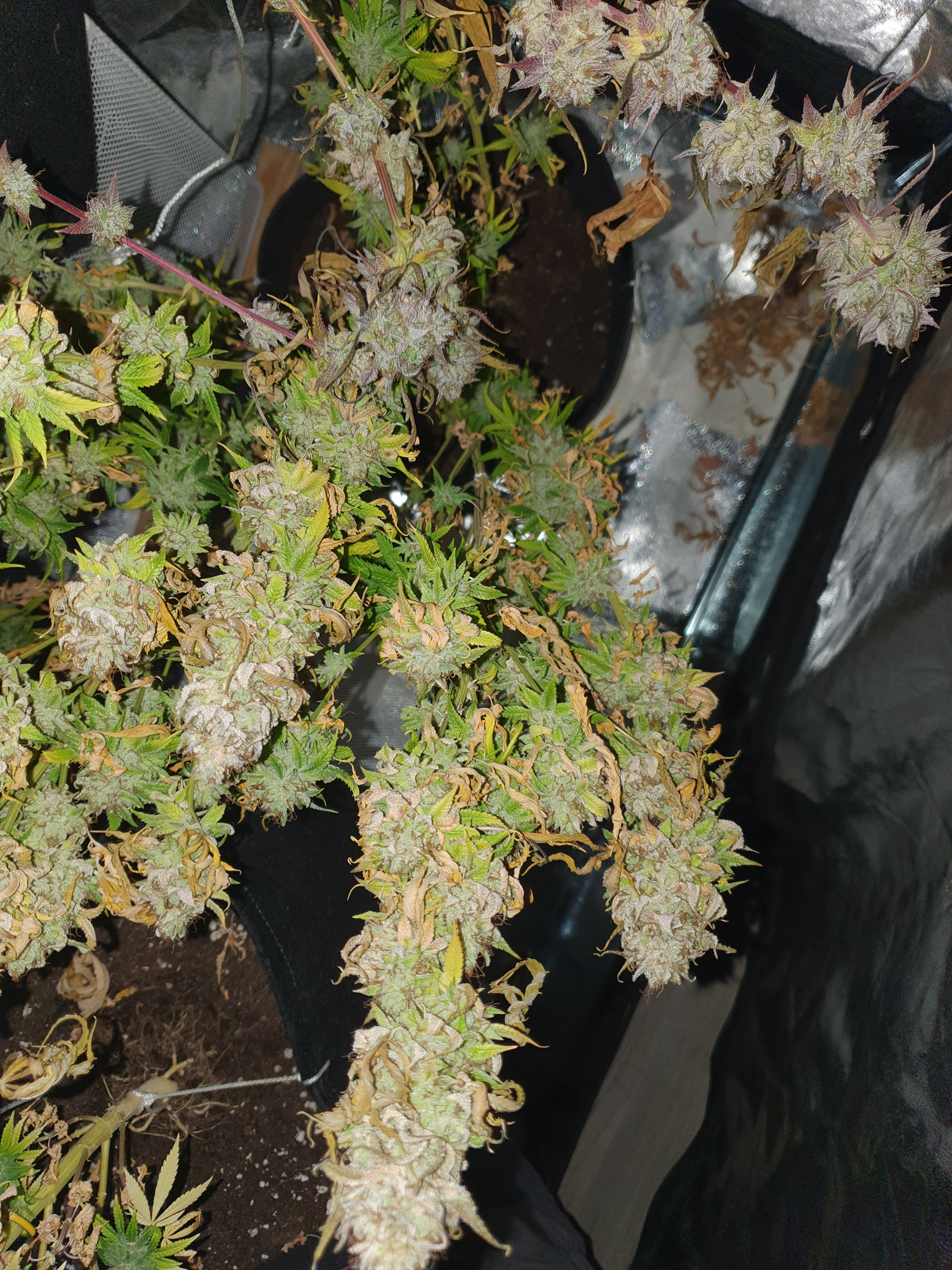 I don’t think 29 for a night would be a problem, depending on the genetics. I’ve had mine go that high and higher for much longer without a problem. If it is one or the other it is more likely water/root related (or bud rot but keep your fingers crossed it isn’t that because that can extremely quickly wipe out your harvest. With that said, you are using cloth pots and I think I see some wood under them to keep them out of any standing water so the pots should drain and dry quite well (don’t let water stand in the bottom regardless). How long has the wood been under them? Some wood is treated and I doubt it would be good for the plants - perhaps chemicals wicked up into the soil and finally reached the tipping point. How close are they to the snip? I would be thinking seriously about cutting my losses if there is a possibility it is bud rot. Where the leaves are all dead you might as well cut it and do an autopsy to see if there is rot because dead leaves won’t recover. If there isn’t any bud rot check the roots. You may be able to salvage the bud depending on what you find but don’t use bud with rot in it. If there is a lot of rrot you should cut and see if any is salvageable and when you are done, scour your tent to get rid of any possibility of leftover spores.