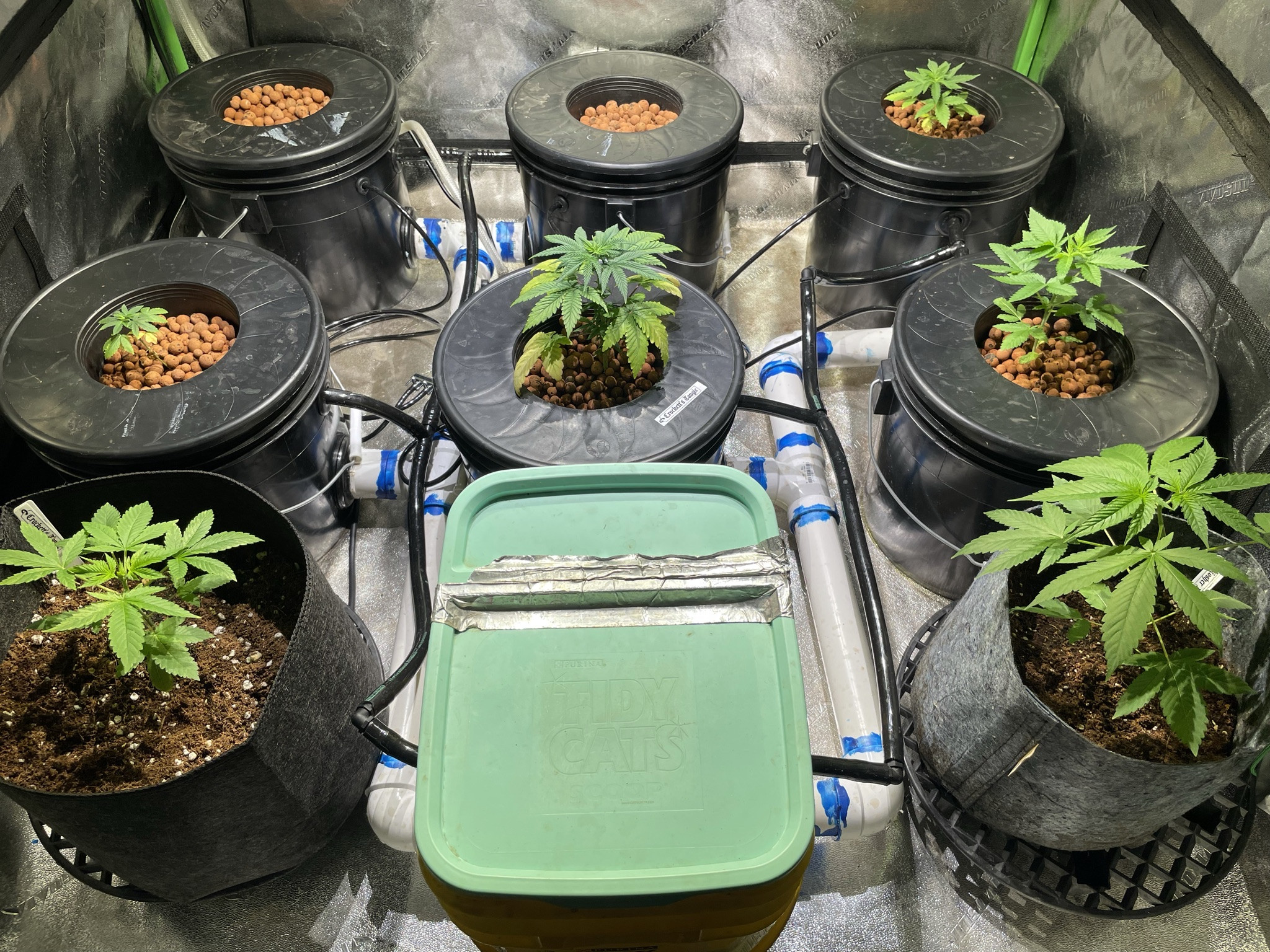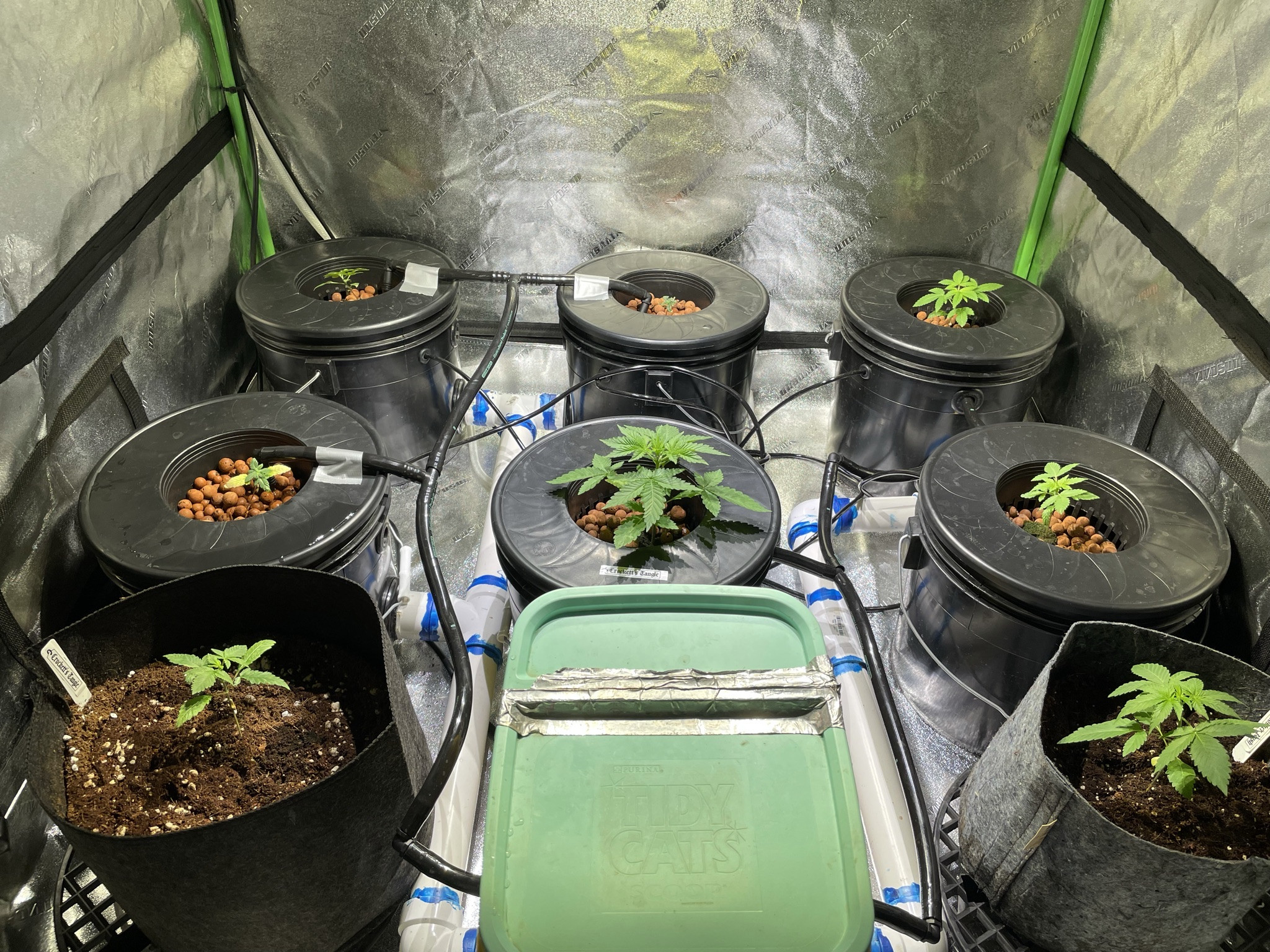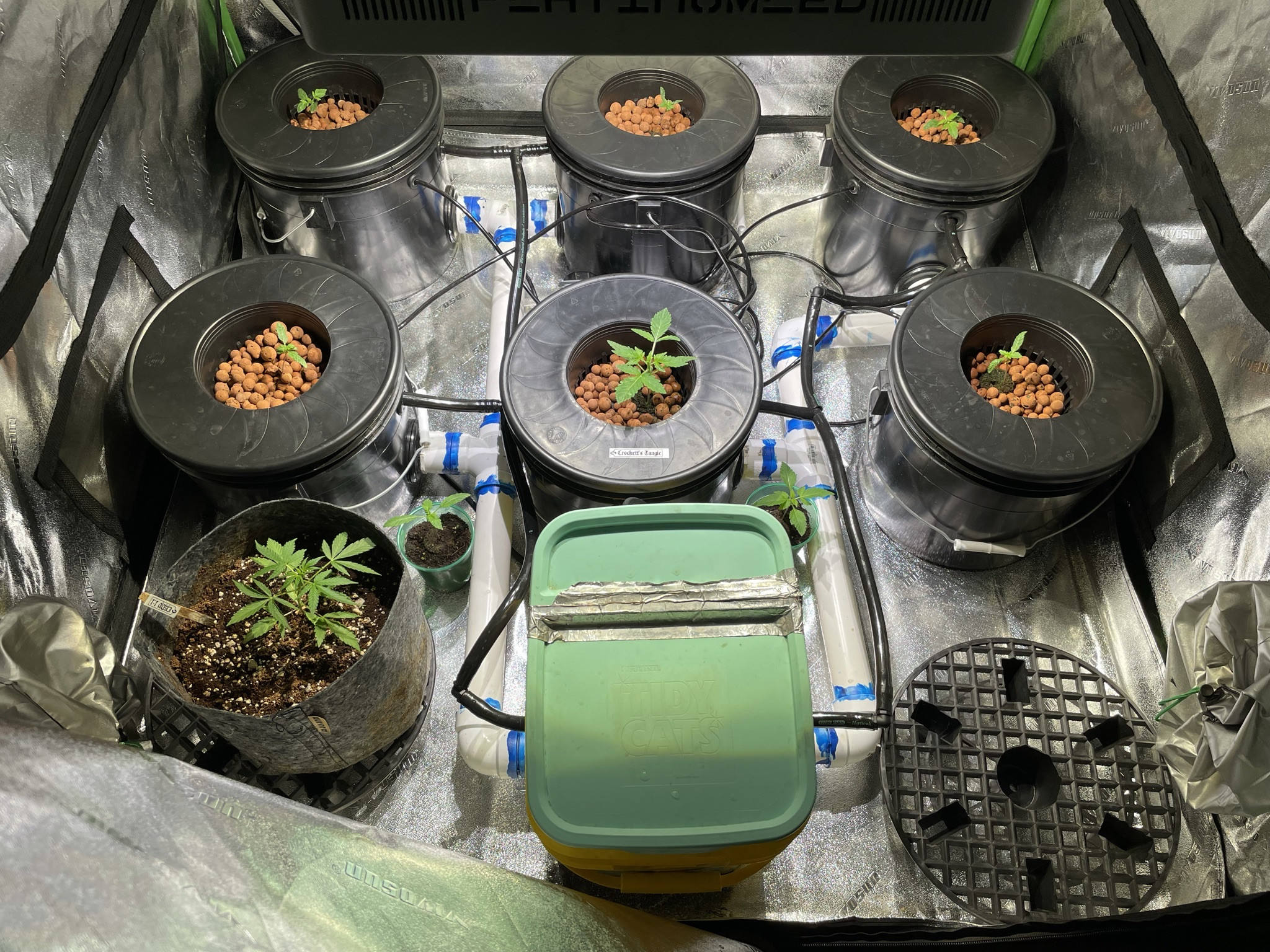 OK, now it's week one of veg! They are coming along unequally in hydro with one already having three nodes and another struggling a bit with crumpling new growth but they seem to be coming along. The two in coco are doing nicely, even looking strangely symmetrical from above after working with so many clones lately. I fed them Hydroguard and Soul nutes to about 1.0 EC and 5.8 pH this morning after flushing out the system a few times first. The bigger plant in coco at bottom left is a Seedsman CBDV 1:1 Auto taking up space here until the Purple Hazes next door (or would that be next flap?) are harvested. I can always move her back to my old 30x30 tent I've dubbed "Autozone" if I have to, but the lighting is better here. The one in the cup on the left is Tangie, one on the right is Kosher Kush. They will have to be transplanted sometime this week.