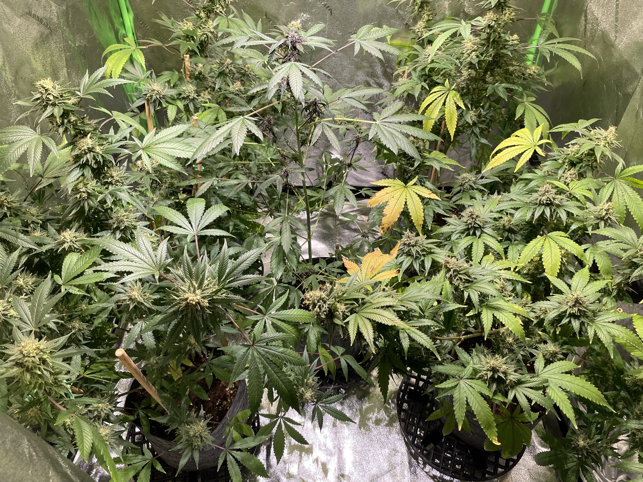 For extra shits and giggles, this is inside the new 4x4 tent I bought to flower out stuff in coco. The stuff in Autozone now should be here in a few weeks. Then I can start seeds in the Autozone tent for Super Lemon Haze or Lavender and other fems that have been waiting their turn. I have four Purple Haze clones a week or so from chop and a Seedsman Pink Kush CBD auto in the center. I like the way she put on the purpling without cold temps. The PHs are the first ones I've grown out in coco with LST via bamboo sticks and soft garden wire plus a local product called Cannabenders which are strapped to the stems when they are very young to flatten out the profile and trigger the branches to make more and bigger buds. PH is always a nice producer but this is going to be massive.