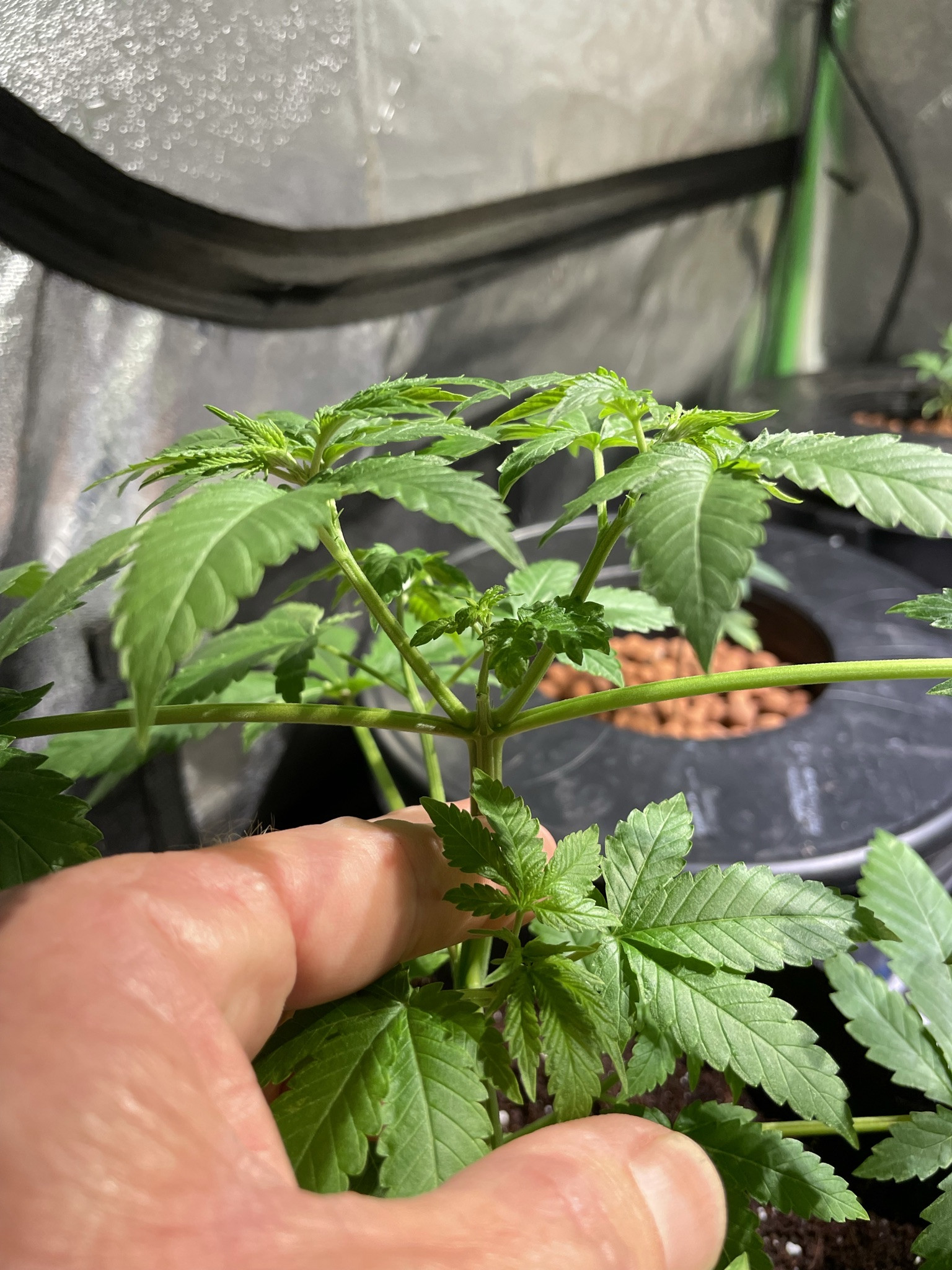 Week 4 of veg and all six Tangies in hydro continue to bounce back. I've still had to scour and strain out crap yesterday at feeding and today I went a bit deeper today, cleaning the airstones and pump filter once again before another peroxide treatment. I've topped the two in coco, and it looks like I accidentally fimmed the Kosher Kush and almost did the same to the Tangie. KK has four tops now and Tangie has three! KK has bamboo stakes to tie the tops to once they grow out enough and Tangie will get the same soon.