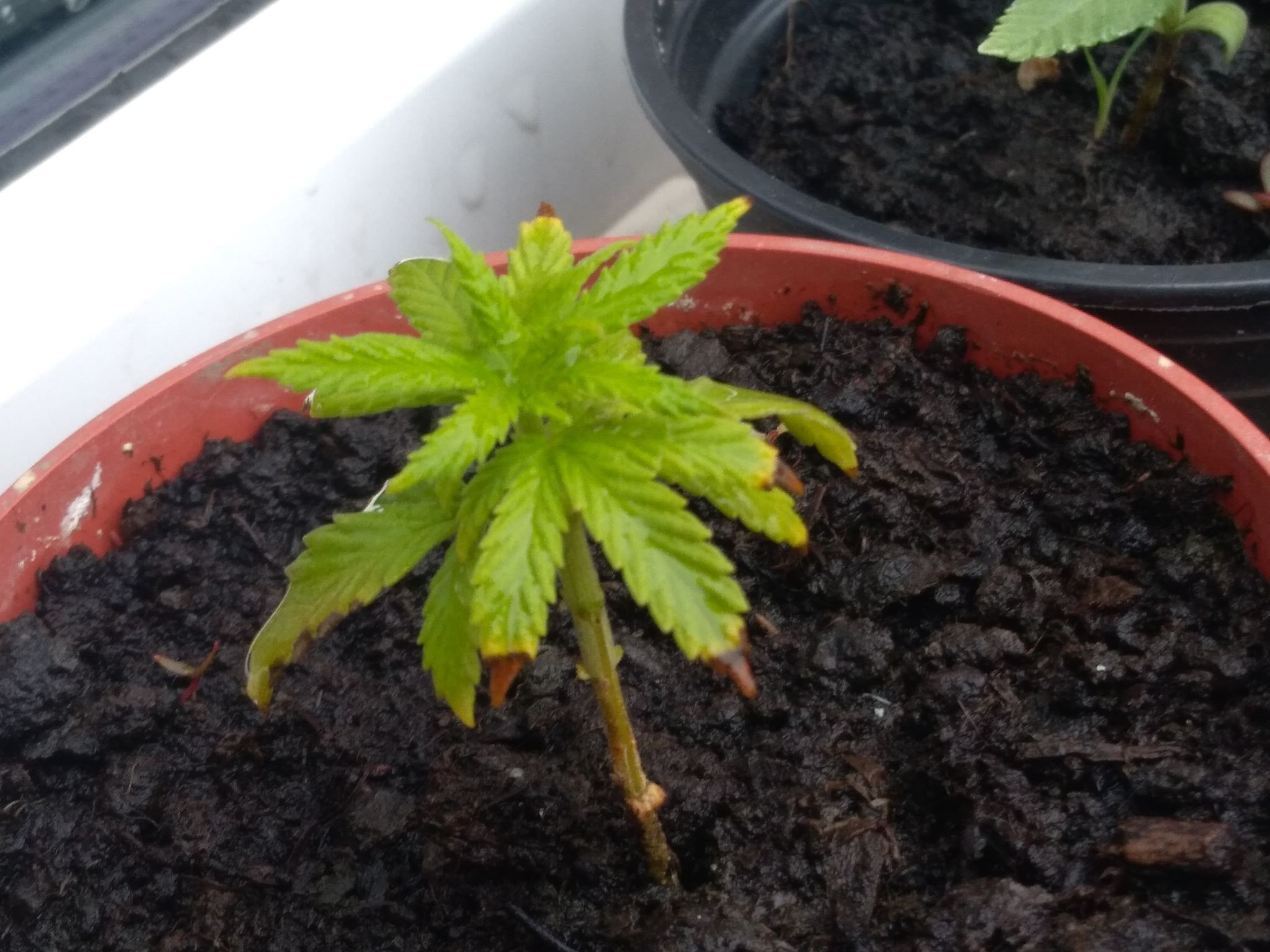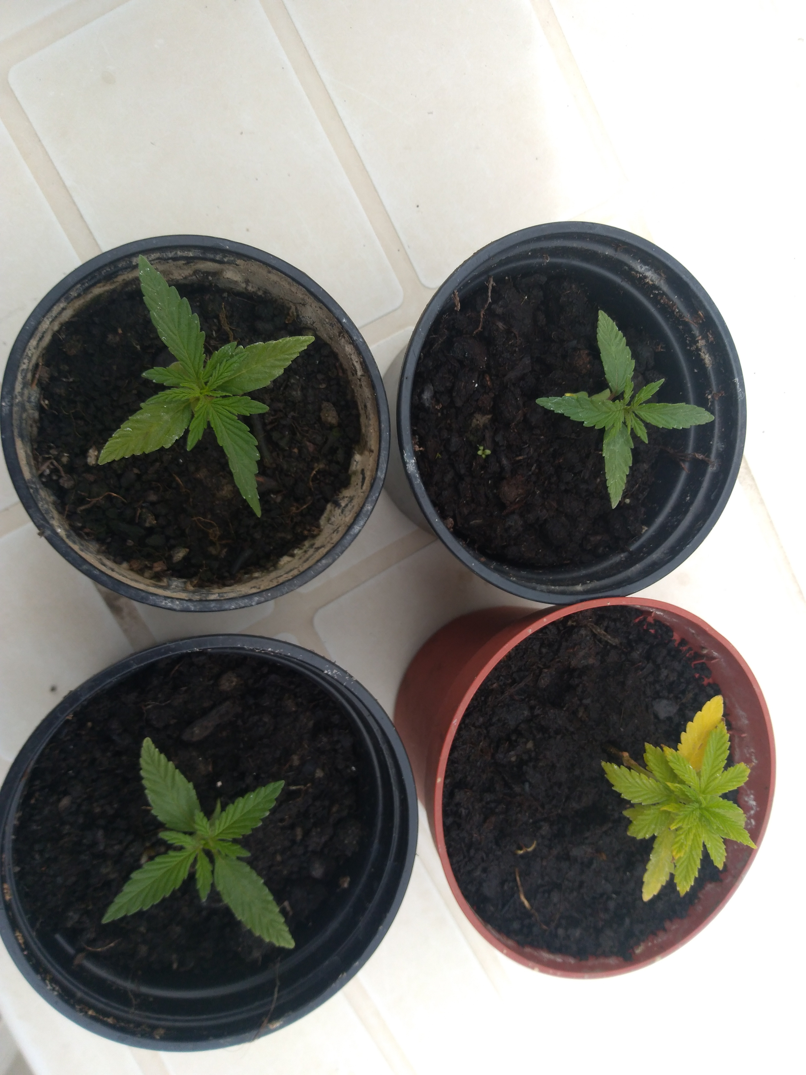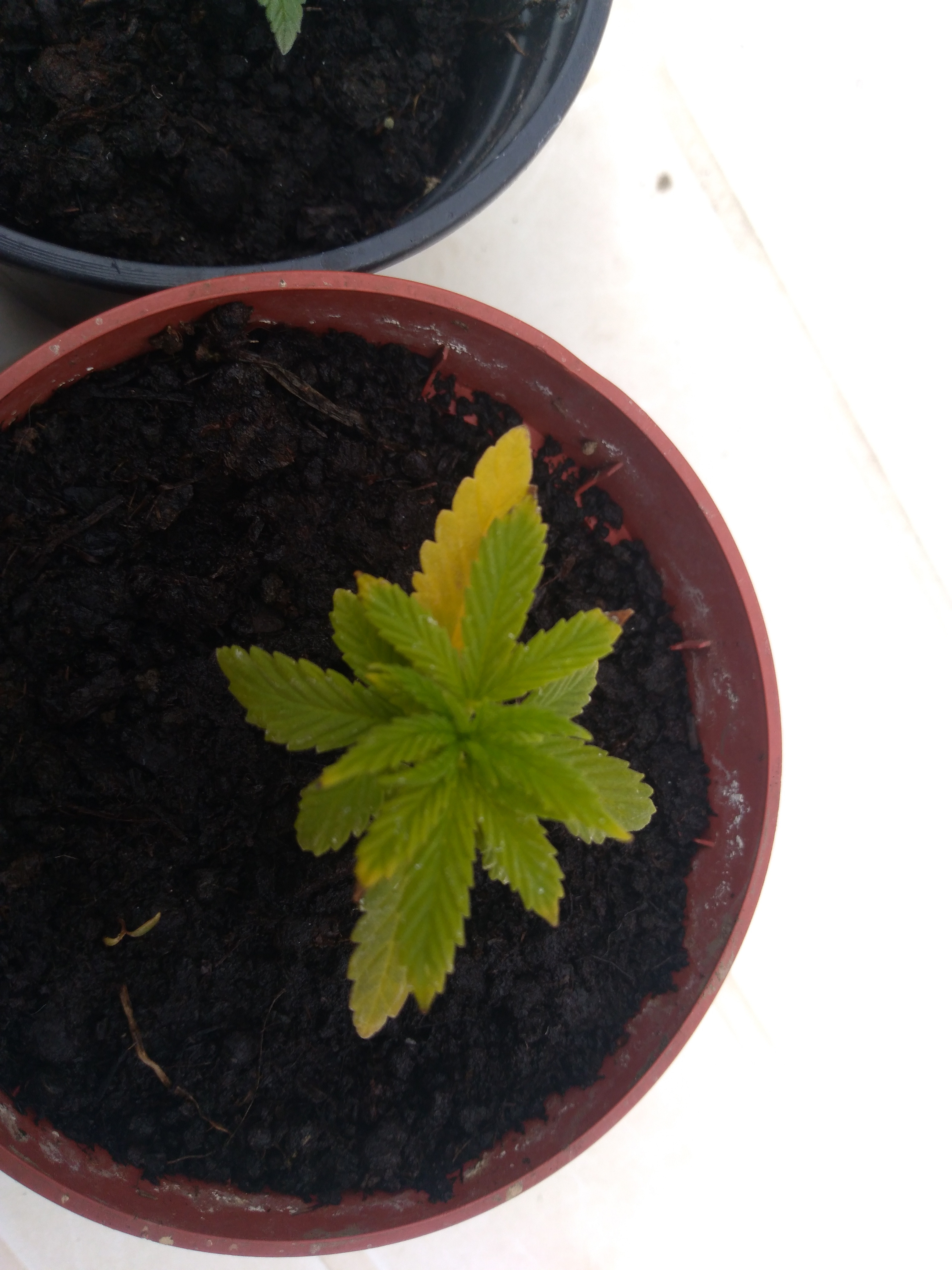 Hello. All 4 seedlings are same strain skunk xl from last year. One that grows fastest has brighter leaves and brown tips.they are all in same soil. And there are some white marks also. Have no idea if its possibly powder mildew because they are so small