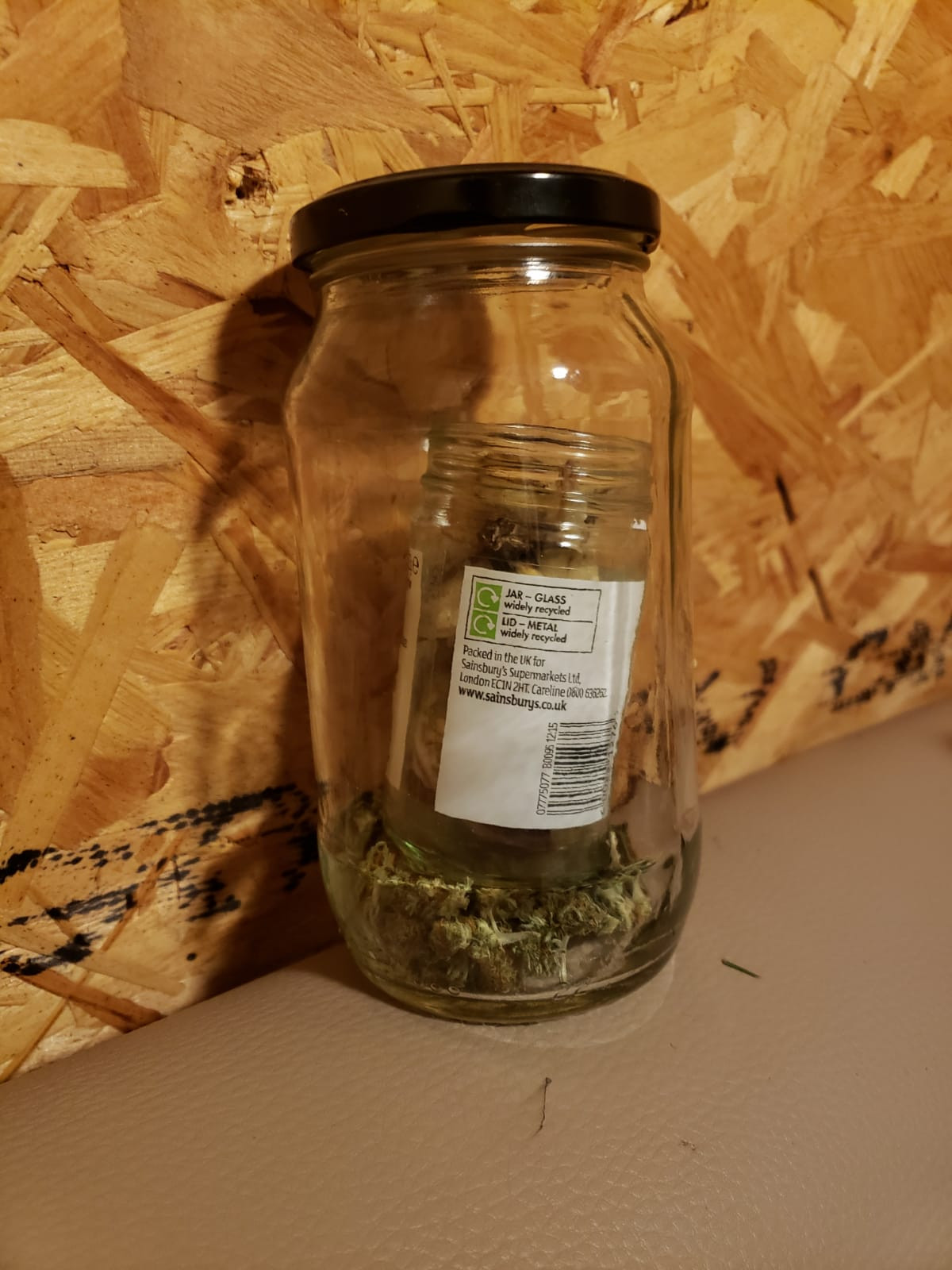 I put about 10 sq cm of banana peel into a small glass jar with the lid open, I then placed that jar in another jar (old jam jar, smaller than my usual curing jars to keep the ratio of air to bud in there similar). This way the banana peel was not in direct contact with the bud, I didn't want the inside of the old banana peel to touch the weed and start it actually rotting.
