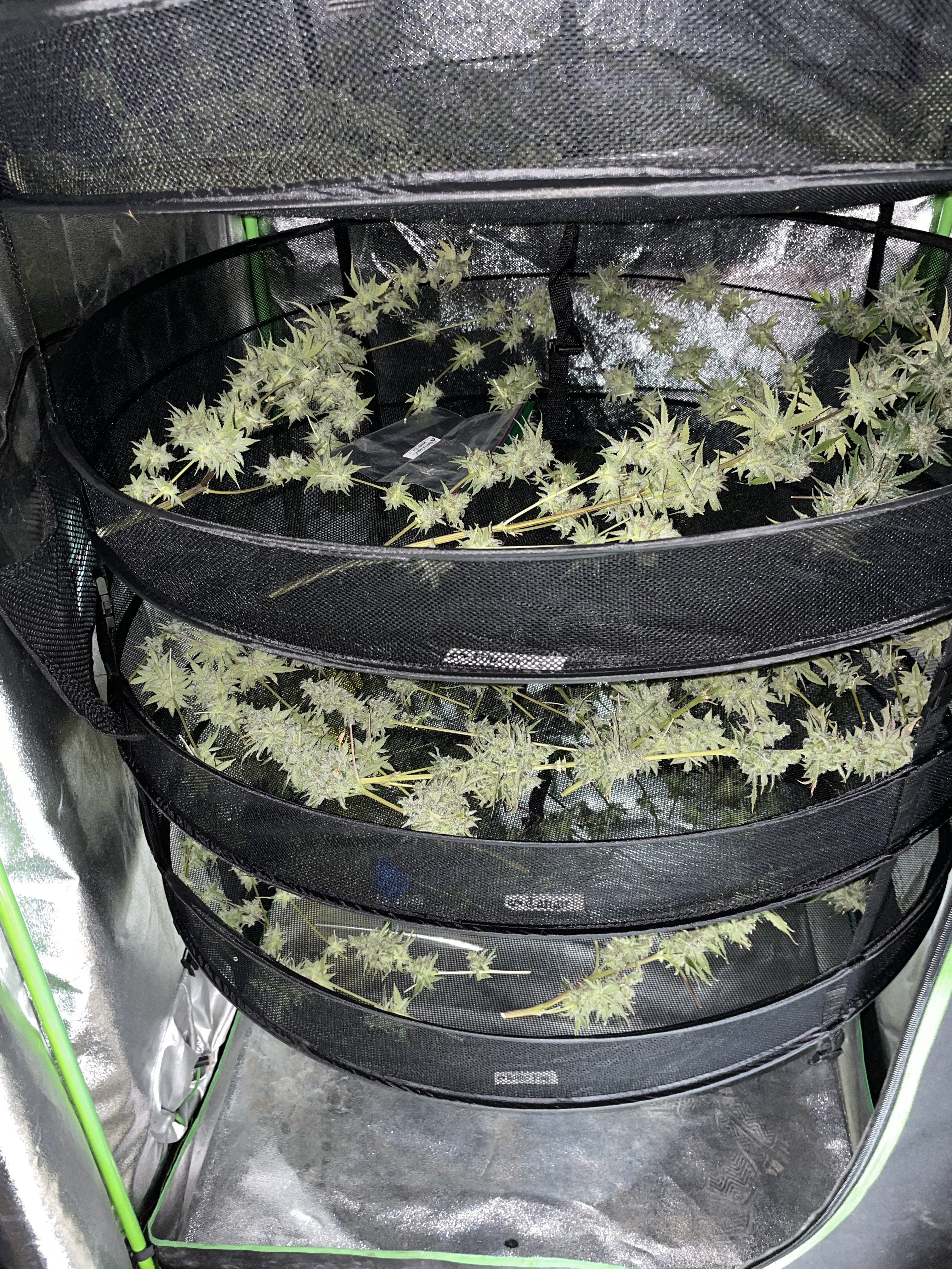 You can't really see much of the produce from this tent because they are on the top rack for the sake of easy seed collection. I can bounce the buds around then poke my finger into the mesh and all the seeds roll into that one spot. Below that is the Blueberry grown out for bud then Tangie and Kosher Kush.