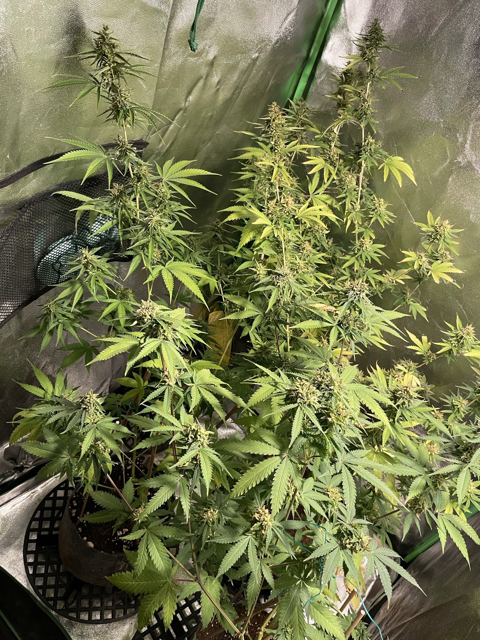 4x4 tent, Platinum LED P4-XML2, four Patio Pickers. Vegging Super Lemon Haze, Durban Poison and two Tangie x Blueberry crosses.
