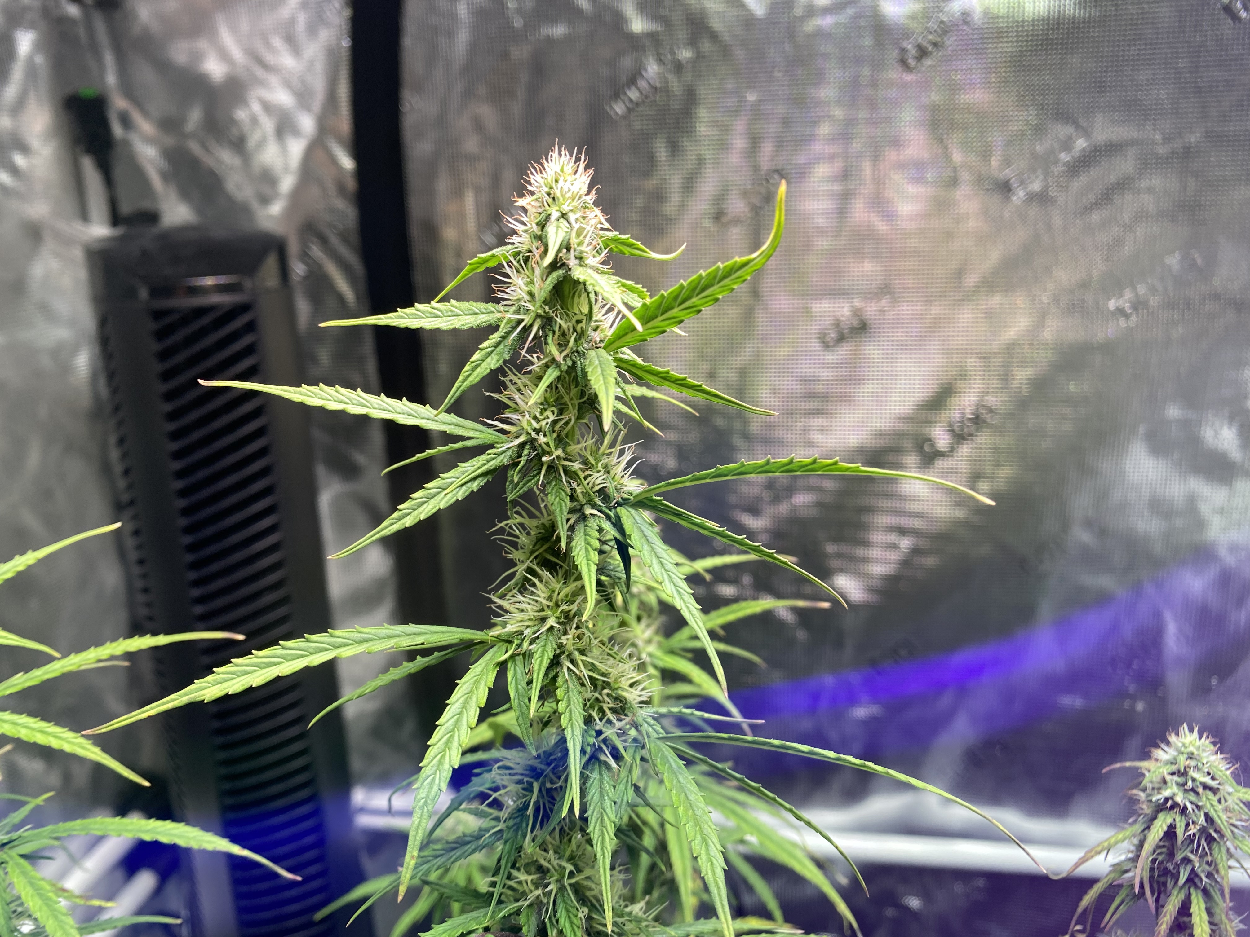 Ventilation: 8” system with 710 CFM fan pulling through two separate large carbon filters (one tail end and one inline) through very long duct work, resulting in a nice breeze coming out in an adjacent room, and tent walls sucking in decently but not extremely hard