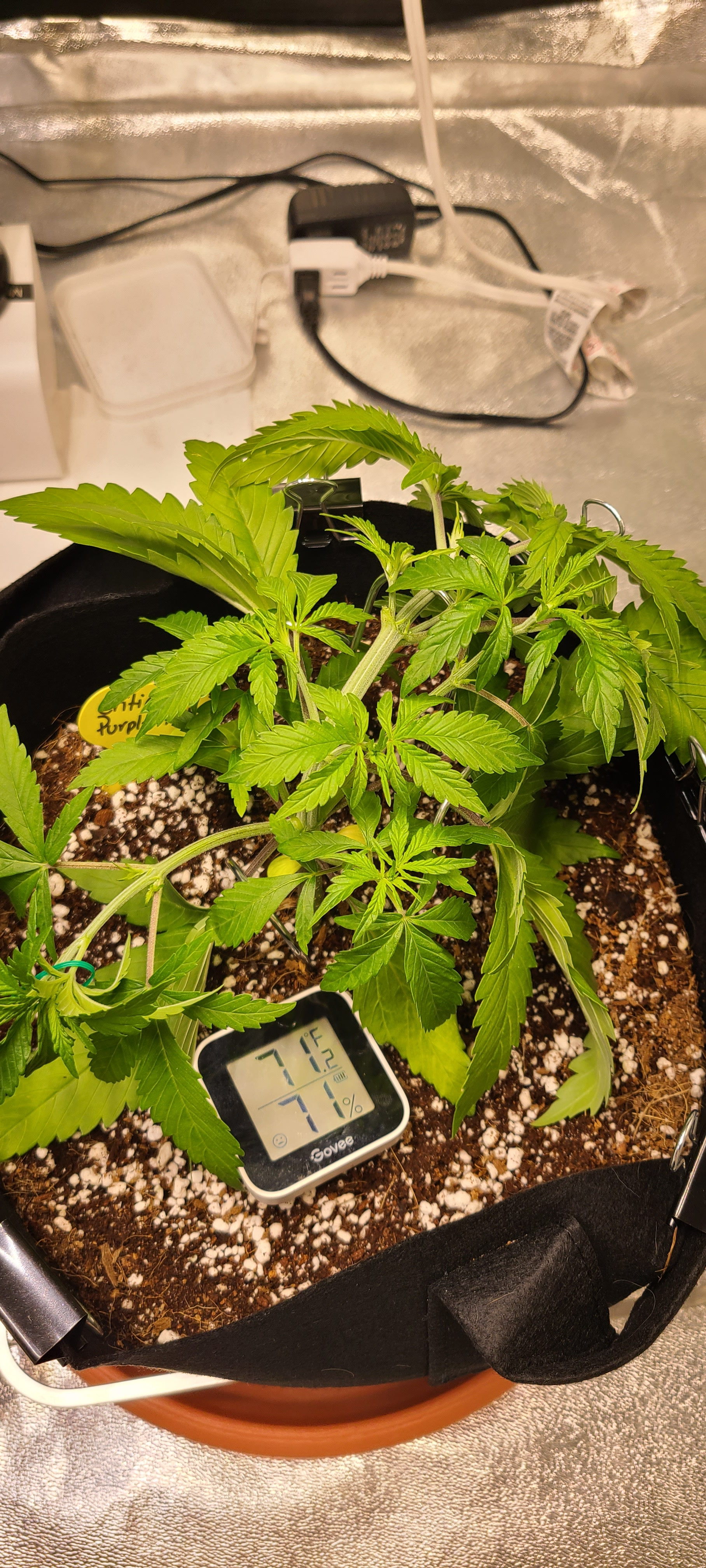 I wish I could tell you. I want to train Chewy, splay it out, just not sure about a few things, I need to read up. It's looking the best of the three and the youngest, easiest to work with ... if they're ever easy. I just fold and tuck leaves that are blocking buds, on the other two plants. I want to do BU2B's version, mine are all in flower or preflower already. I'm going to work with Chewy the most. The other two will have to tell me what they want to do. My AC hasn't quit running for a few hours and it's going to get hotter this weekend. New ceiling exhaust fan is on the way here, nephew's going to look to see if I can run ducting to the eaves toward the west, it's only a couple feet from the attic opening in the closet. Your RH looks high in one pic, 71%, was that early morning? They're growing fast.