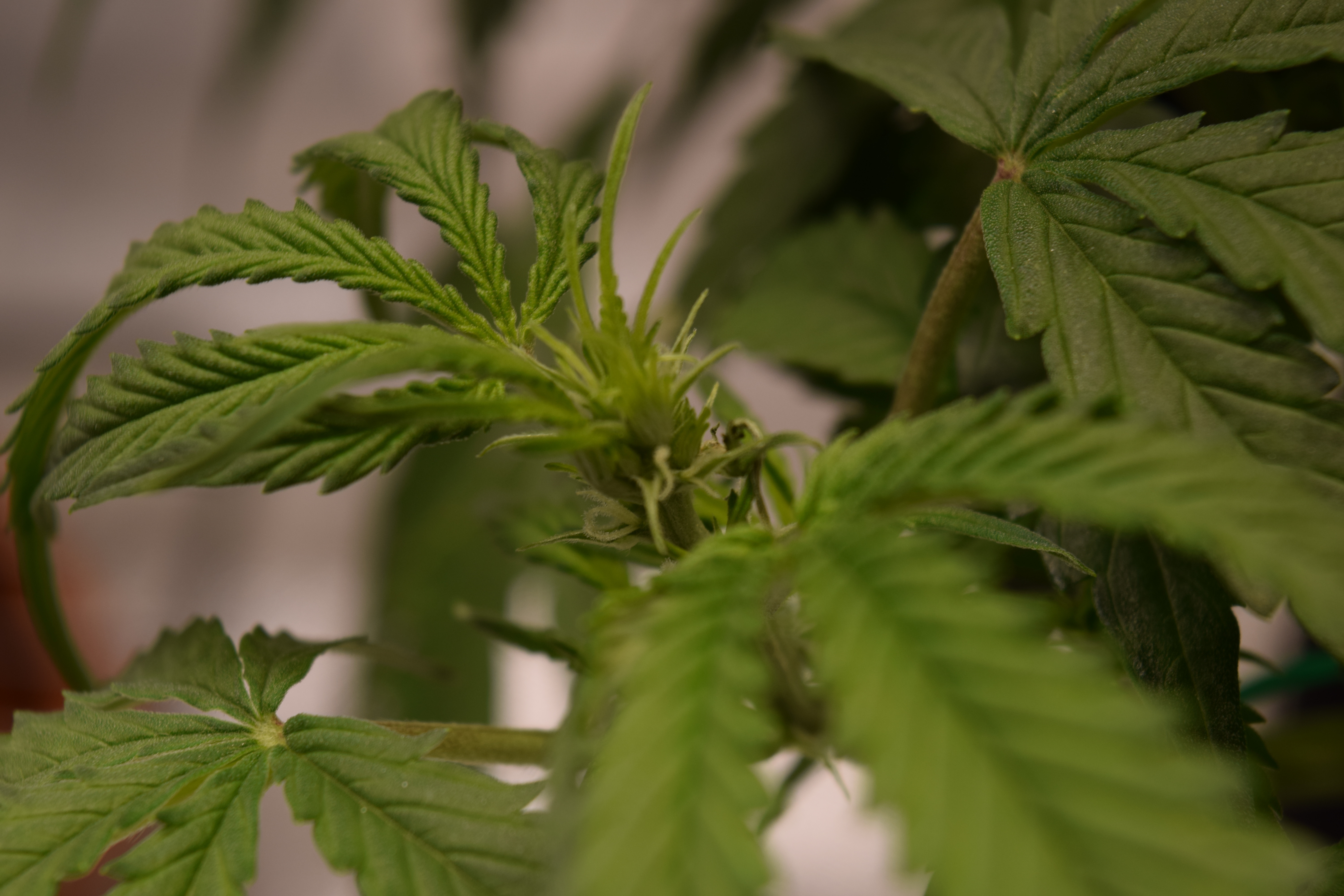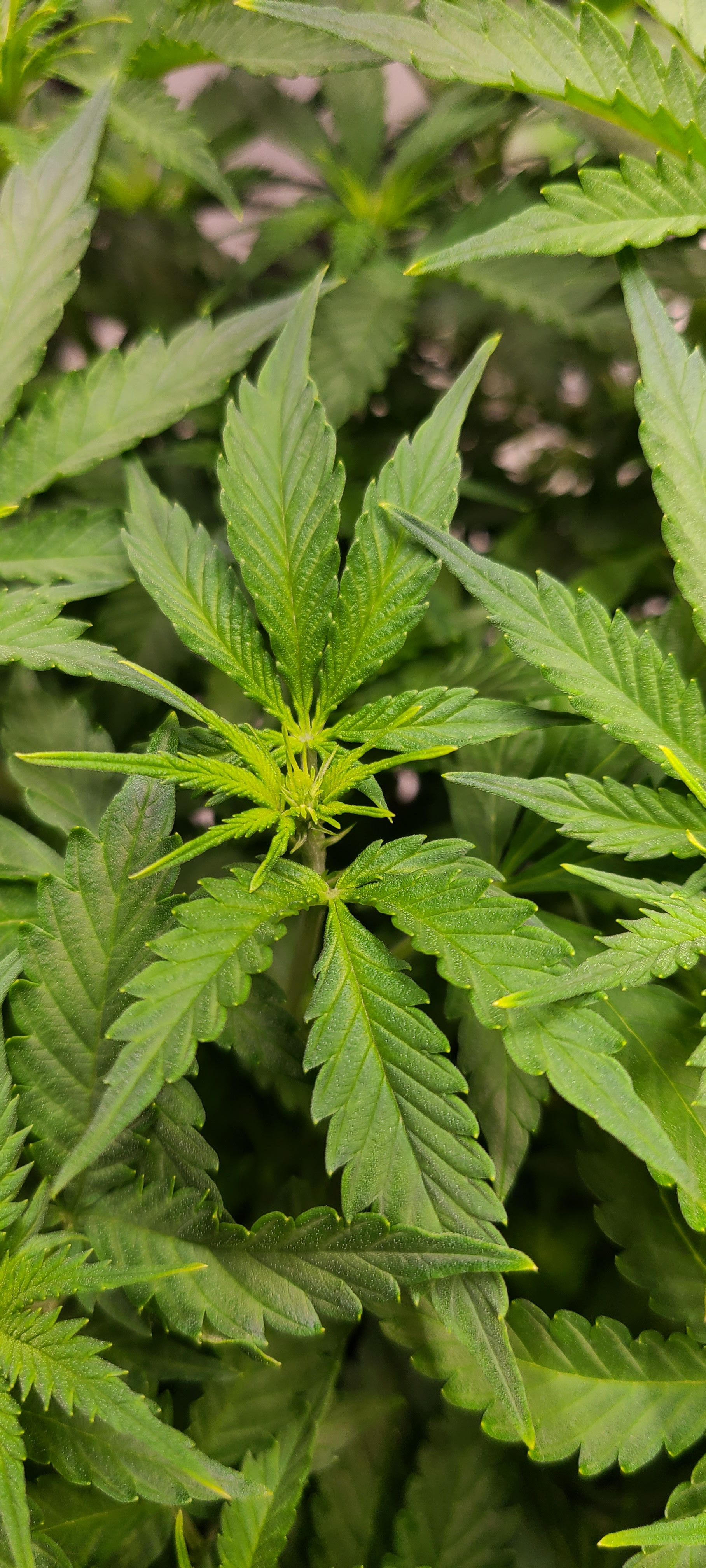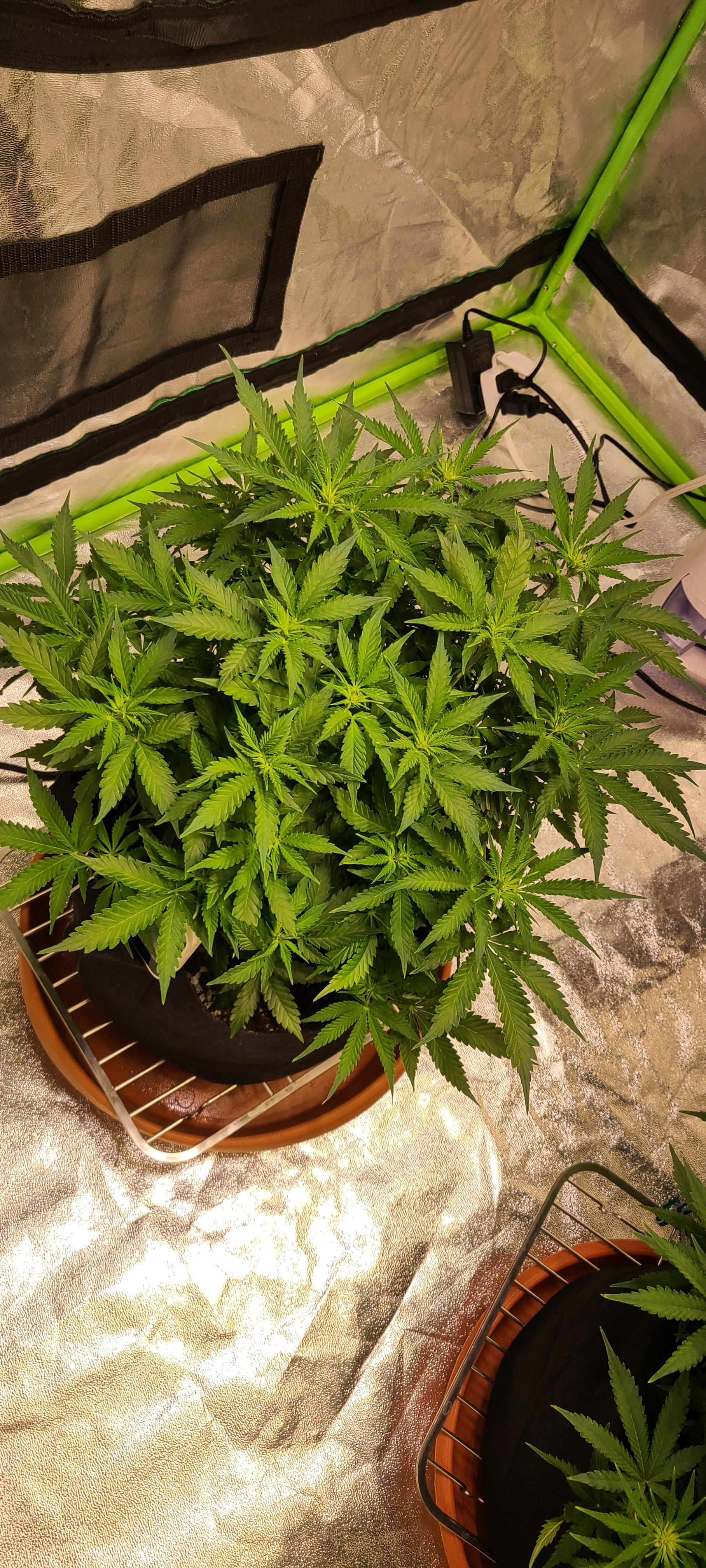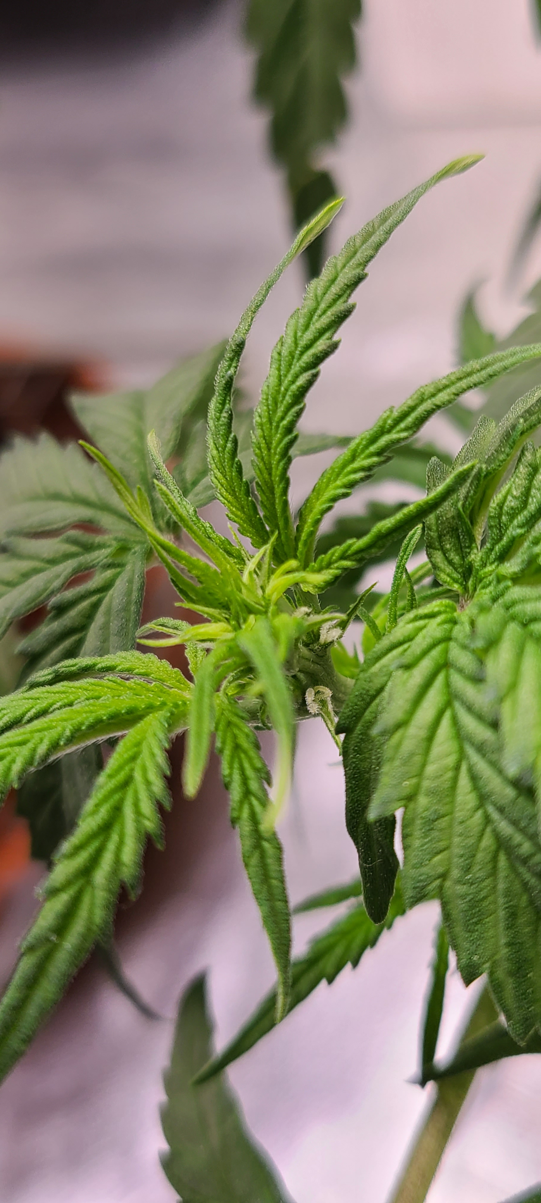 I decided to water them 2 qts each at 4am this morning. Ive decided to follow the aggressive veg recommend nutes on the GH Flora series. Removed some fan leaves from both plants this morning, hopefully making way for air and light to reach the growth tips without hurting my babies too much.