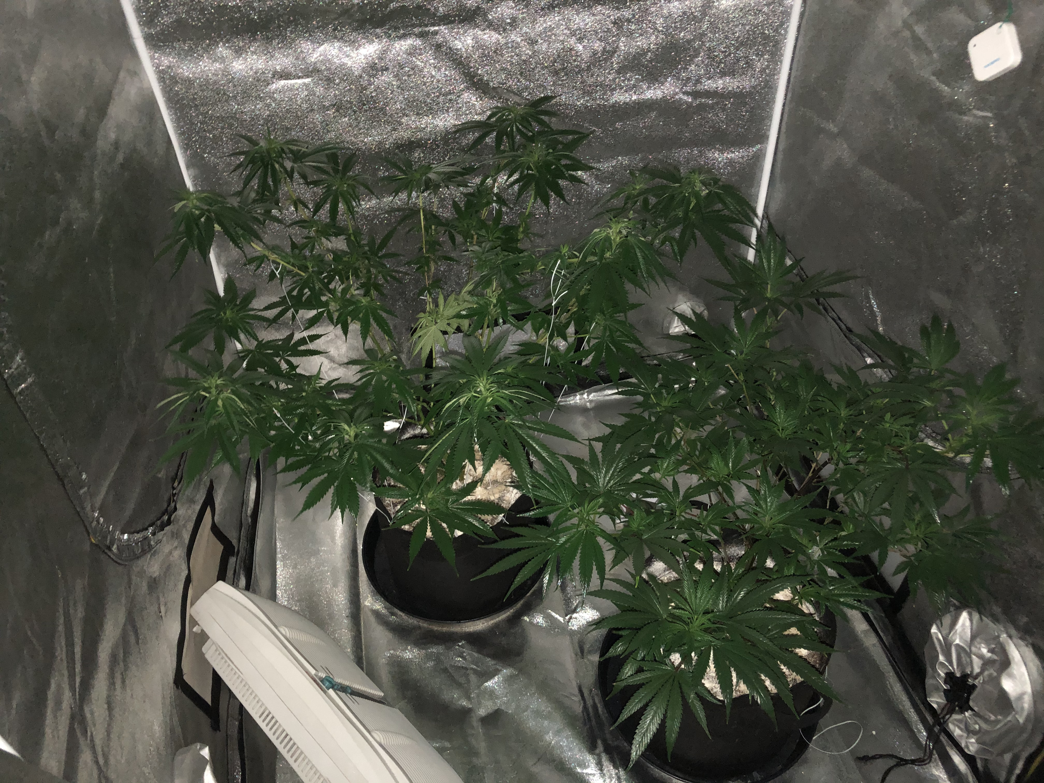 “WC” is in the 4x4 still with more room to grow, and the “GOD” is in the 3x3 filling it out nicely. Had to re-adjust the trellis net and add another to the 3x3, and get everything settled and ready for the flip. Sprayed again last night with sodium bicarbonate (baking soda). Will continue to spray, but also looking into spraying with pure tea tree oil mixed in water (I’m still researching this method, but reading great results! Anyone try this? I’d love to hear how it’s worked for you or any feedback, as there isn’t much on it yet in forums)