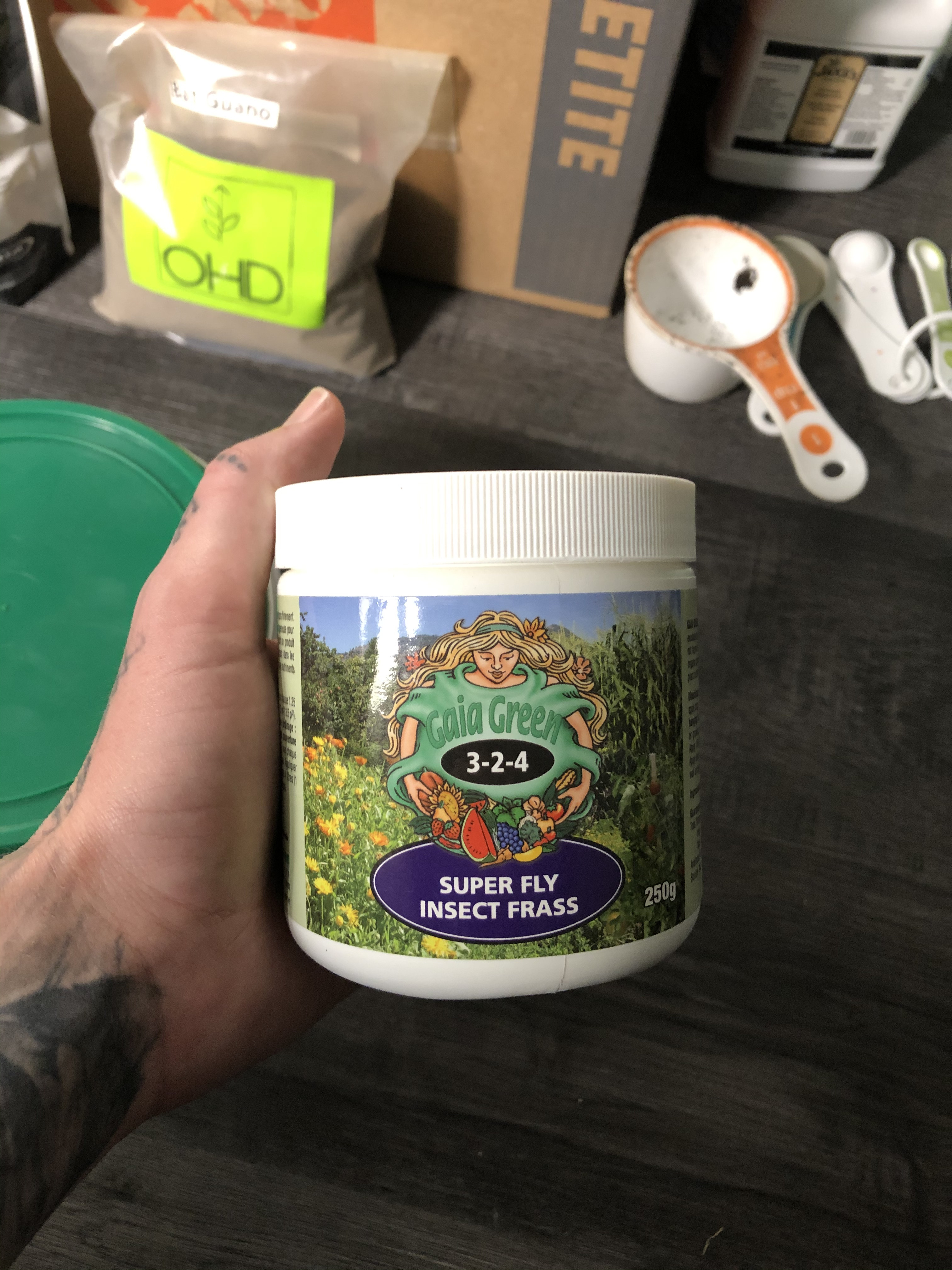 After that finished brewing, I put 2 Cups of EWC, 2 TBSP of Bloom 2-8-4, 1/2 TBSP of Insect Frass, and 1/4 TBSP of mycorrhizae Fungi onto the topsoil of each, and scratched it in making sure to mix thoroughly. Watered in with the compost tea to get the soil alive and thriving with the good stuff!