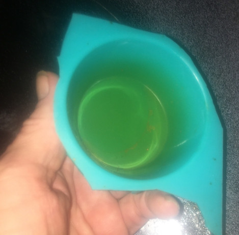 When the oil comes out of the distiller it still has enough ethanol in it that I can pour it into the silicon cupcake baking liner. That cupcake liner (food grade silicon) is moved to the warming pad on the stove.