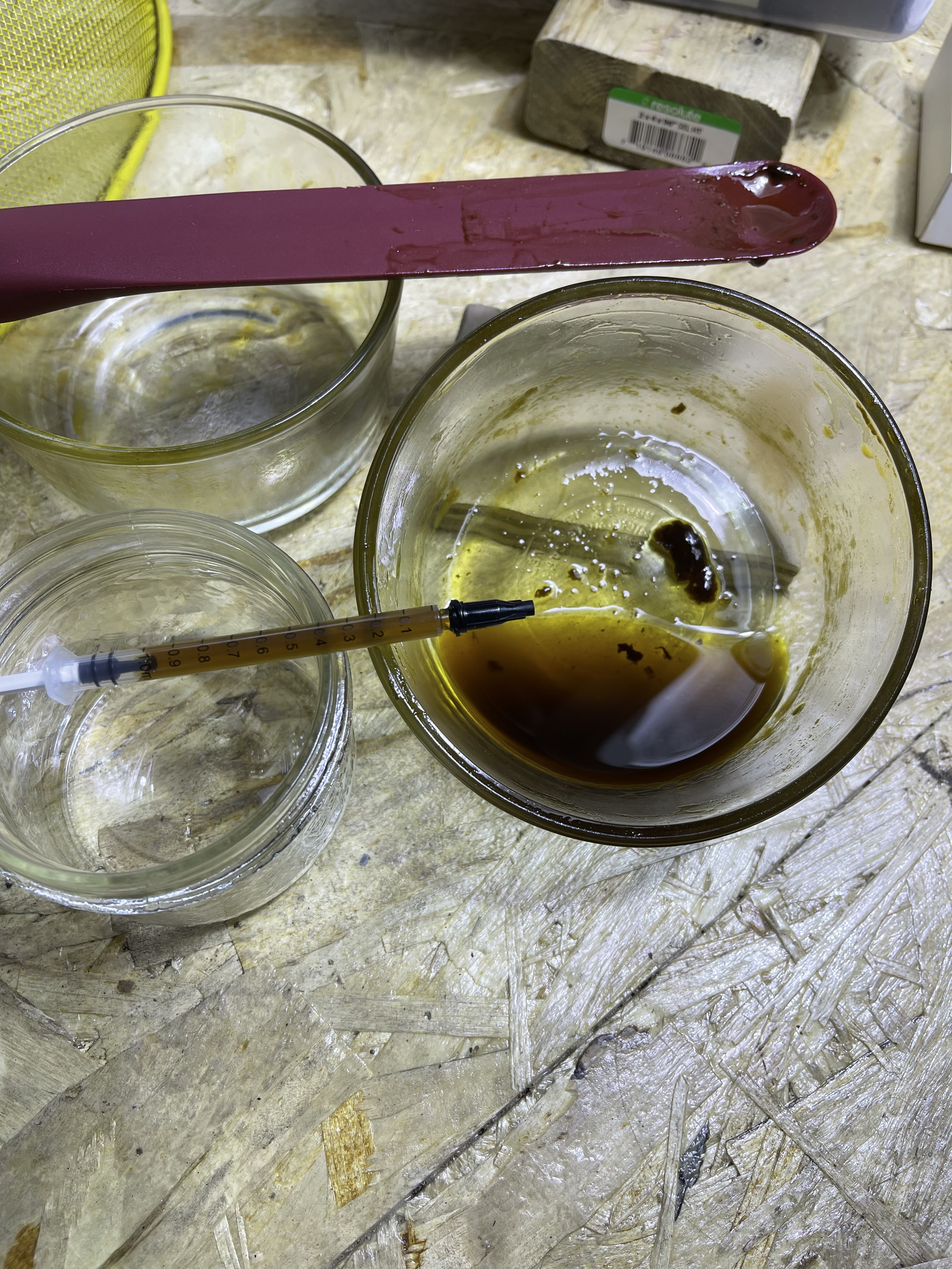 The Bad: The dish with the oil mix (the greener second wash) had a couple larger size clumps of sticky dark stuff that didn’t want to mix into the oil. Since they were larger I could work around them and suck clump free oil into the syringes. The other dish (the golden first wash) had much smaller gritty looking clumps that didn’t want to completely mix into the alcohol so I had to suck them into the syringes in the tincture. They are fine enough that if you don’t look close it just looks cloudy. I am hoping it will go into solution over time. I ran out of syringes and still had some of the oil mixture with black clumpy stuff left so I decided to experiment by putting a half capful of ethanol in it as well as the canola and gave it a stir - the clumps went completely into solution, which didn’t happen with either just canola or just ethanol added. Maybe some possibilities there.