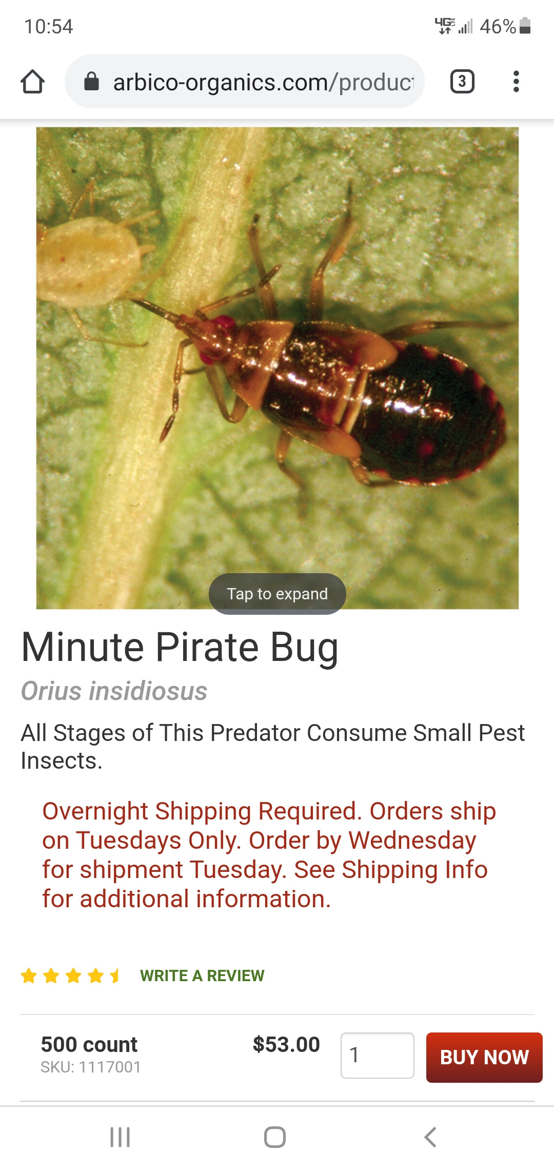 Lady bugs work well too Pirates are faster acting. Stay away from neem oil if your girls are in flower. Neem oil sprayed during flower sent our friend Farmbuck on a downward spiral. Nothing I'm willing to try. I'm a big advocate of using 100% natural means of eradication. Good luck to you growfriend. I'm gonna be ordering a metric ass ton for my greenhouse. The love all tbr garden flowers I have in there.