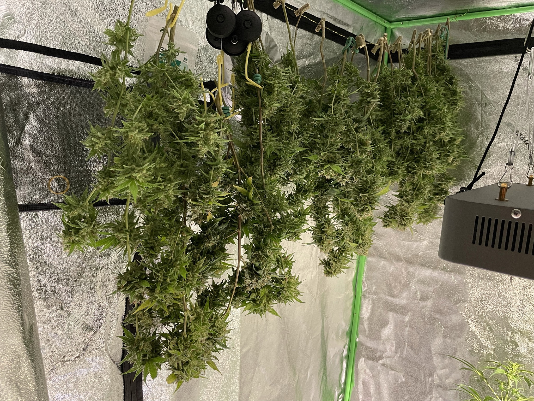 Yesterday, I cut down four short but stupidly productive Purple Haze (ILGM) plants. They are cuttings from the PH mom I flowered out months ago (the one that actually turned purple). Mom was too big for the tent I was using so I cut her back and couldn't bear to waste the cuttings, so I rooted them and put them in the newest tent instead of the copious feminized seeds I planned for it. I used a local invention called Cannabenders to spread them out then tied those branches to bamboo stakes to keep them spread. Purple Haze has always been a good producer but this was nuts. There was practically no popcorn produced by any of these girls. The biggest buds are about fist-sized and the smallest about as big as ping pong balls. I didn't really get the color this time but I was able to let them go as long as they needed with fans turning yellow and dropping during this last week. The bud is frostier than any other of my PH grows yet. I've had to split the drying of all this bud between two tents since pics were taken to avoid mildew with so many colas hanging shoulder to shoulder. In short, my Christmas shopping for the year is likely complete now.