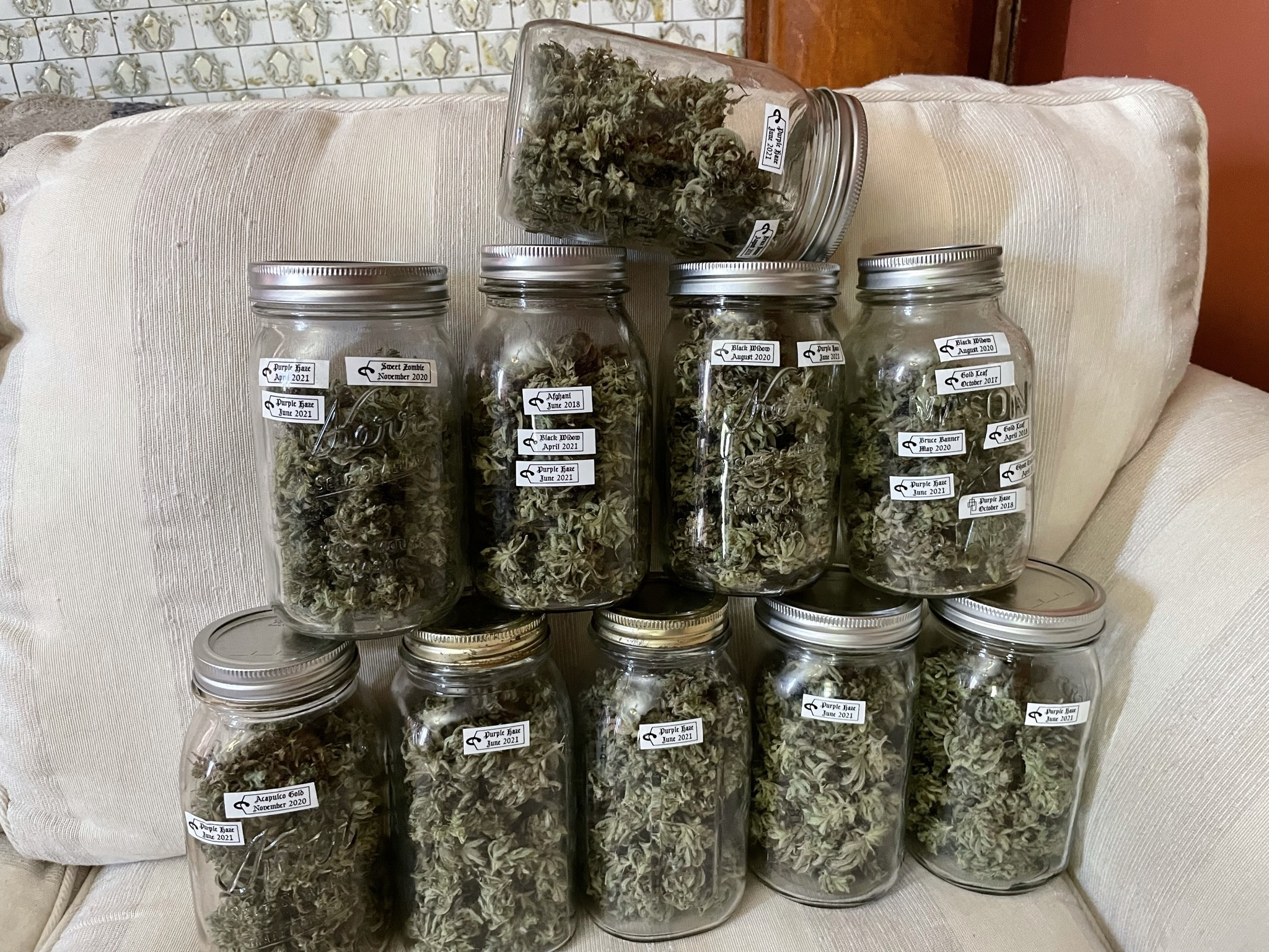 Epilogue: Instead of screwing around with firecrackers, I spent part of my Fourth trimming bud in my parlor. It took ten jars to hold all of this Purple Haze from just four short plants!