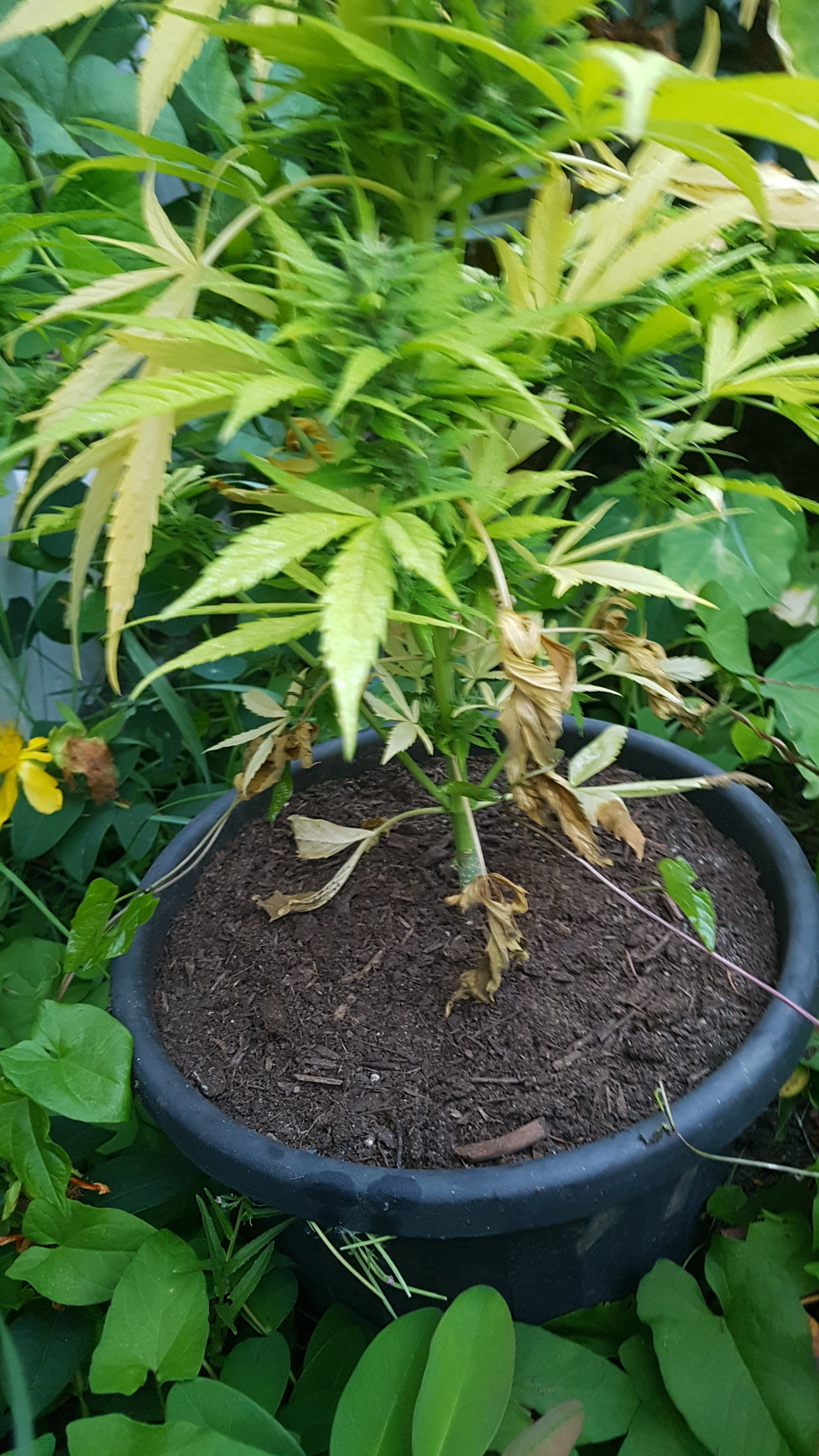 Heat is a big problem for some plants I started adding armor si from general organic I don't do autos but when that happens I cut the dead stuff off and make sure they get enough water during these heatwaves I have been putting a tarp up on really hot days and I put a fan out there lol i guess it helps