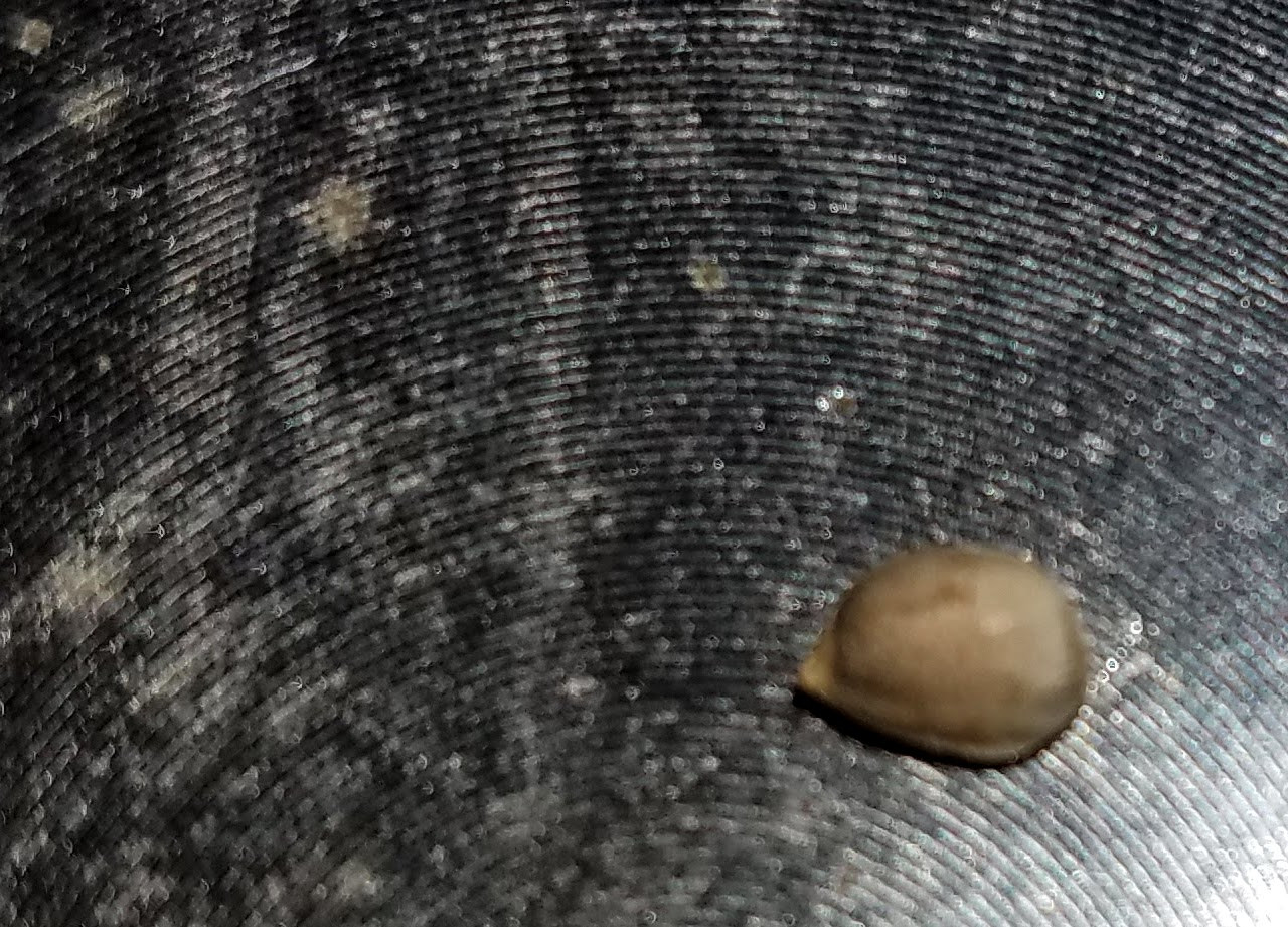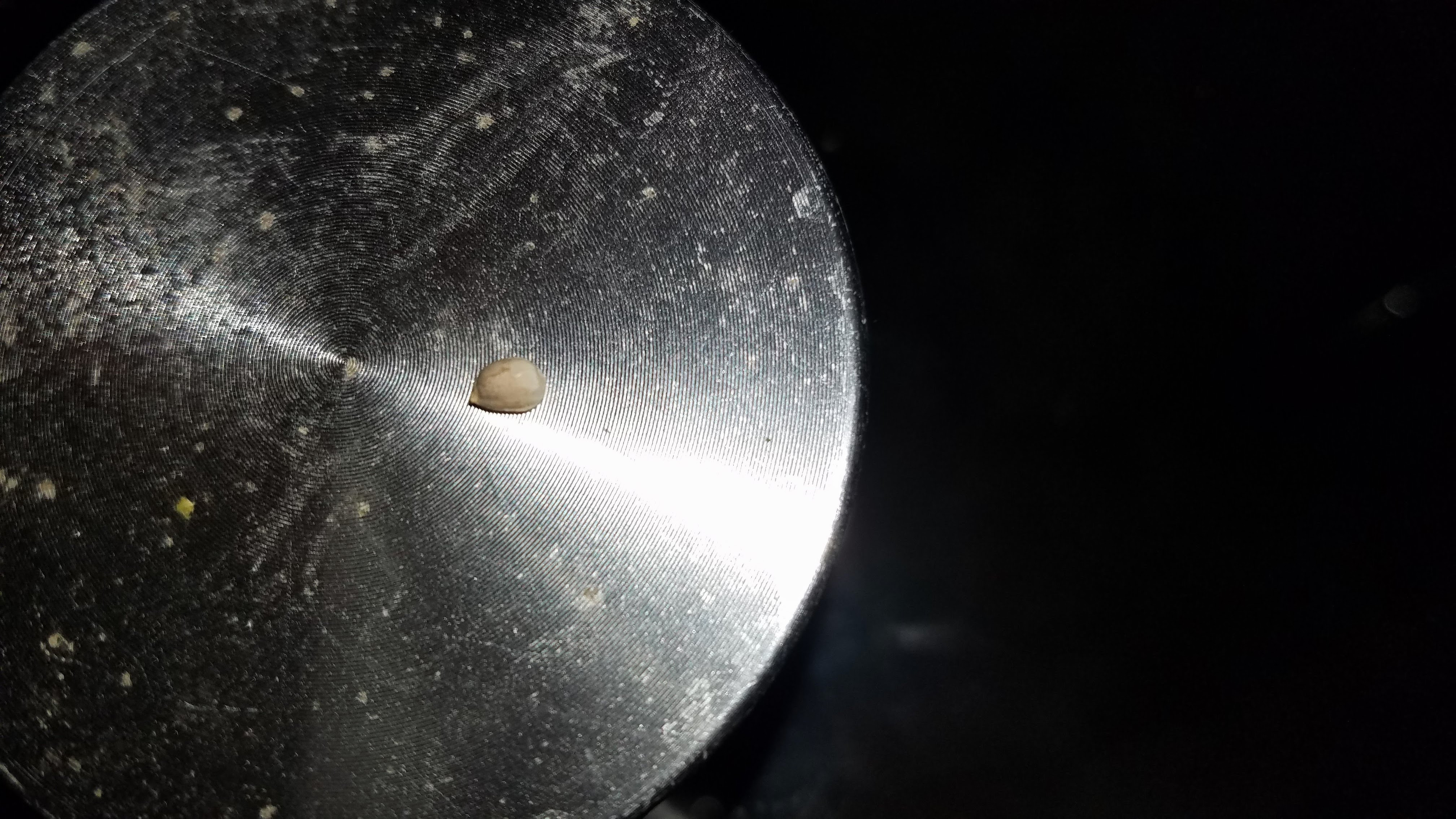 I just found a seed in My Mag Landrace, while grinding some small hard bud with duff. It's lighter, not striped but whole. I set it on top of my dirty grinder for a pic, better than a glass coffee table. I'm attaching the original untouched pic and a cropped one. If it's viable, or to 'help' it, what is the best thing I should do with it right now? Tiny Ziploc in a small jar? Dark? Room temp or? Any 'treatment' now that might improve its chances when I want to try to germinate it? WE STILL cannot buy these beans. Thanks!