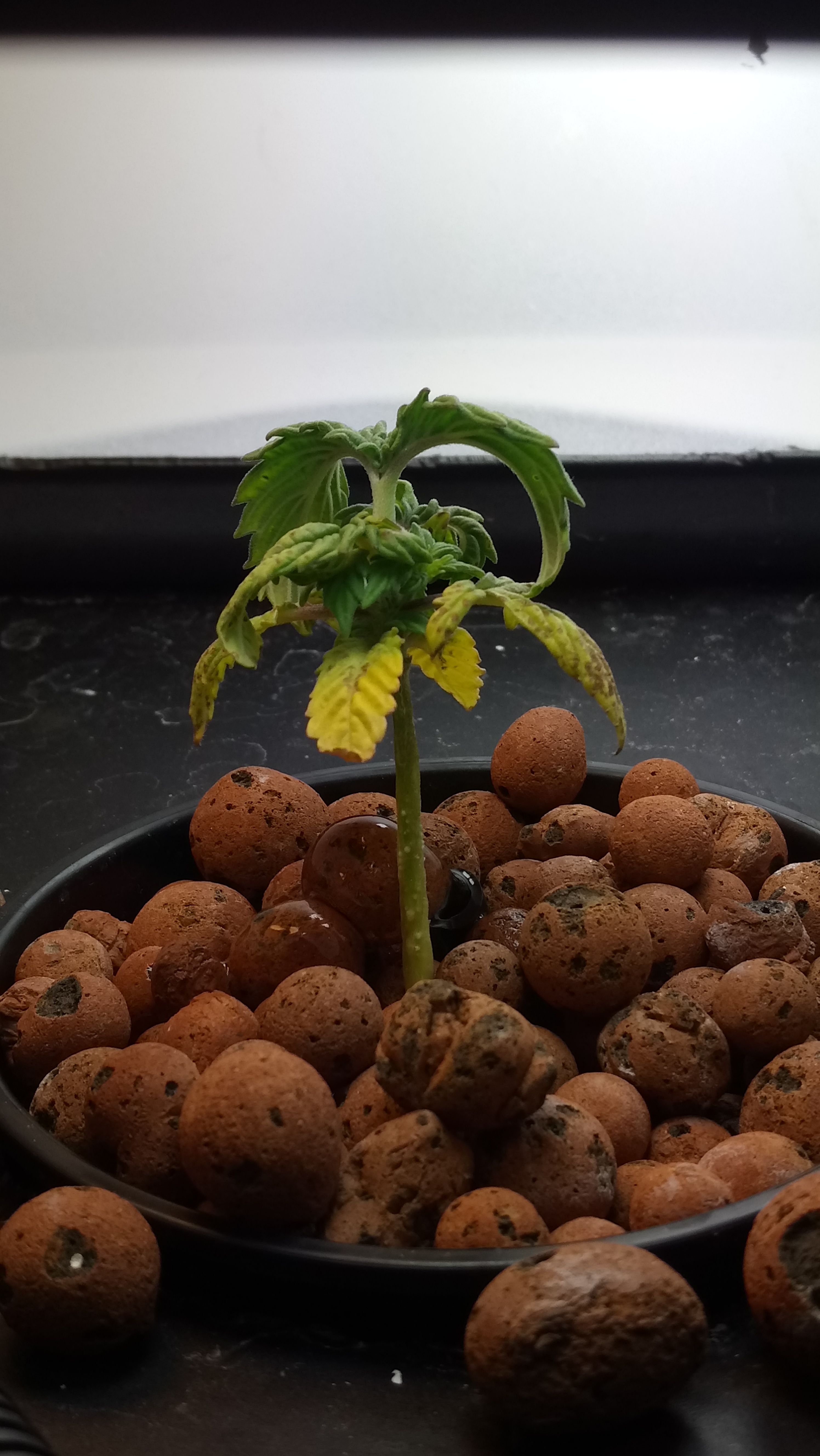 Can you post a picture of the whole plant in the setup under the grow light? It does seem very stunted. What are you using for nutrients, and have you been checking the pH?