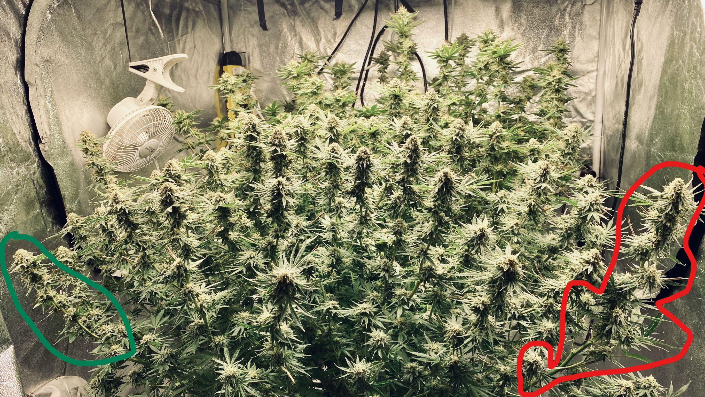 TOKABIGONE to better show what I'm saying... you want your bud packets to be all together if possible (e.g., green) and not so much like the red where the same amount of flower is spread out. Buds tend to be smaller if allowed to grow out on stalks of their own. When I was referring to seeing fat buds in your future I meant buds like the green one in the example below. What I’m counting as flowering growth tips will develop into flowering branches shown in the picture. Some branches have bud packets more spread out like the branch circled in red. This generally happens when the plant does not get enough light to newly forming flowers. The plant will push them out on their own branch trying to get light to the flowers. It’s my grow I’m showing - so I’m free to critique. I hope this is clearer than mud - but if not let me know (i have word combinations I haven’t used yet) 😃