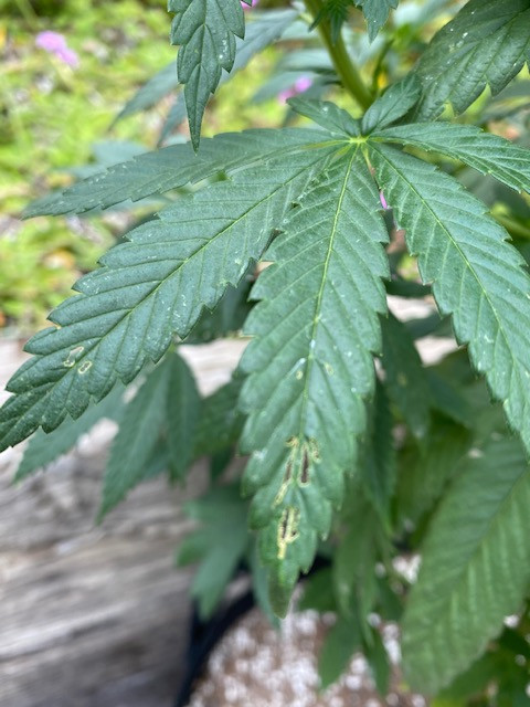 I found a few leaves with holes in them, see photo, I've not seen any flies, worms or caterpillars. About once a week I've been spraying with Monterey B.t RTU spray (Spinosad) for prevention. Any ideas what is causing the holes. Otherwise, I think the plant looks pretty good.