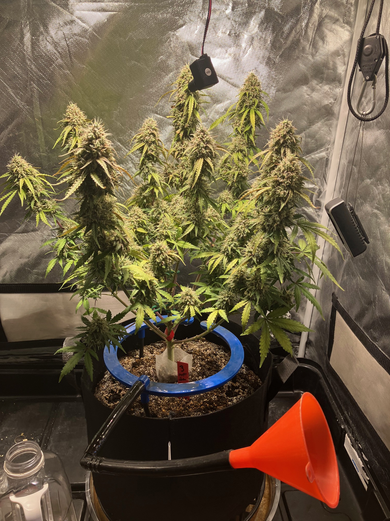 I feed until amber trichomes and then pHed water until drinking slows - will cut ripe buds off and stage harvest the rest along with the replacement for mutant plant.