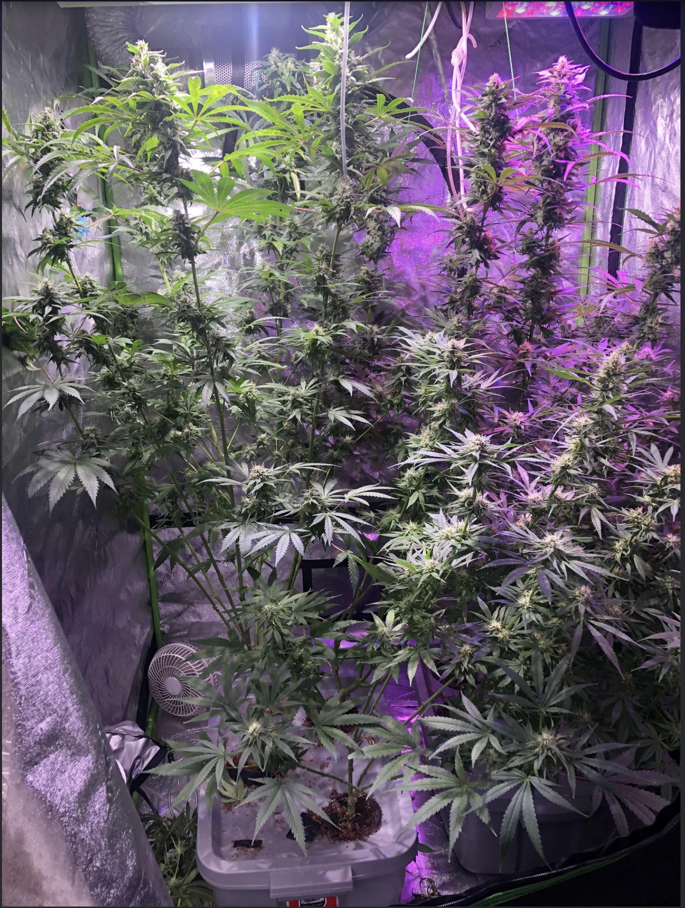 Two weeks after the flip to 12/12, I have one Grease Monkey roughly 4 inches from my light and a height of 32 inches. Other colas were in the high 20’s. I was doing everything with training to prevent this, but it was growing so fast it was impossible to manage…especially with two other plants in the tub preventing me from really spreading it out. I literally had one option available, and that was to emergency order a new tent. Two days later I had a new 4x4x7 tent, my 315LEC and a 1000 watt LED panel I’ve used before hanging over the two tubs and boy did they (and me) enjoy the new space this offered. I’m thinking, awesome, all set now, stretch all you want now, I am king of my destiny, not you plant.