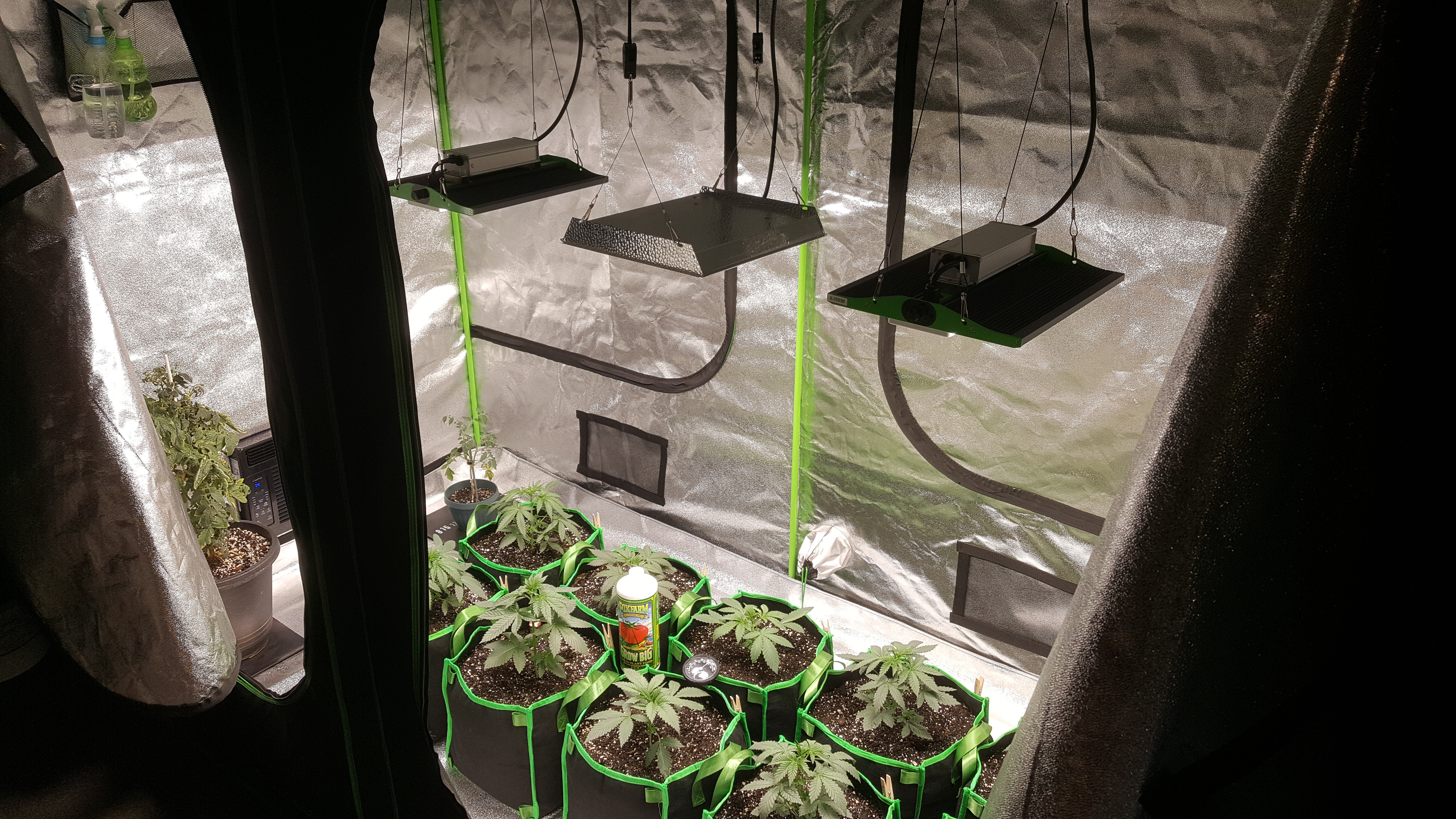 Thank you all, strains are og-18 x 3, gelatto berries x 3 and gorilla glue x 4 ..the sad little dudes are some clippings I was hoping to save off a buddies "BigBud" fem.,they might not make it..my plants are in fix farms ocean blend,with a 25% moss/coco mix,and a bunch of fine ground leaves from last grow..they drink 8 gallons a week between them all at 3 cups each every other day with some fox farms "grow big" (6 spoons per 2 gallon) every other feeding..twice a week I do a light foliar spray 2 hours after lights go down..for lights i have 2 viparspectra 1500s and 1 mars hydro 1000 set on a homemade variable timer with a timed night dim-out. They get 18 on 6 off ,I have a built in 1500 btu airconditoner built in so tent stays perfect at 86-90 deg with 45-50 %Rh.. have a homemade Co2 system going through a small fan(does any good or not ,i dunno) tent is a vivosun 4 x 8 x 8 ...