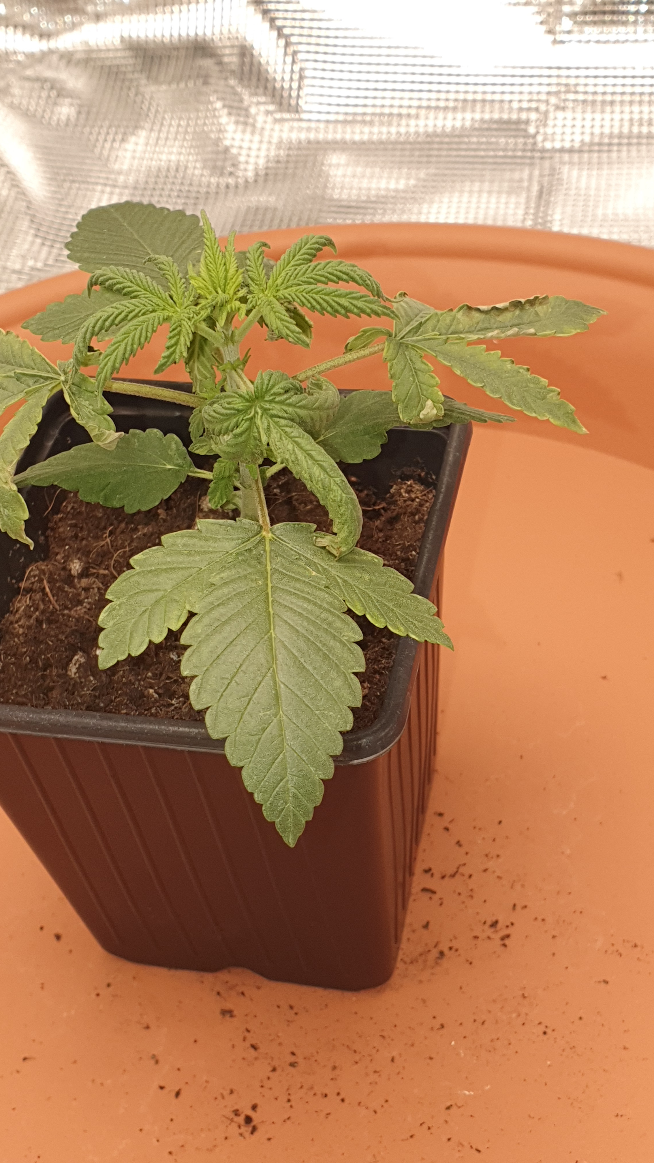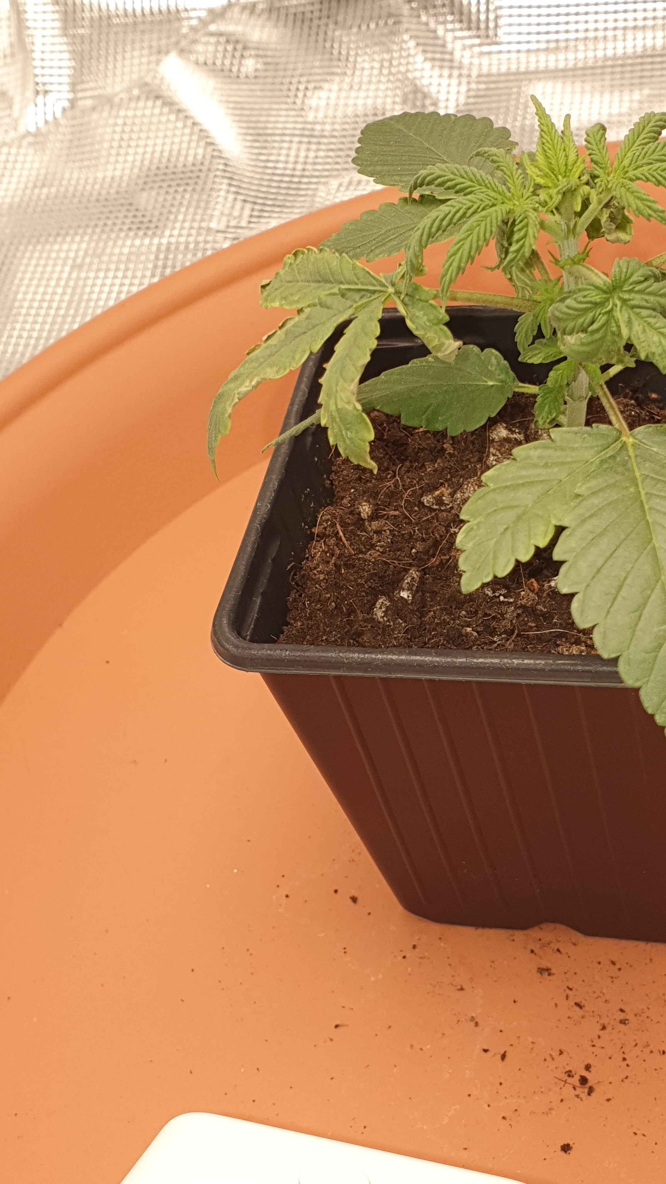 The pot is just the seedling pot it's at a litre maybe litre and half the plant will be going into its on 25 litre fabric pot soon which I will add perlite too and I also use eco thrive neutralise for the chlorinated water one drop to every litre so shouldn't be getting chlorinated water but I will definitely add perlite to the mix.