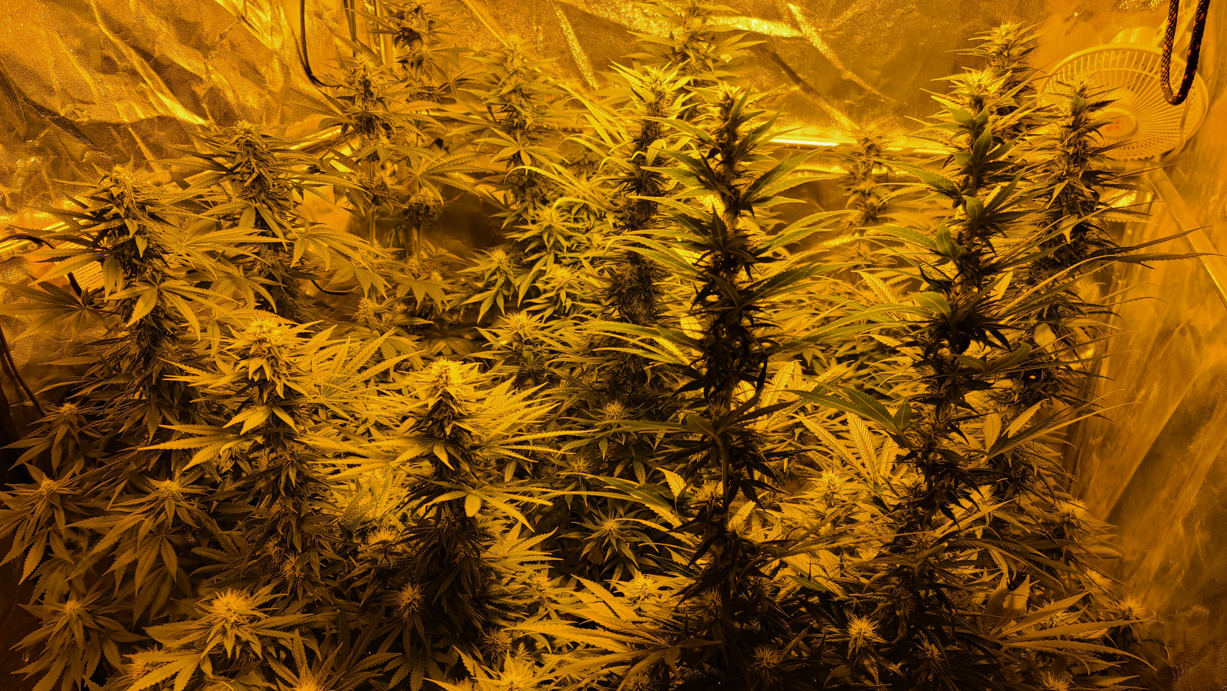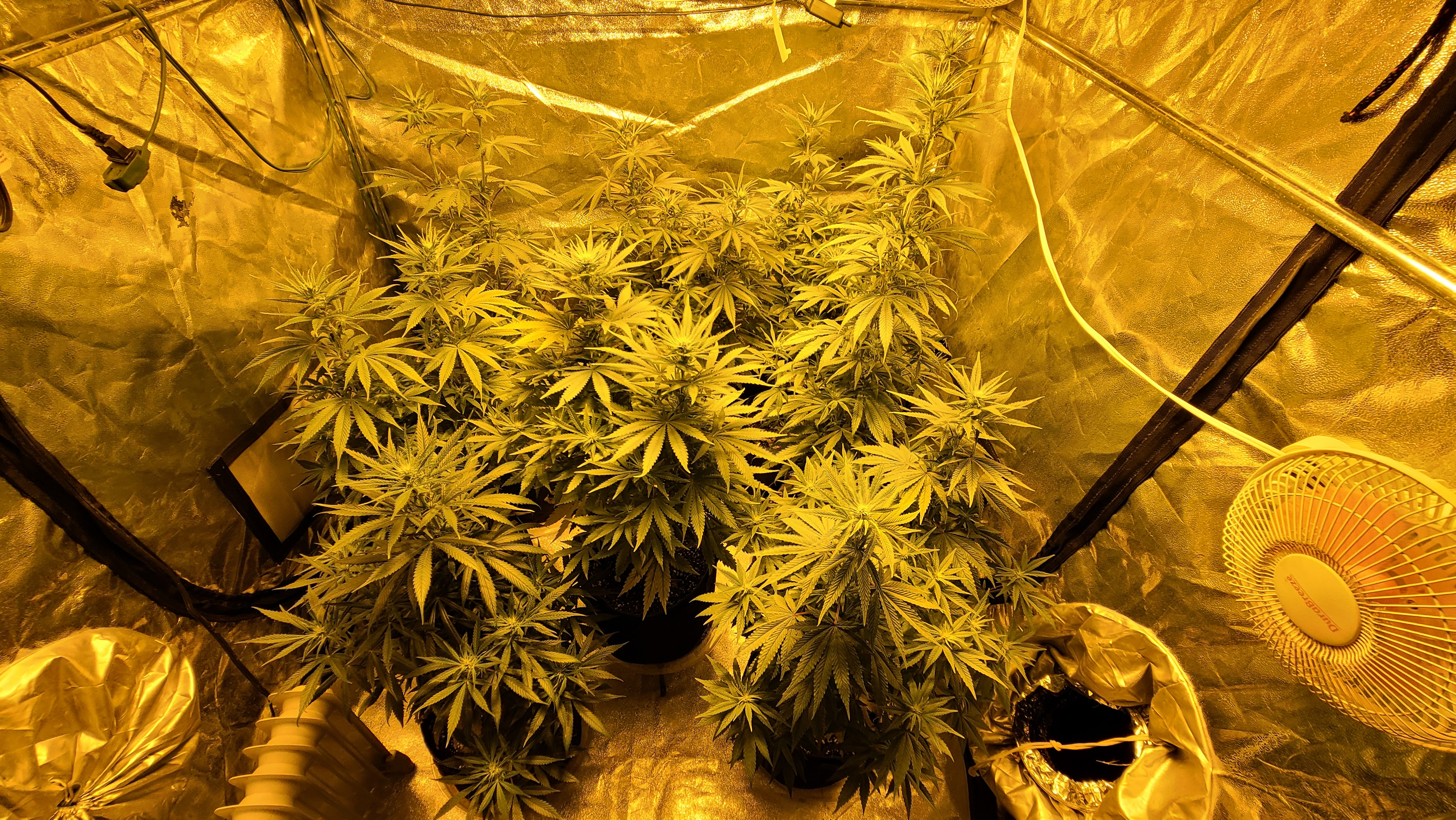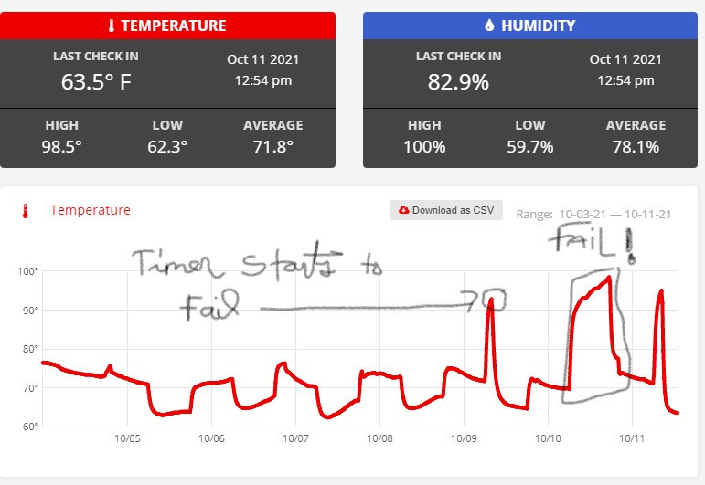 Then ... the timer decides it is going to send me notification that it has turned off the ballast for the 12/12 when in reality it kept letting power pass through. So I ended up with a week of 12/12, then a short duration where it stayed n for a short time longer than reported, then a full 36 hours of light where it completely missed a "night". Also the blower is on a similar cycle but on a different timer so when it went off the temps spiked way up. You can see it on the graphs I have on the temp/humidity sensors. Not sure what it is going to do to the grow. I can't imagine that they will have tried to re-veg in such a short amount of time but they have been stressed enough in this grow that I don't want to see any hermies;