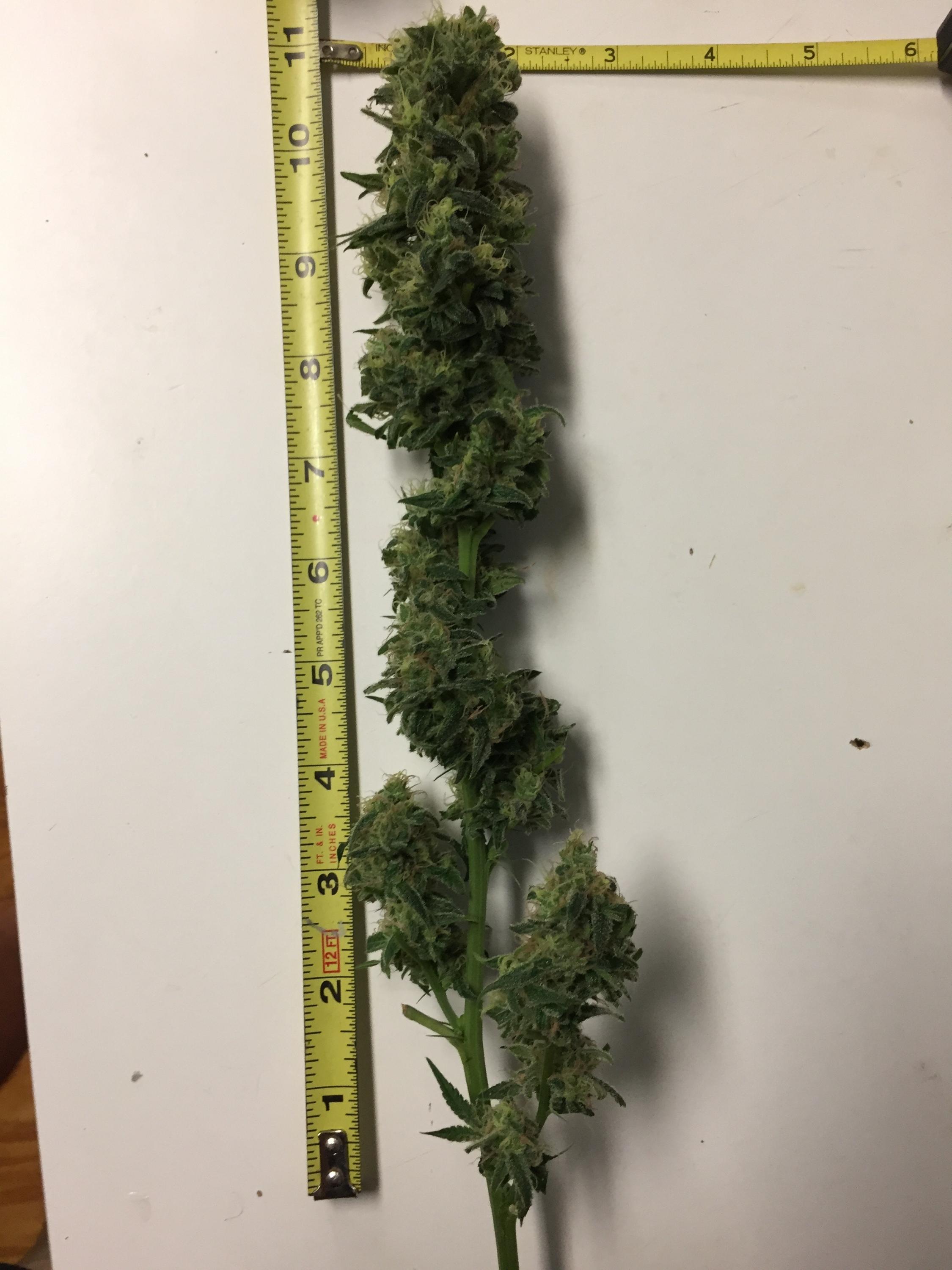 I have 4 T5 HO cool white fluorescent lights that are 4' long. 54 watts per light and my electric bill barely noticed - maybe $5 per month I'm not using hood reflectors. Just bought some white poster board that was shiny on one side and lined the walls. Here is just one of several cola bunches I got off of one plant after 12 weeks. This one still needs to dry and cure, but it initially weighs in at 33g (1.16oz). Once it dries and I remove the stem, I'm hoping for close to an ounce. Once everything is cleaned and dried, I think I'll get about 5 ounces from the plant. I should have taken a picture of some of the leaves. They looked like they had a thin layer of white cake frosting on them. But in the long run, everyone has their own thoughts and ideas that make them comfortable. And that's what counts.