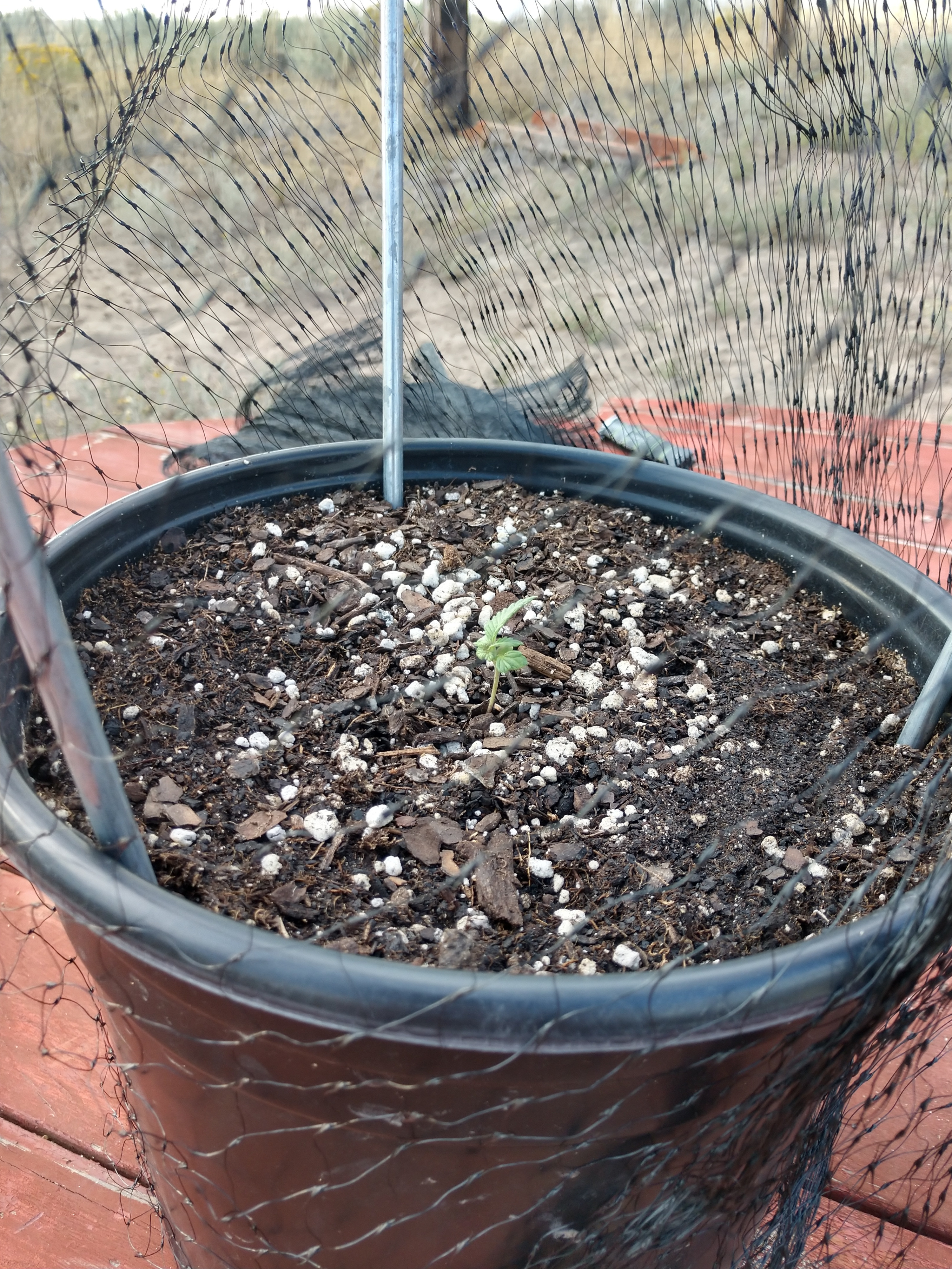 This was my fix for now since I don't have a trail cam, some bird netting over a tomato cage. Puglover1 I doubt it's the homeowner's cat, I don't think they let the cats outside much and it's kind of far from their house. Smoklahoma grasshoppers was my first guess but the last time I dealt with those the leaves were only partially eaten and the marks were rounded off. I really don't know here, but if it gets eaten now I can rule out bigger animals. The homeowner's plants seemed fine when I saw them which leads me to believe whatever it is only likes the small sprouts.