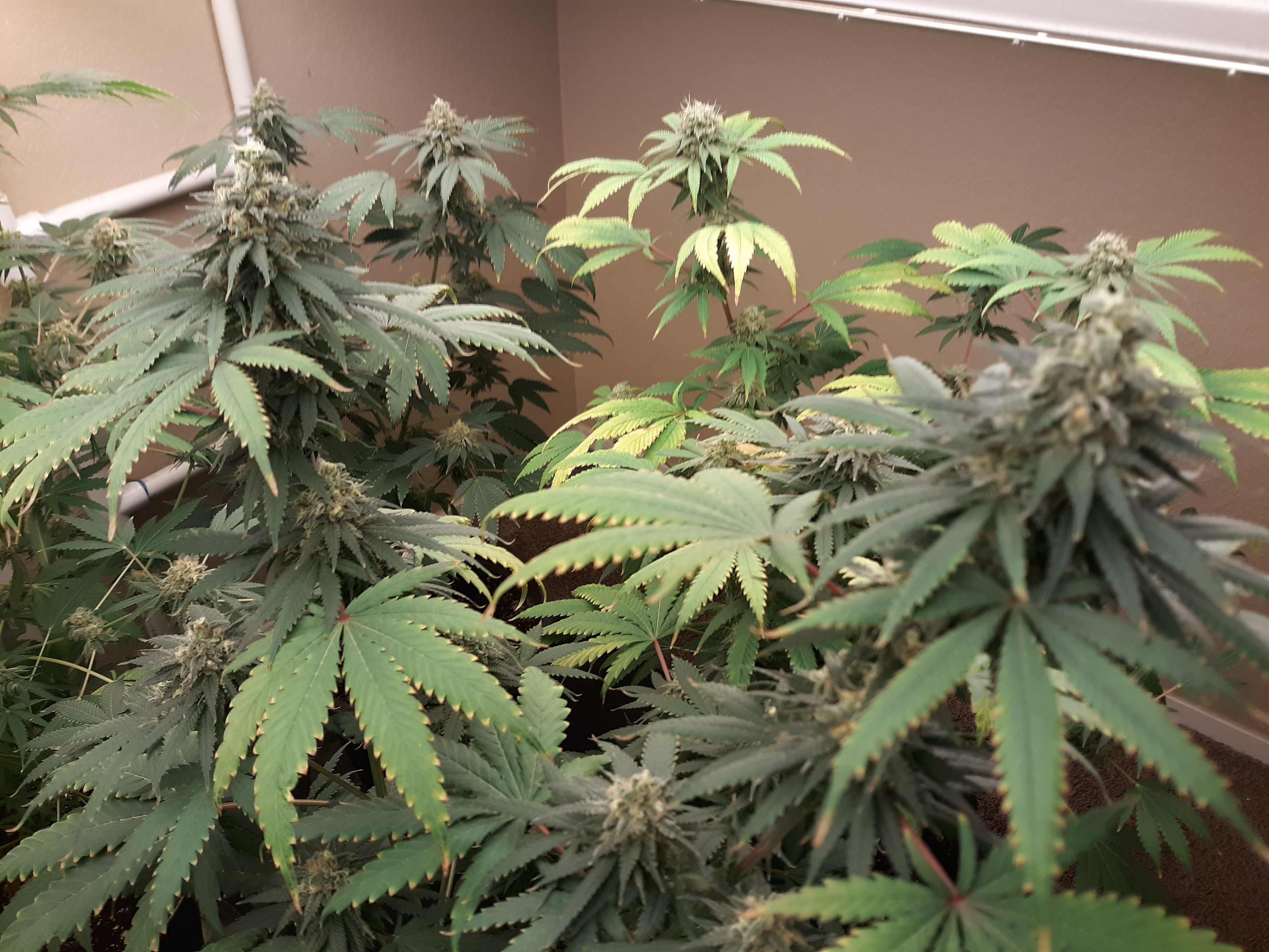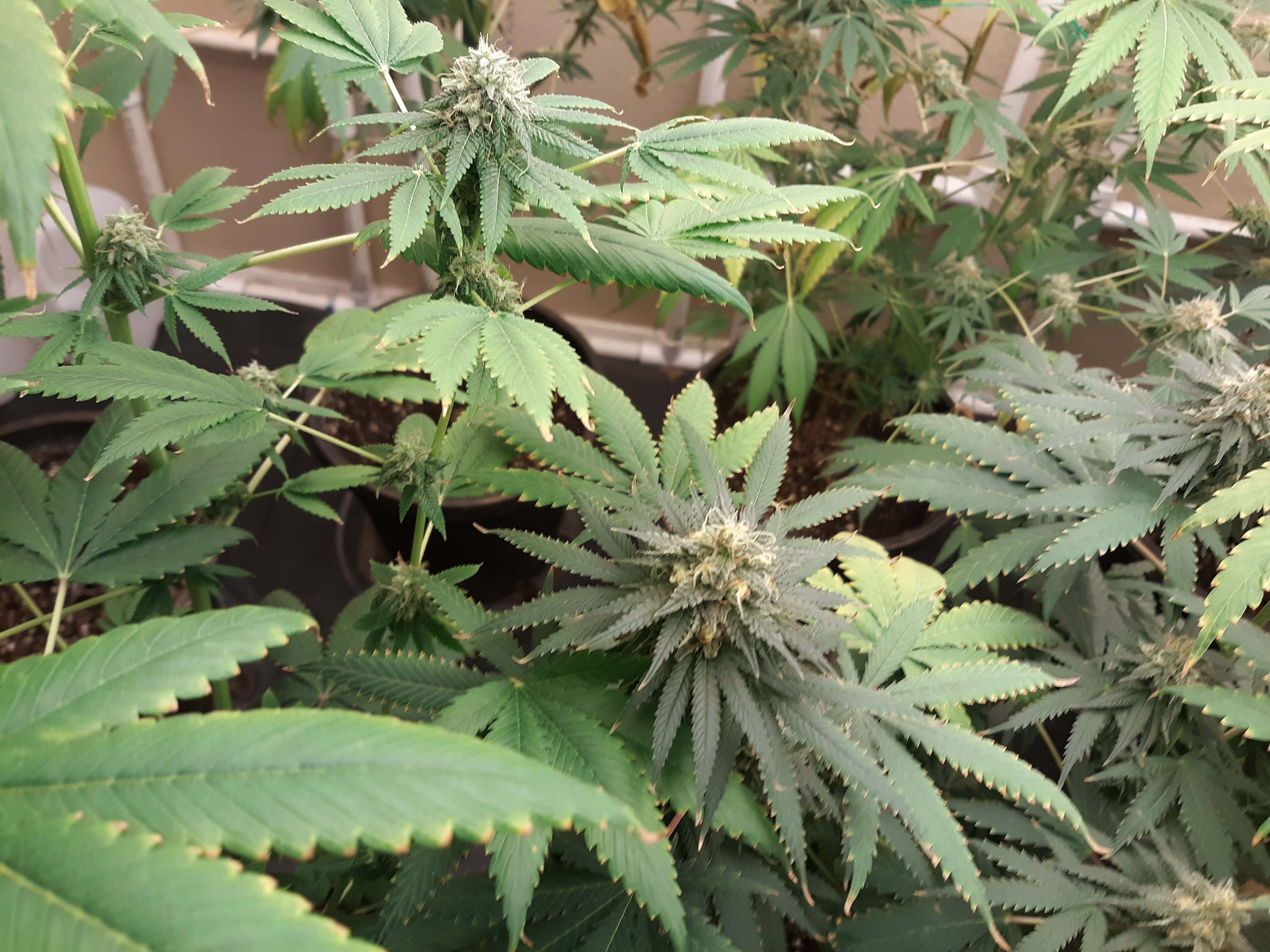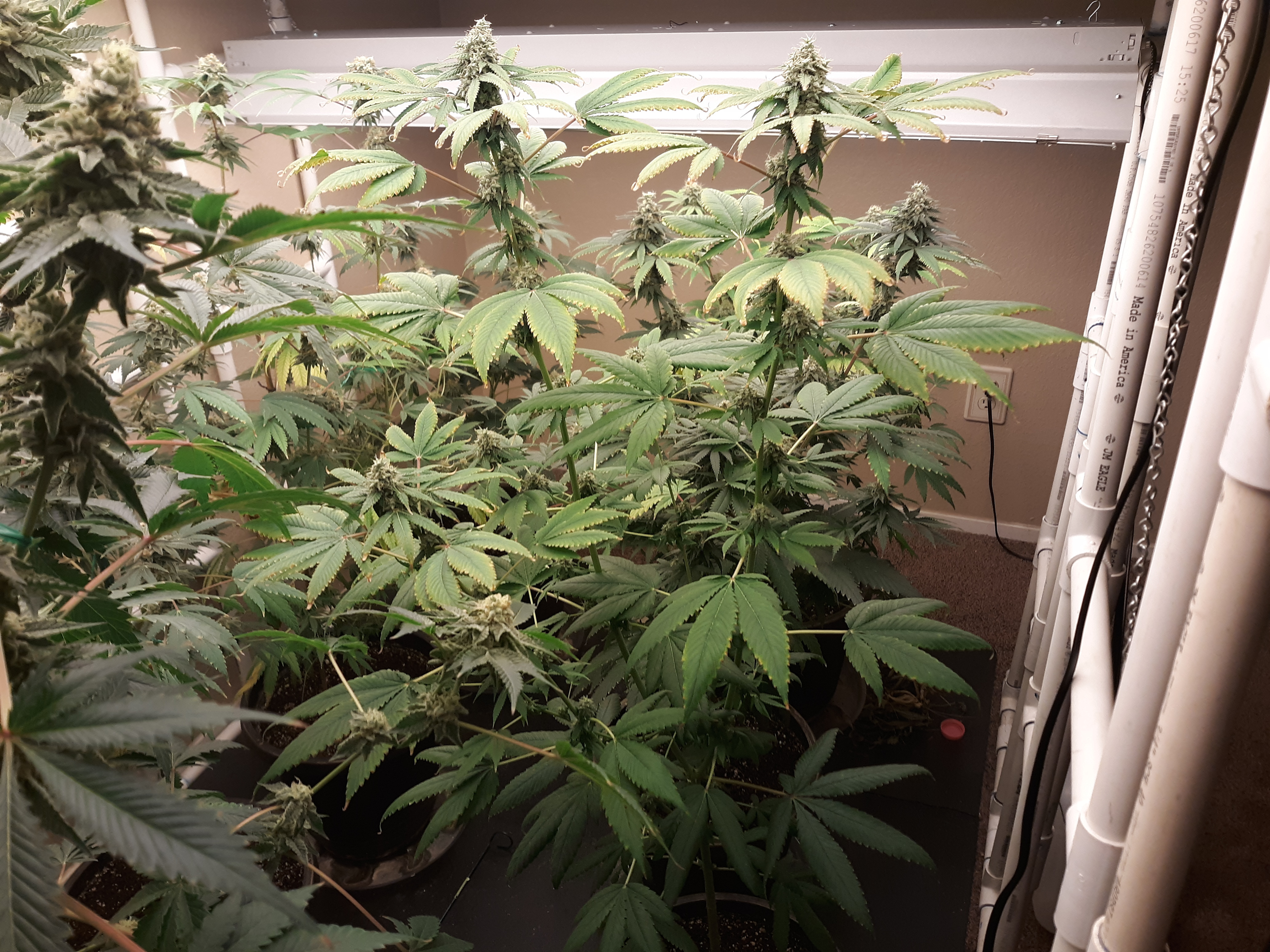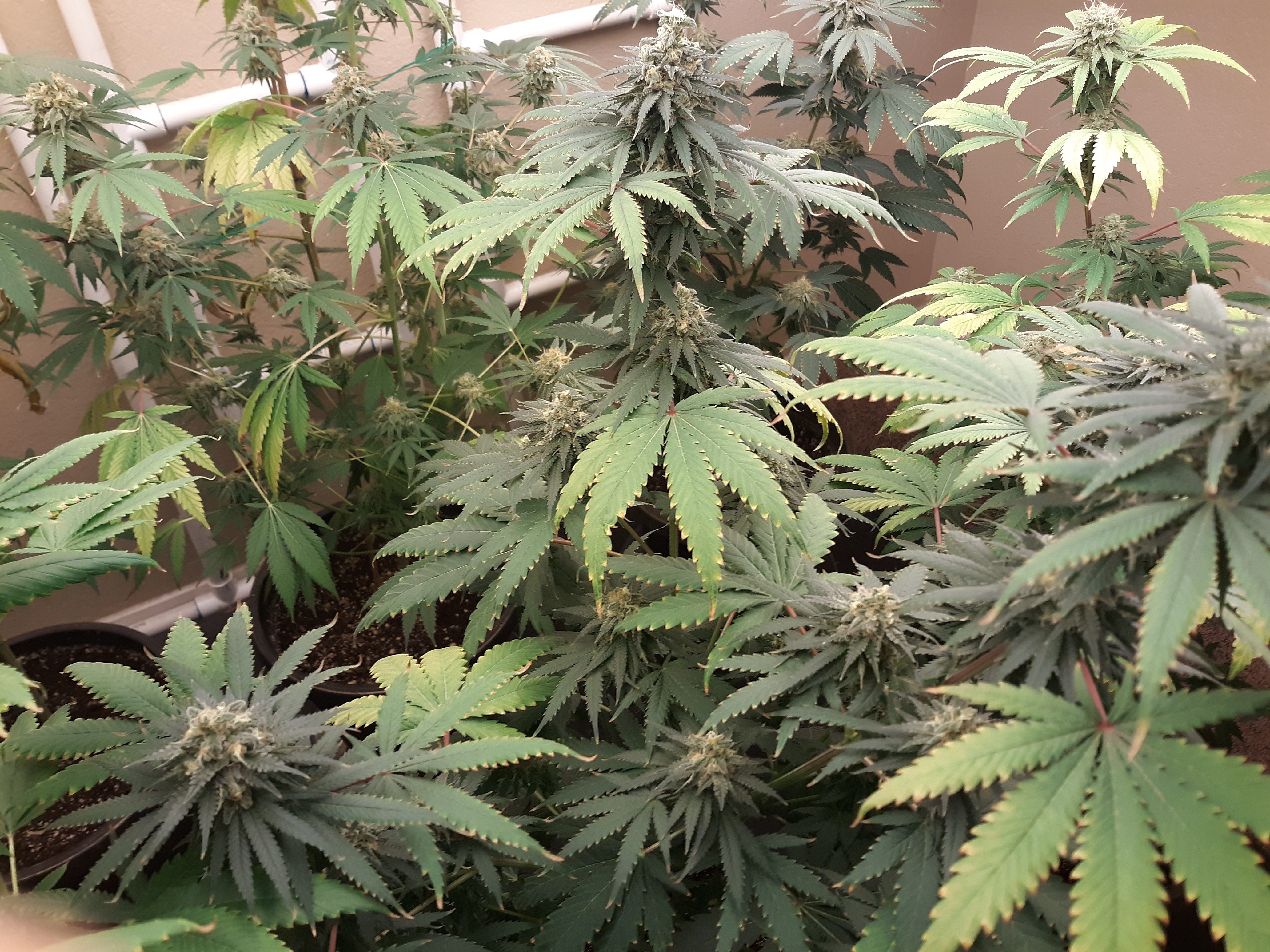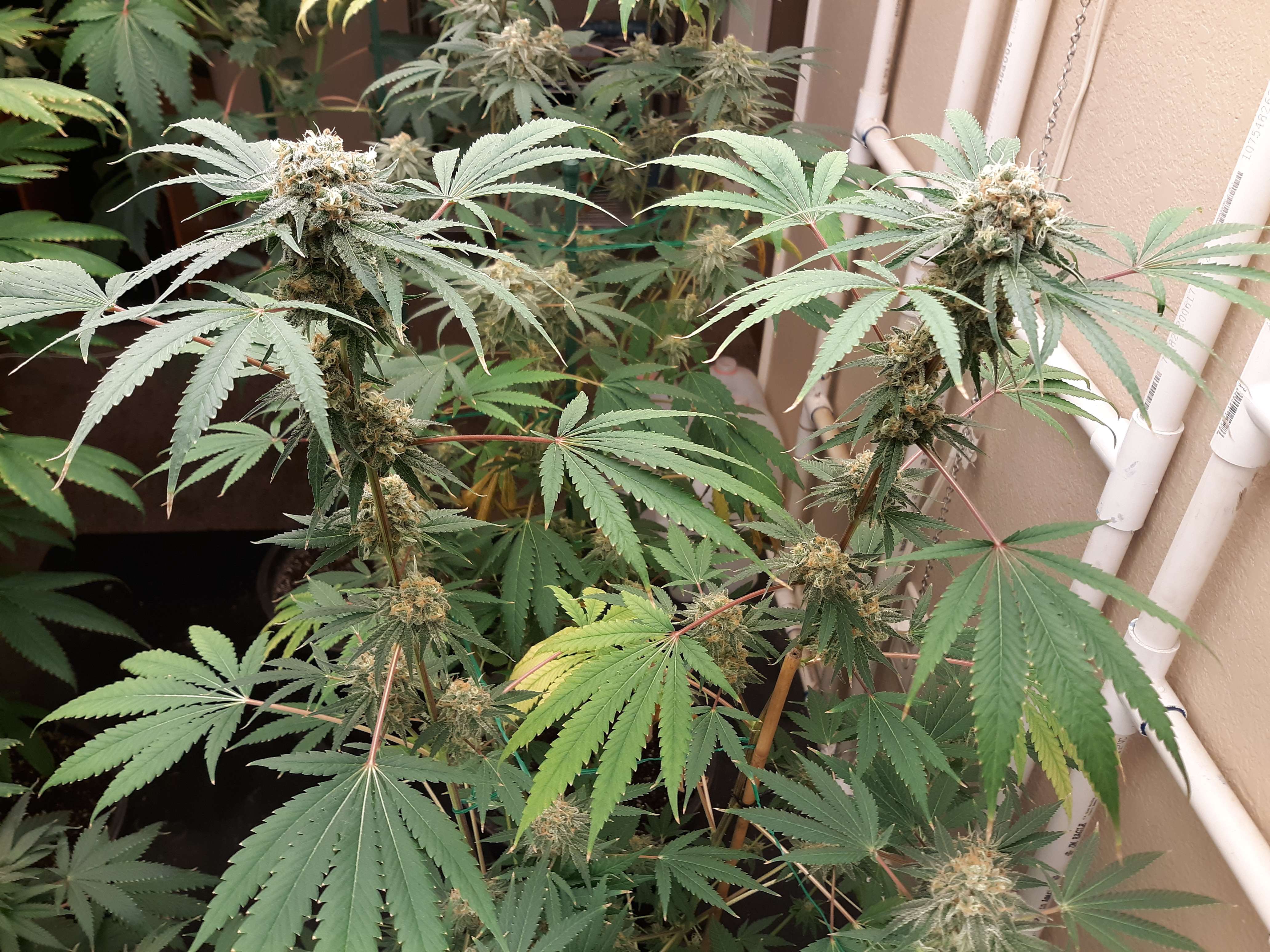 The others are for sure all Sativa and at different stages of maturity (these are at 8 weeks and 1 day into flower as well). There was 1 Sativa I did trim up (lower branches, wasted plant energy) at 6 weeks old, let the popcorn buds dry in a tray for a couple of days and WOW!!! The flavor, taste, smell, and burnability was all 5 stars!!! No choking or hacking, smooth to the palate. And what a buzz! Wake up smiling, ready to go!!! And the buzz lasts quite a long time!!!