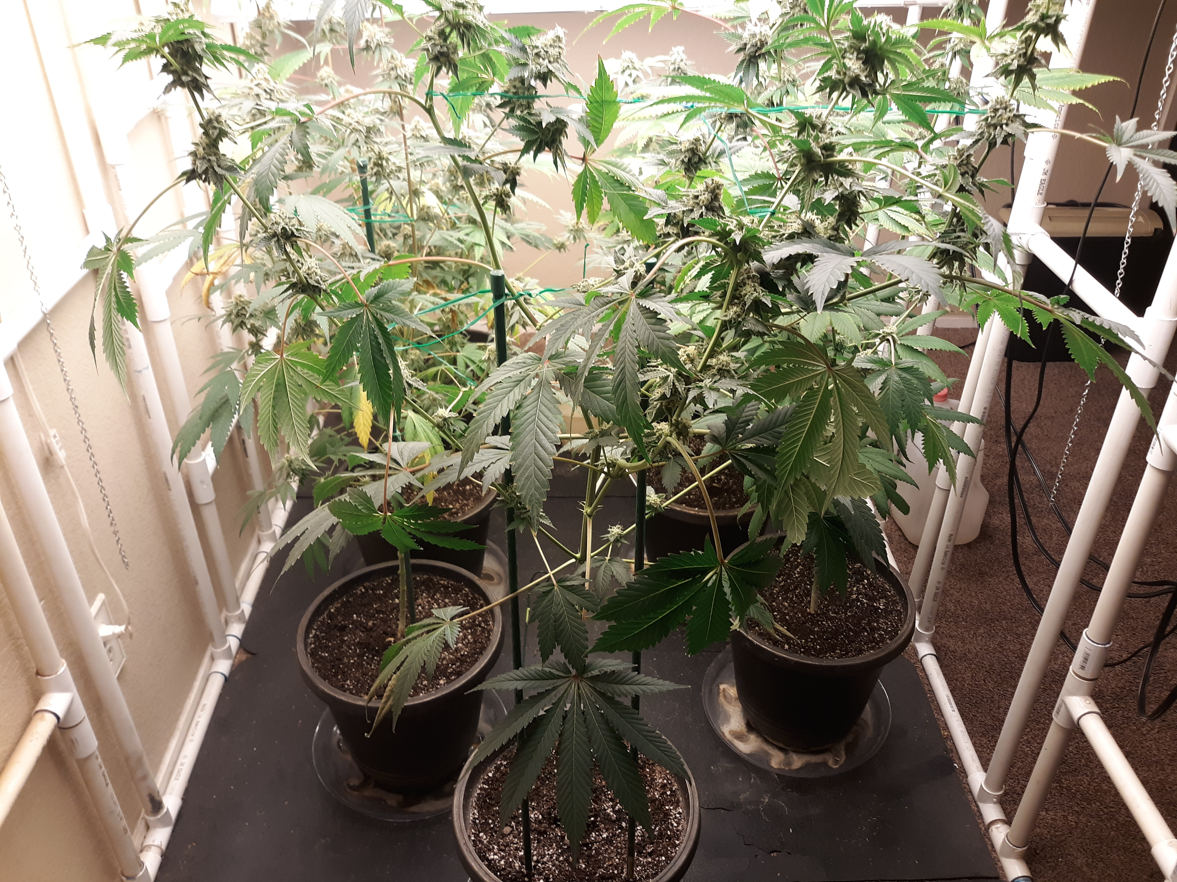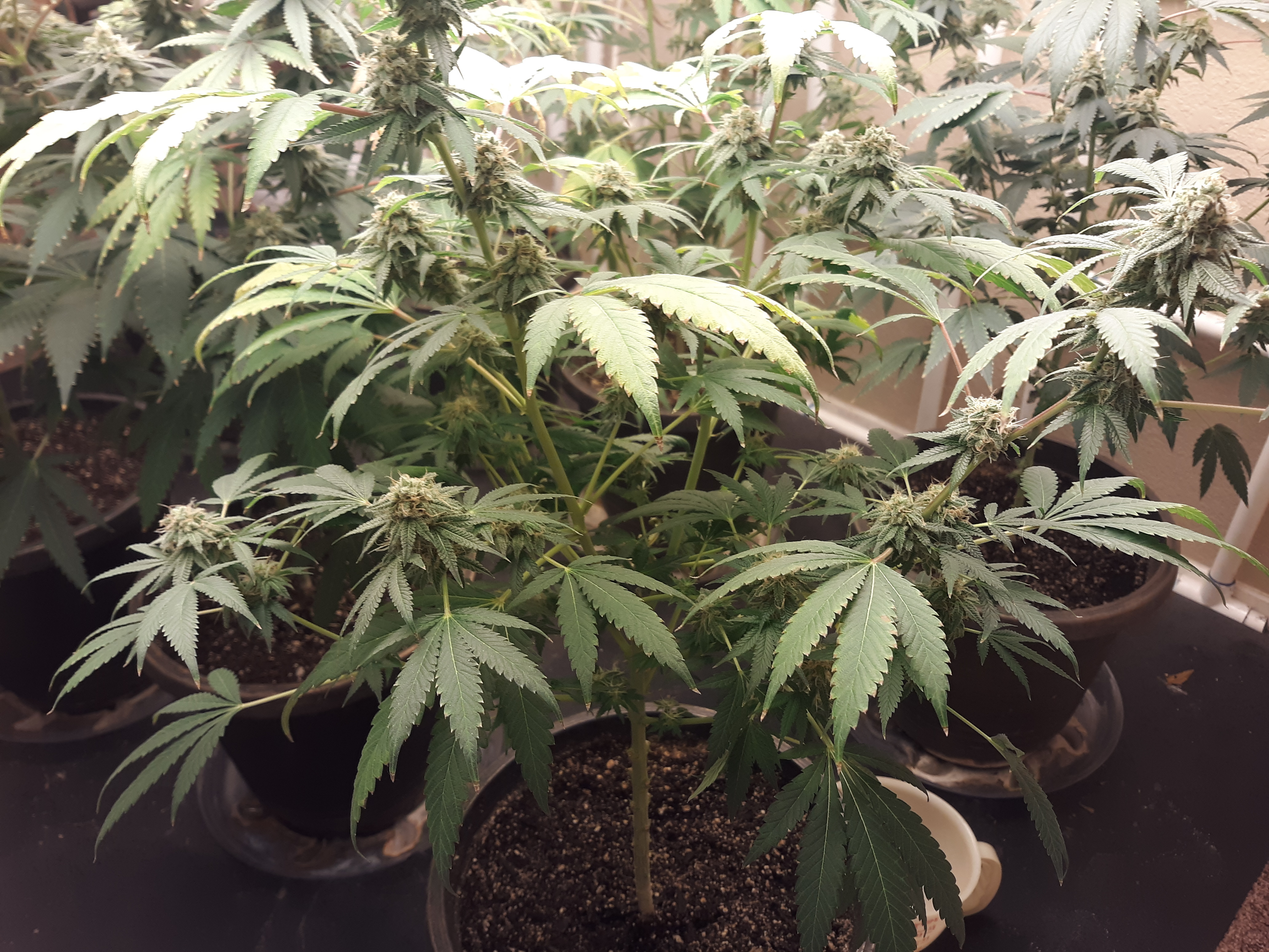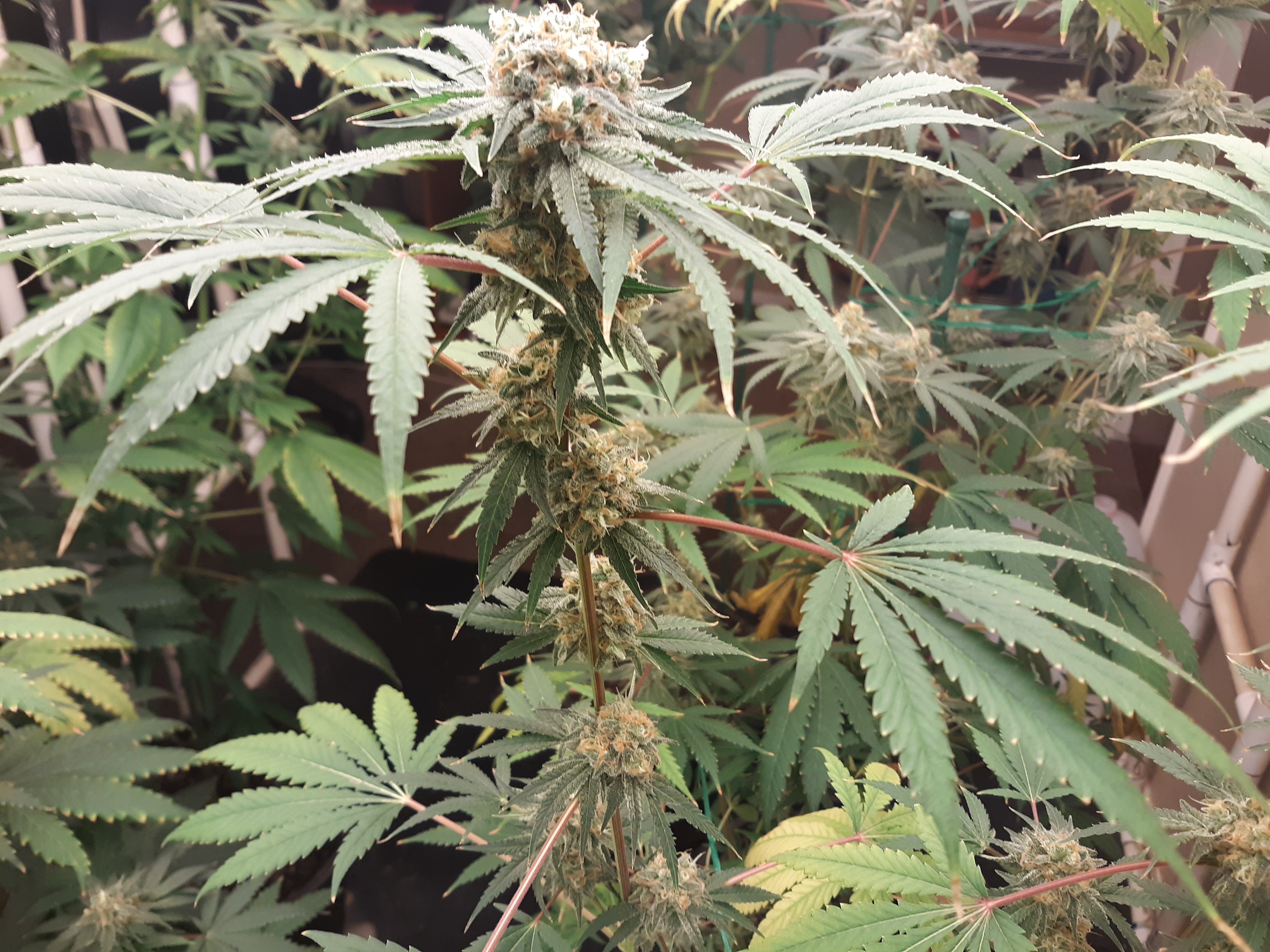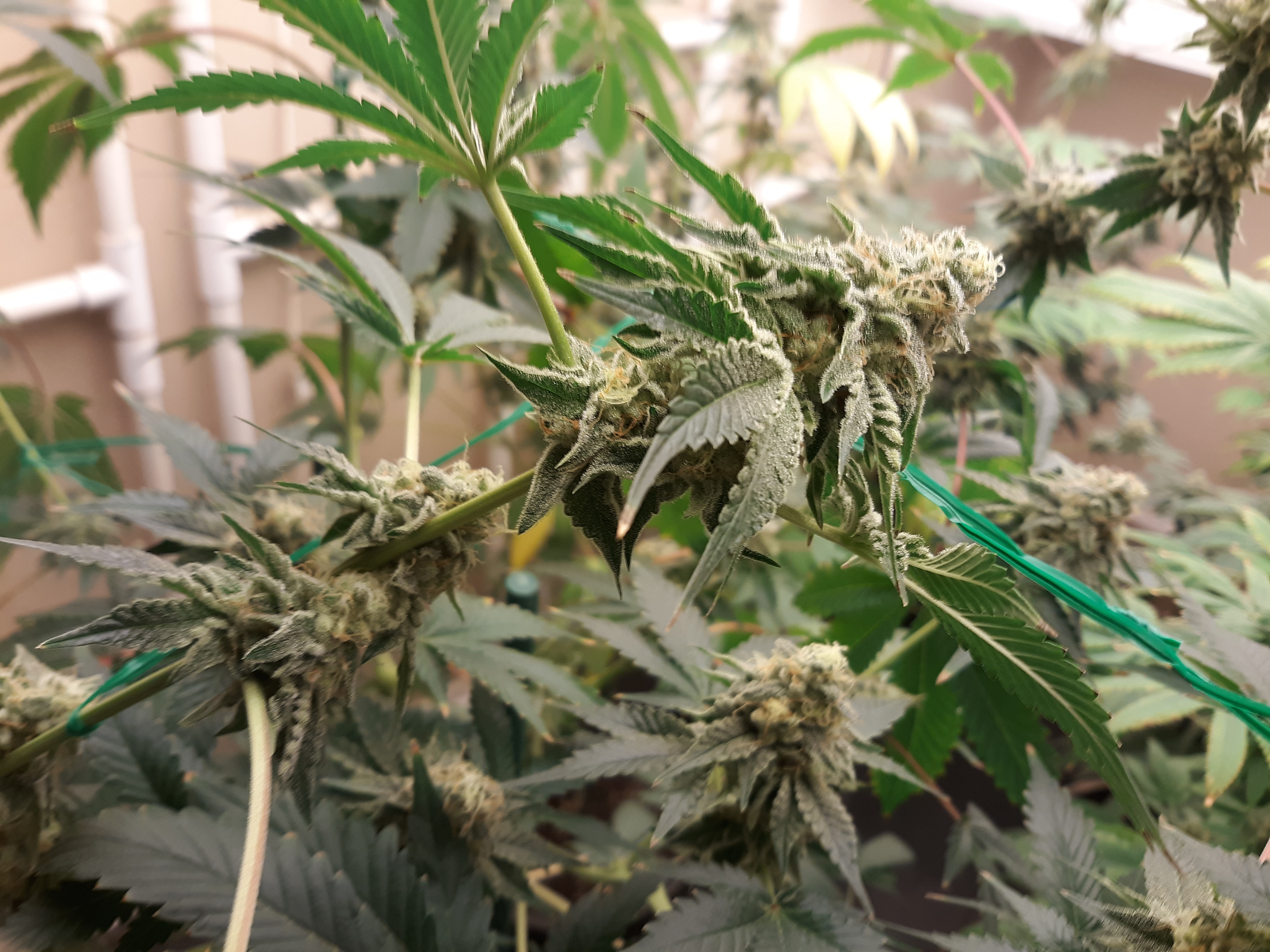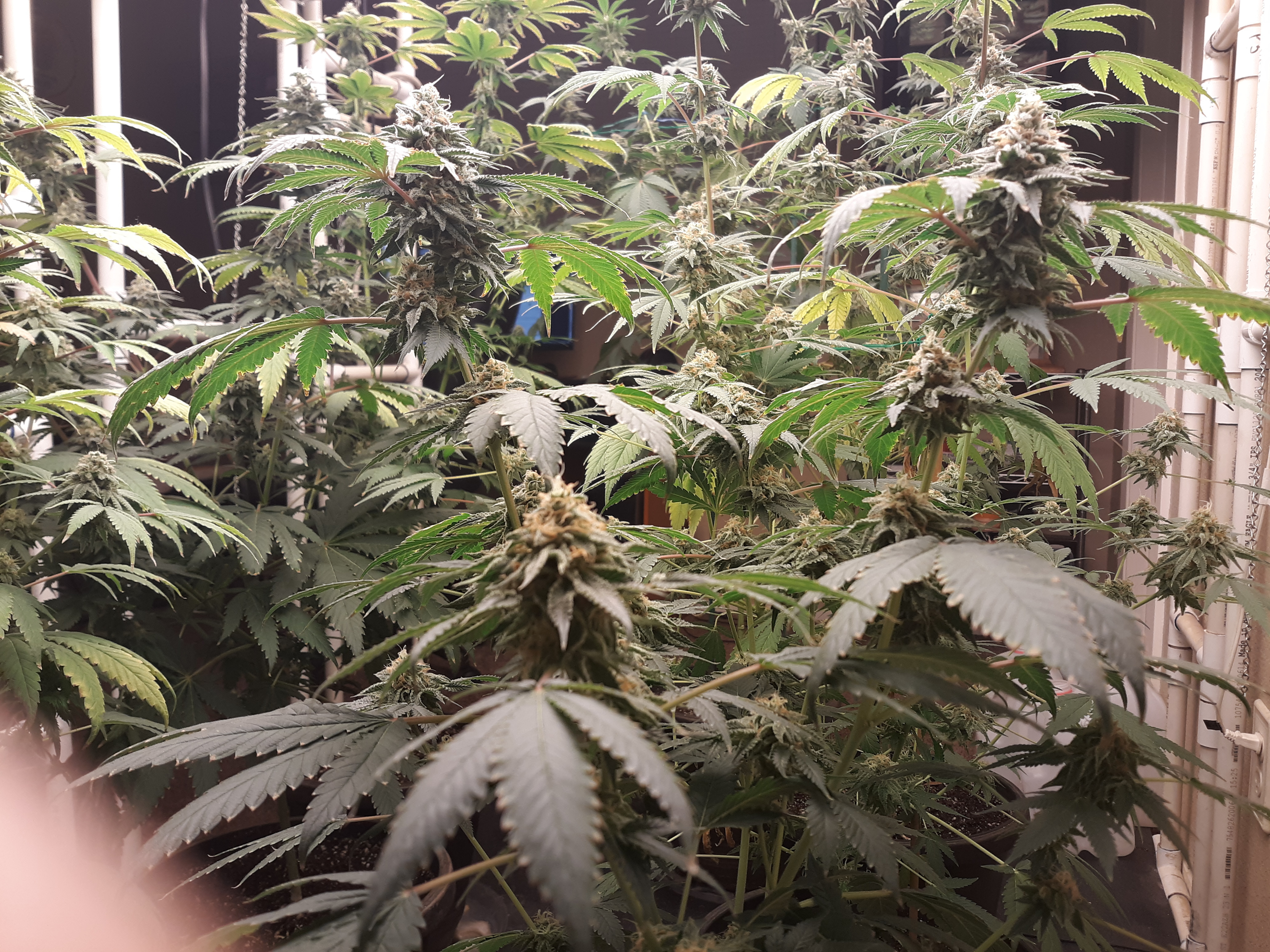 The others are for sure all Sativa and at different stages of maturity (these are at 8 weeks and 1 day into flower as well). There was 1 Sativa I did trim up (lower branches, wasted plant energy) at 6 weeks old, let the popcorn buds dry in a tray for a couple of days and WOW!!! The flavor, taste, smell, and burnability was all 5 stars!!! No choking or hacking, smooth to the palate. And what a buzz! Wake up smiling, ready to go!!! And the buzz lasts quite a long time!!!