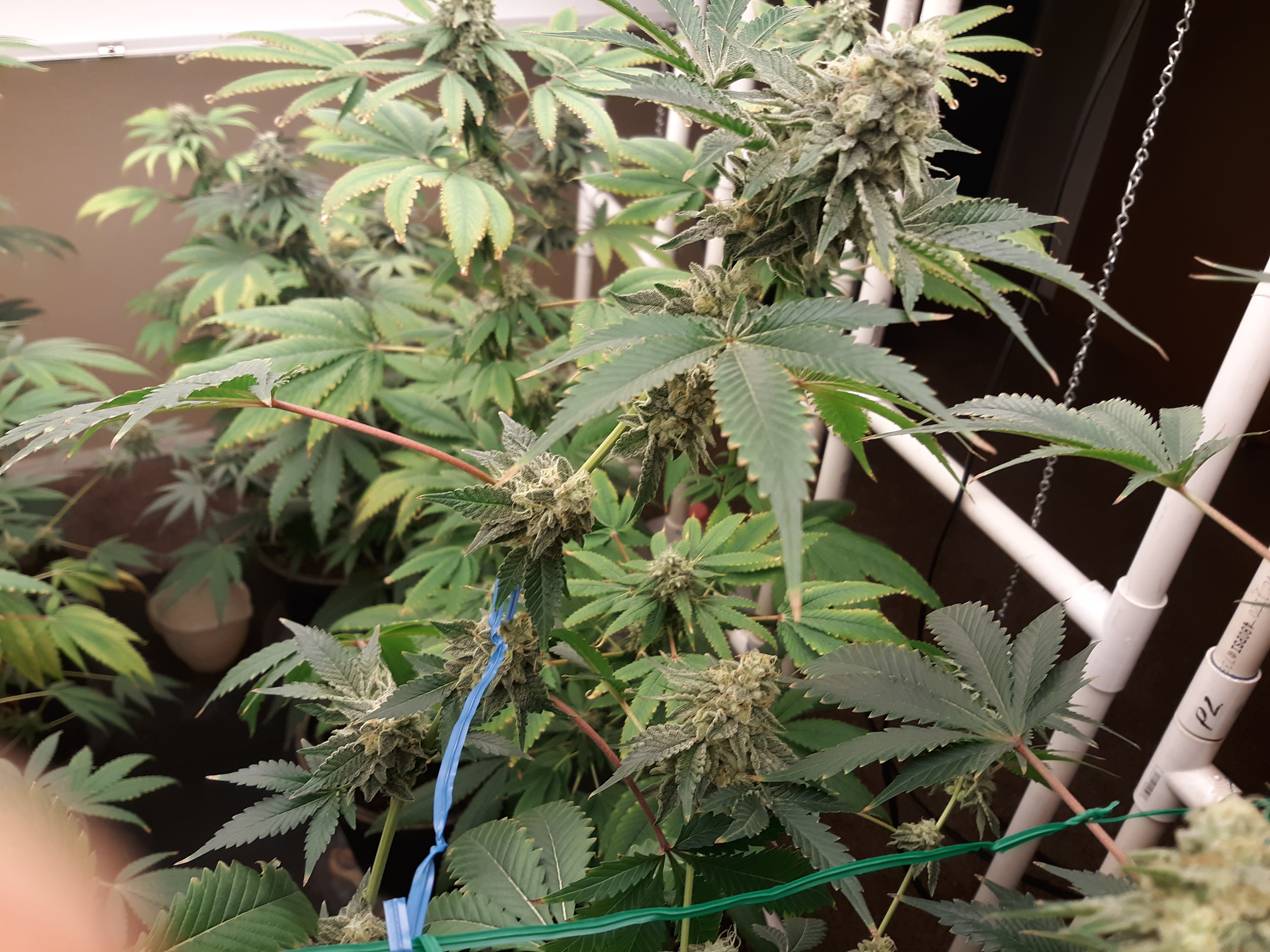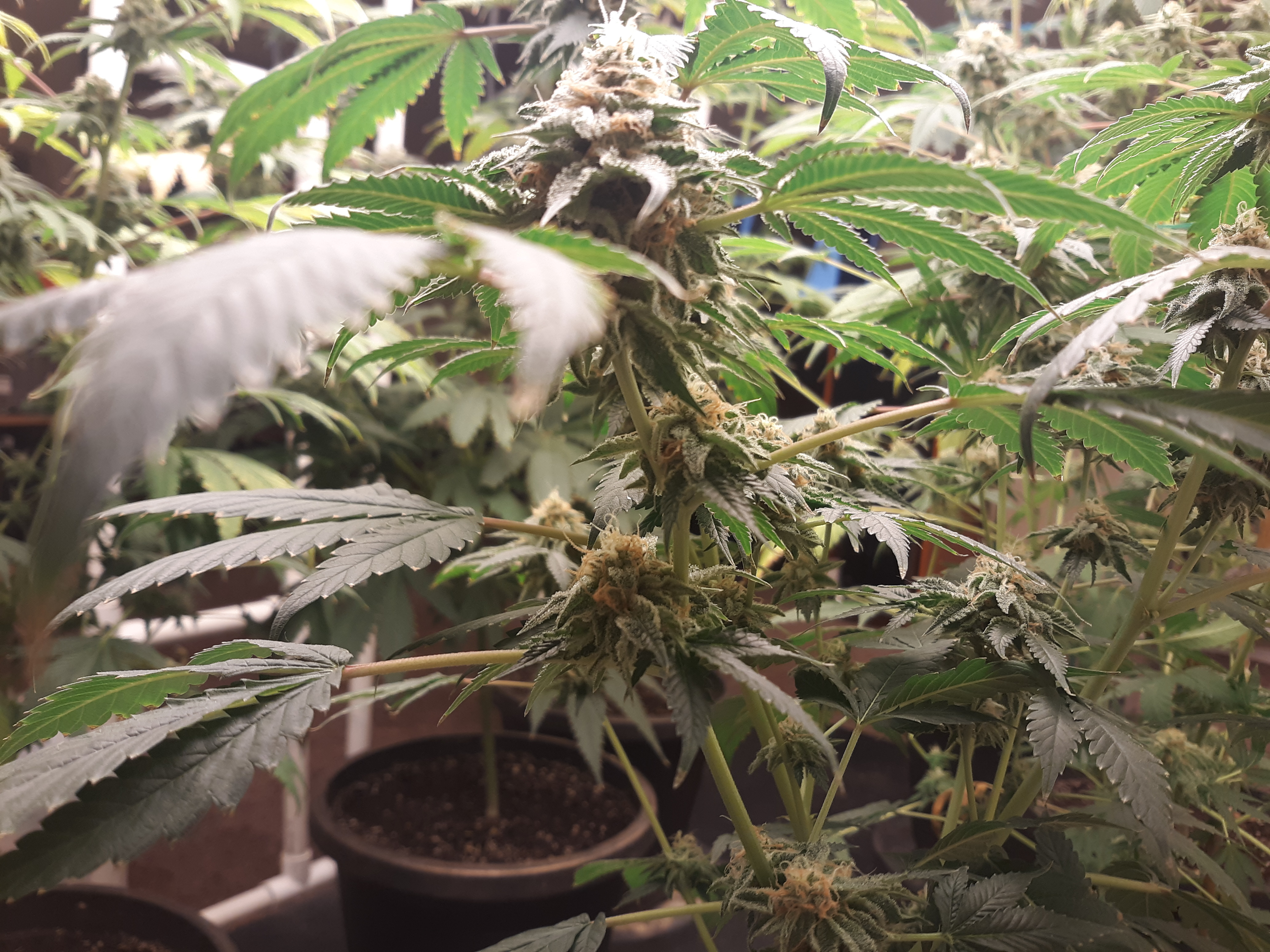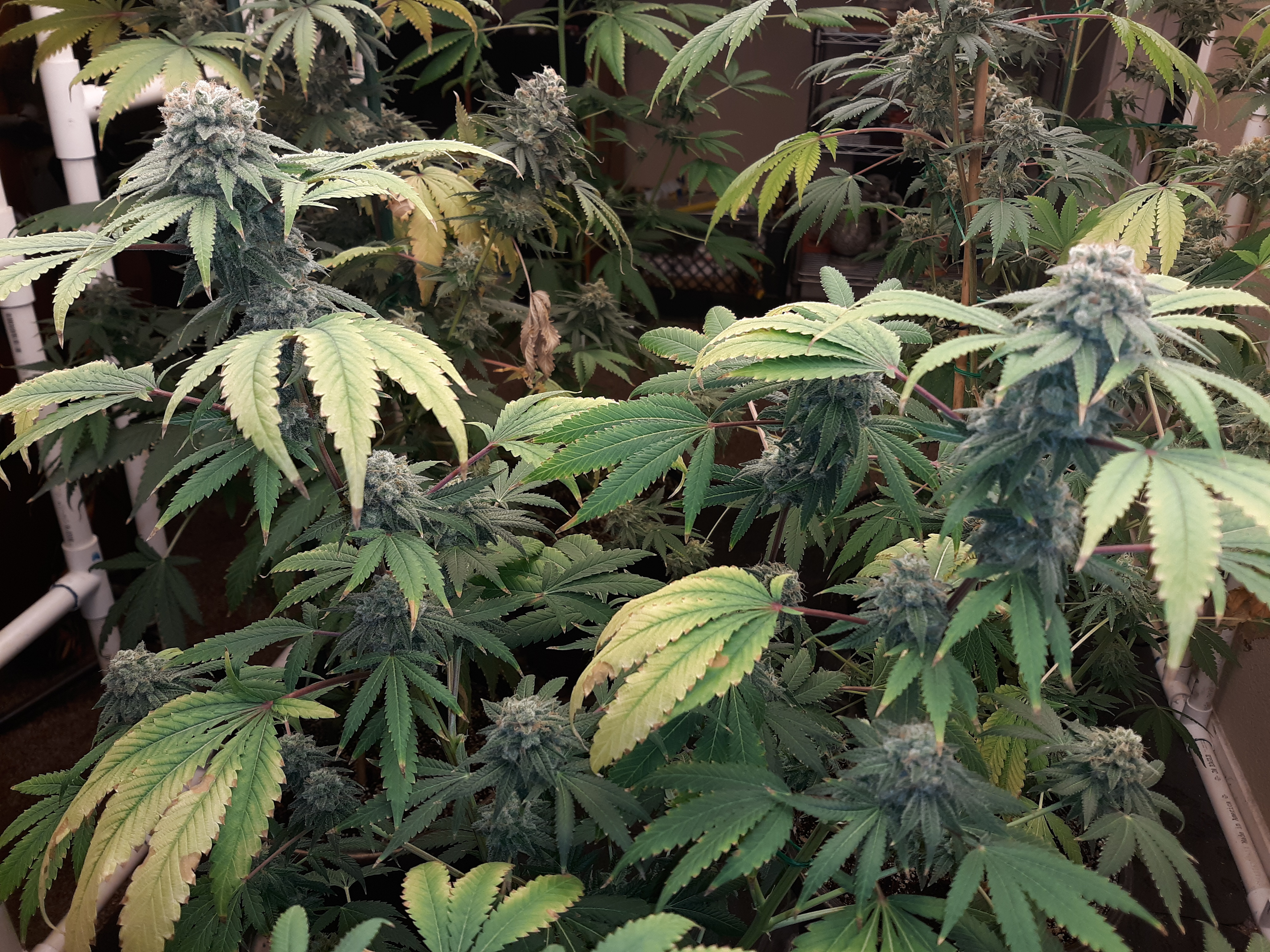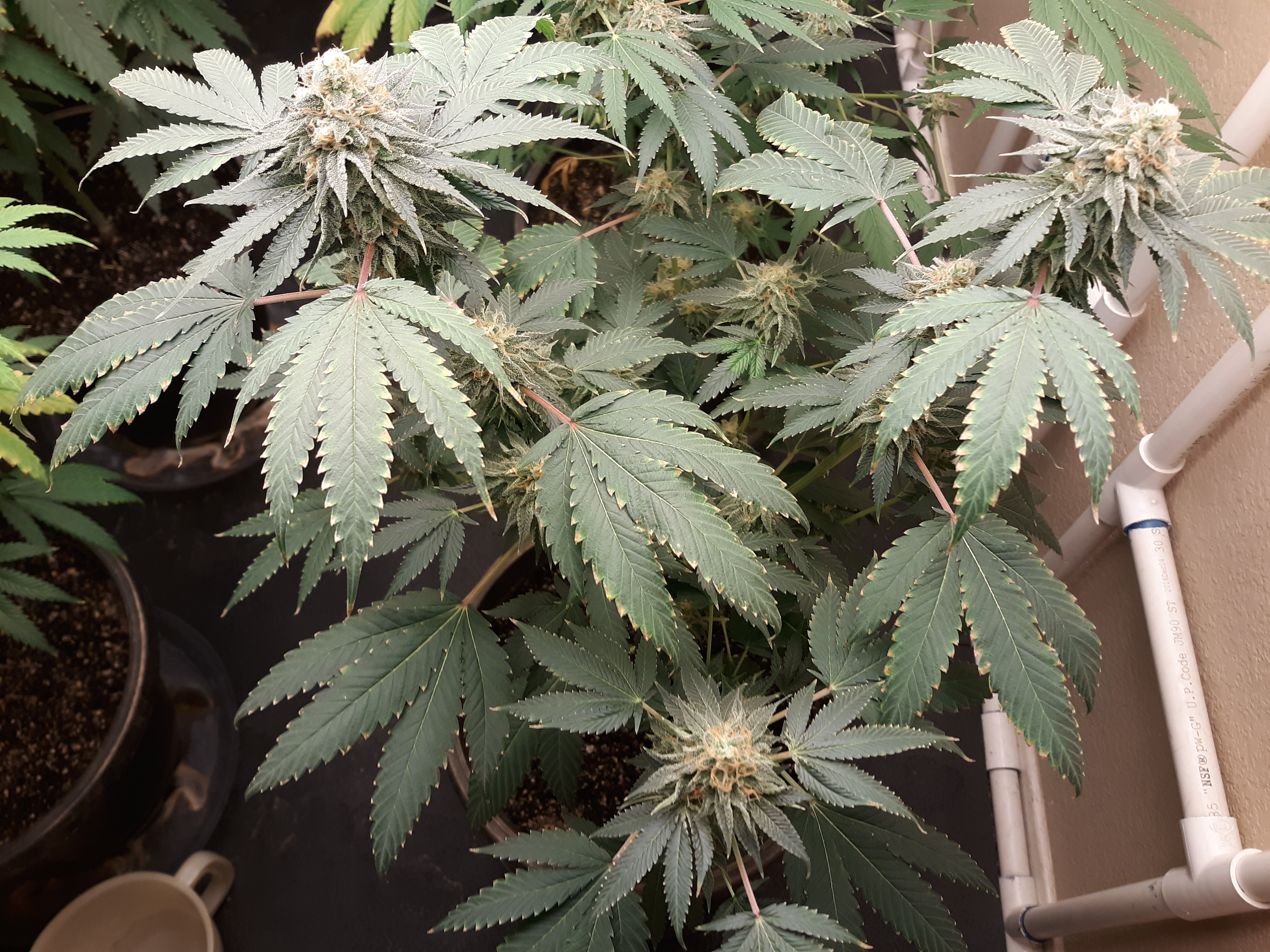 The others are for sure all Sativa and at different stages of maturity (these are at 8 weeks and 1 day into flower as well). There was 1 Sativa I did trim up (lower branches, wasted plant energy) at 6 weeks old, let the popcorn buds dry in a tray for a couple of days and WOW!!! The flavor, taste, smell, and burnability was all 5 stars!!! No choking or hacking, smooth to the palate. And what a buzz! Wake up smiling, ready to go!!! And the buzz lasts quite a long time!!!