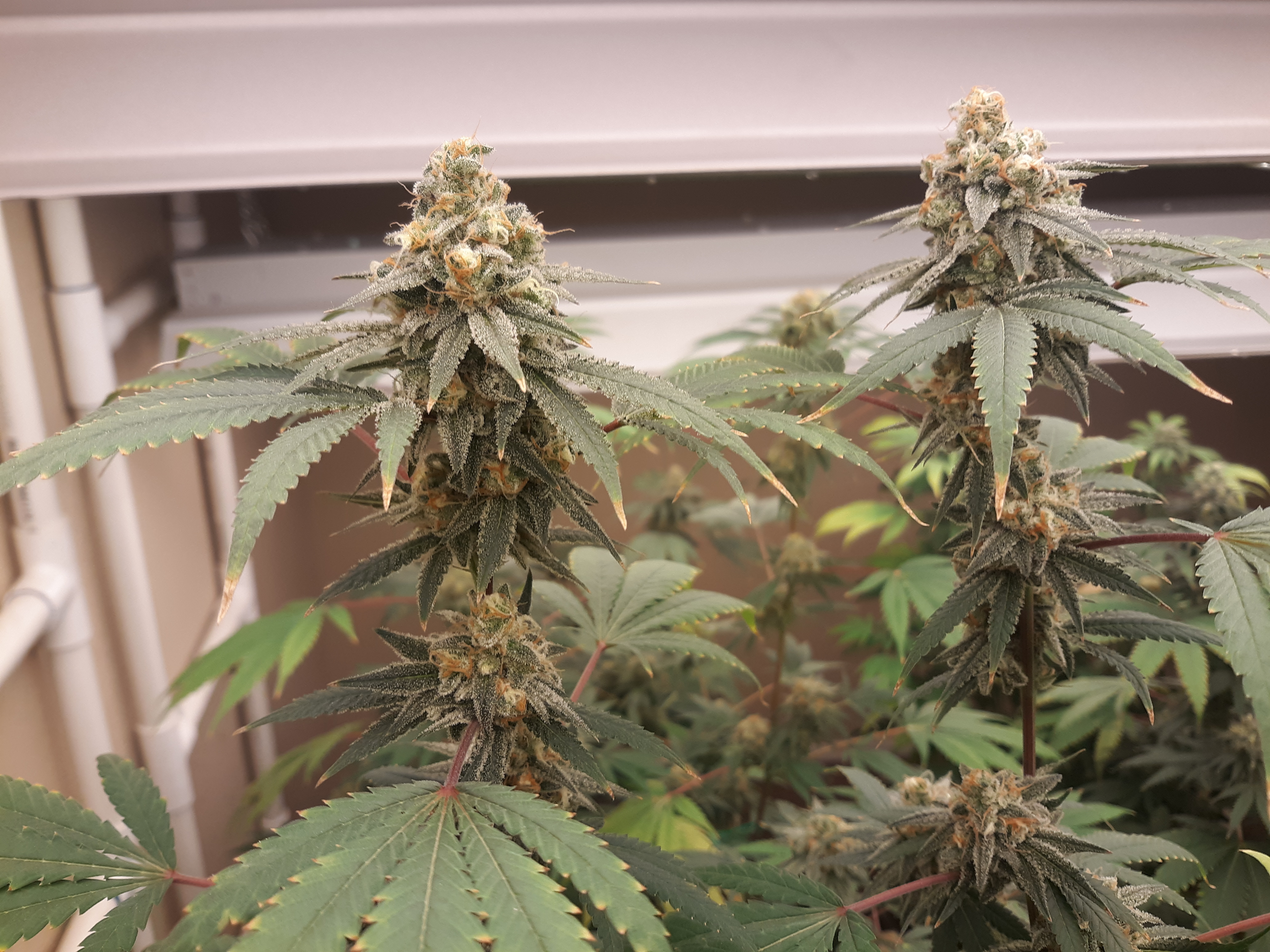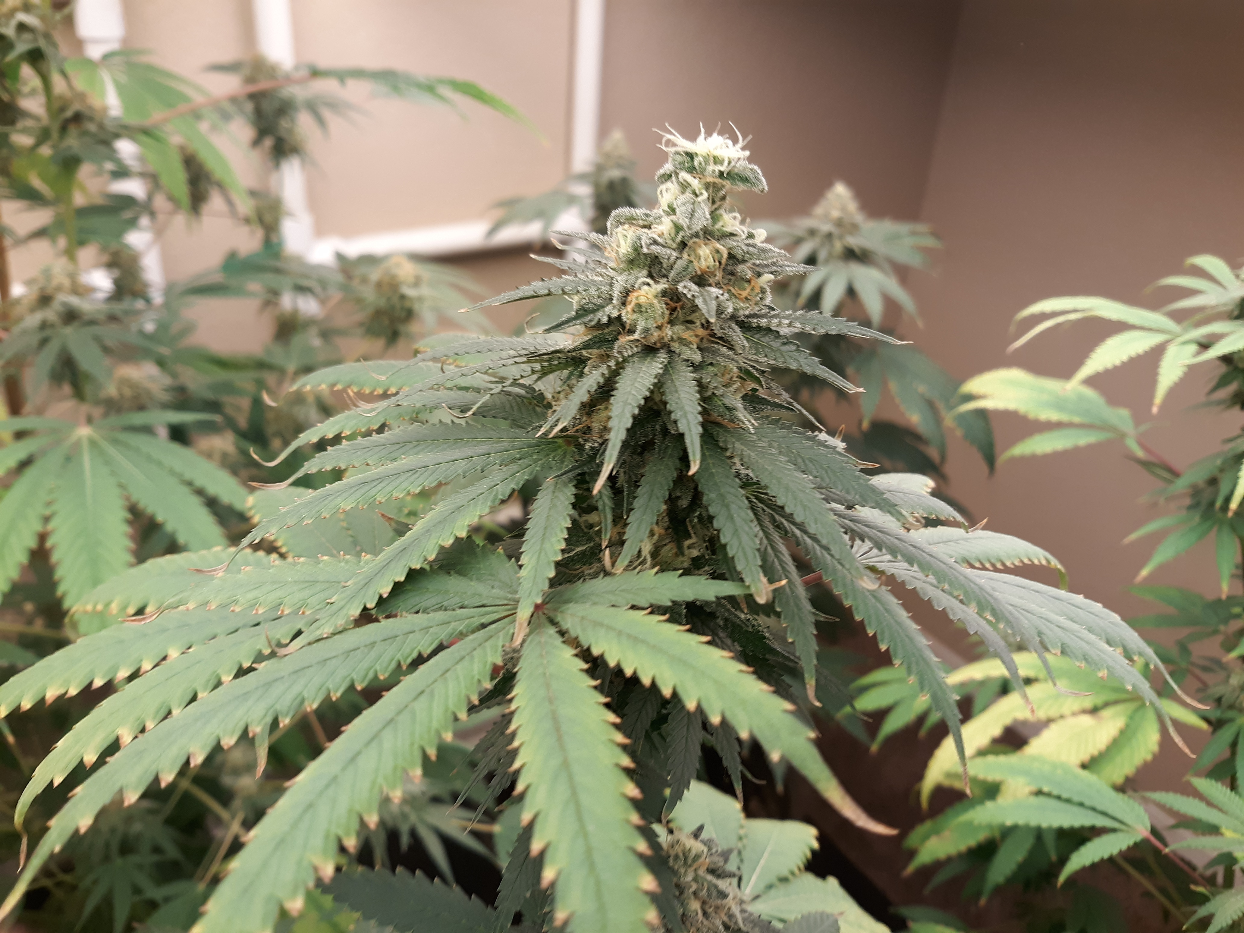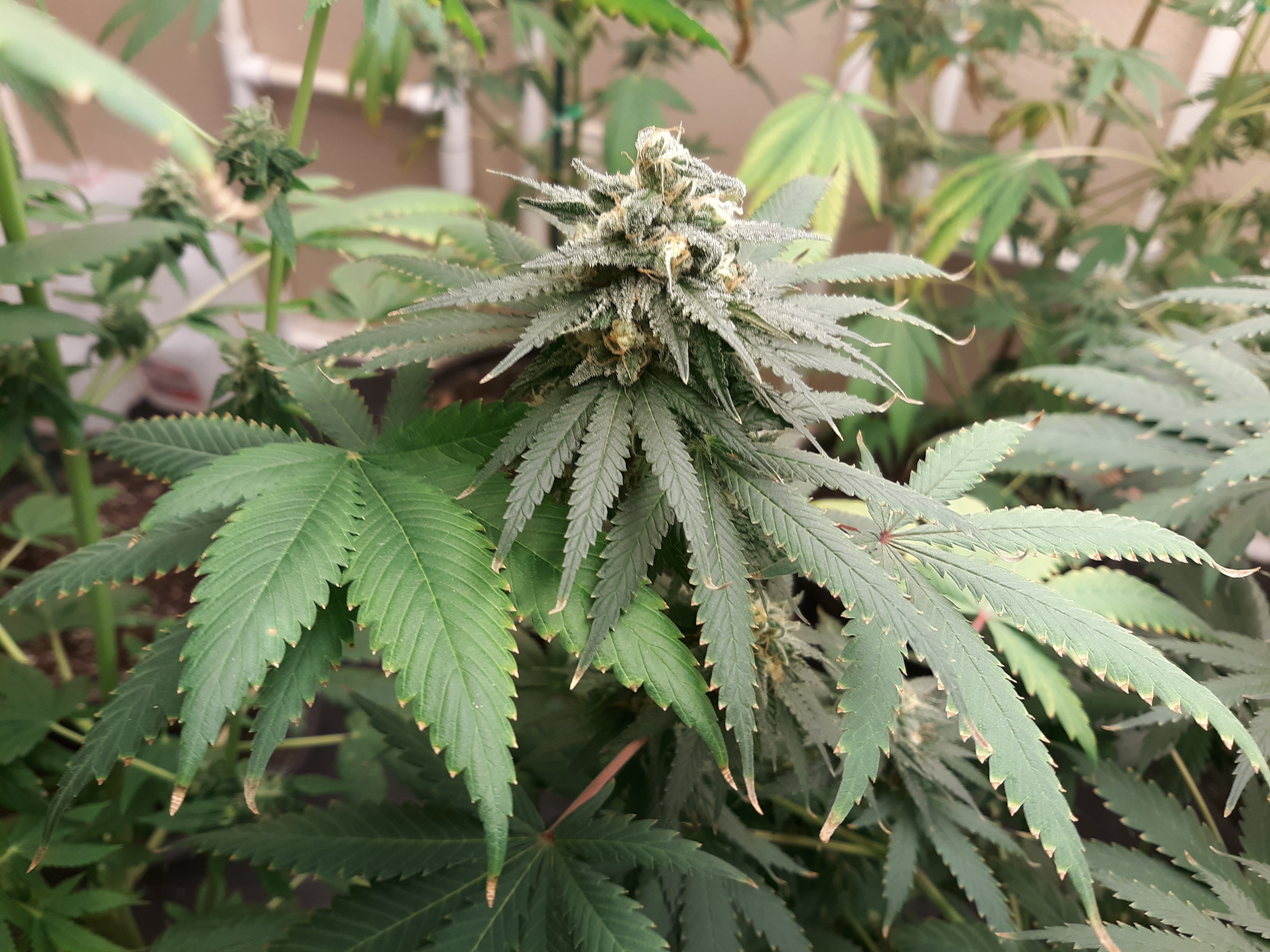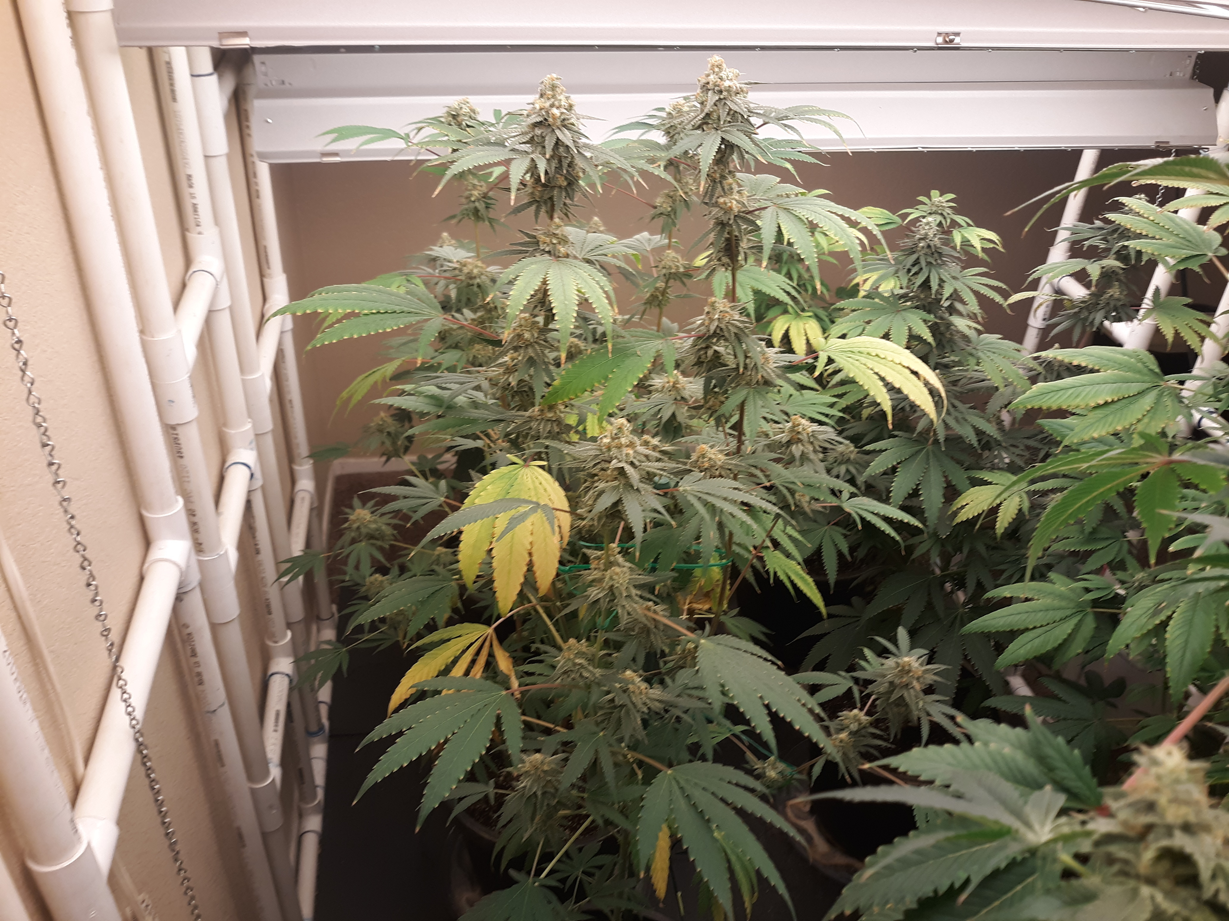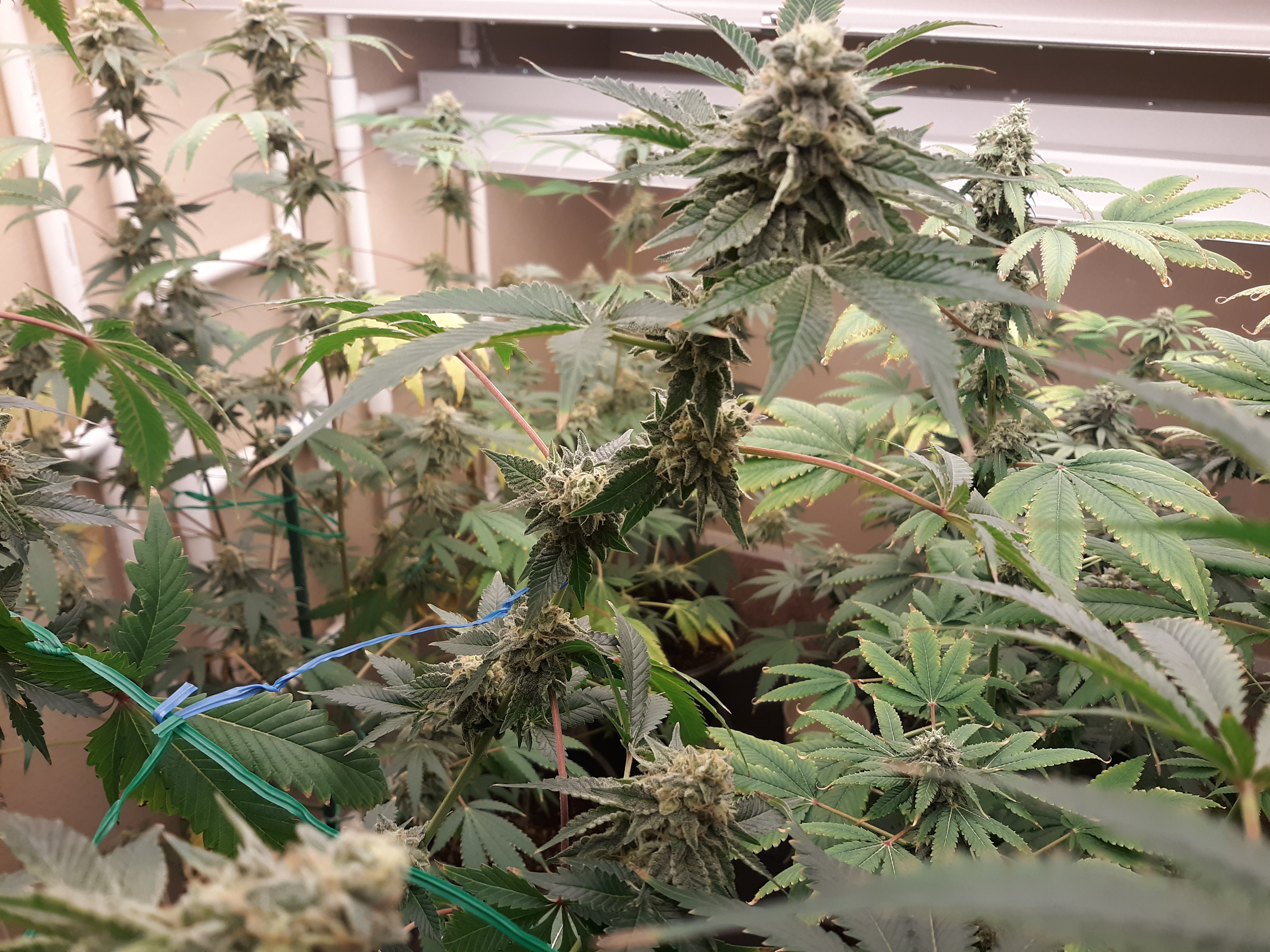 The others are for sure all Sativa and at different stages of maturity (these are at 8 weeks and 1 day into flower as well). There was 1 Sativa I did trim up (lower branches, wasted plant energy) at 6 weeks old, let the popcorn buds dry in a tray for a couple of days and WOW!!! The flavor, taste, smell, and burnability was all 5 stars!!! No choking or hacking, smooth to the palate. And what a buzz! Wake up smiling, ready to go!!! And the buzz lasts quite a long time!!!