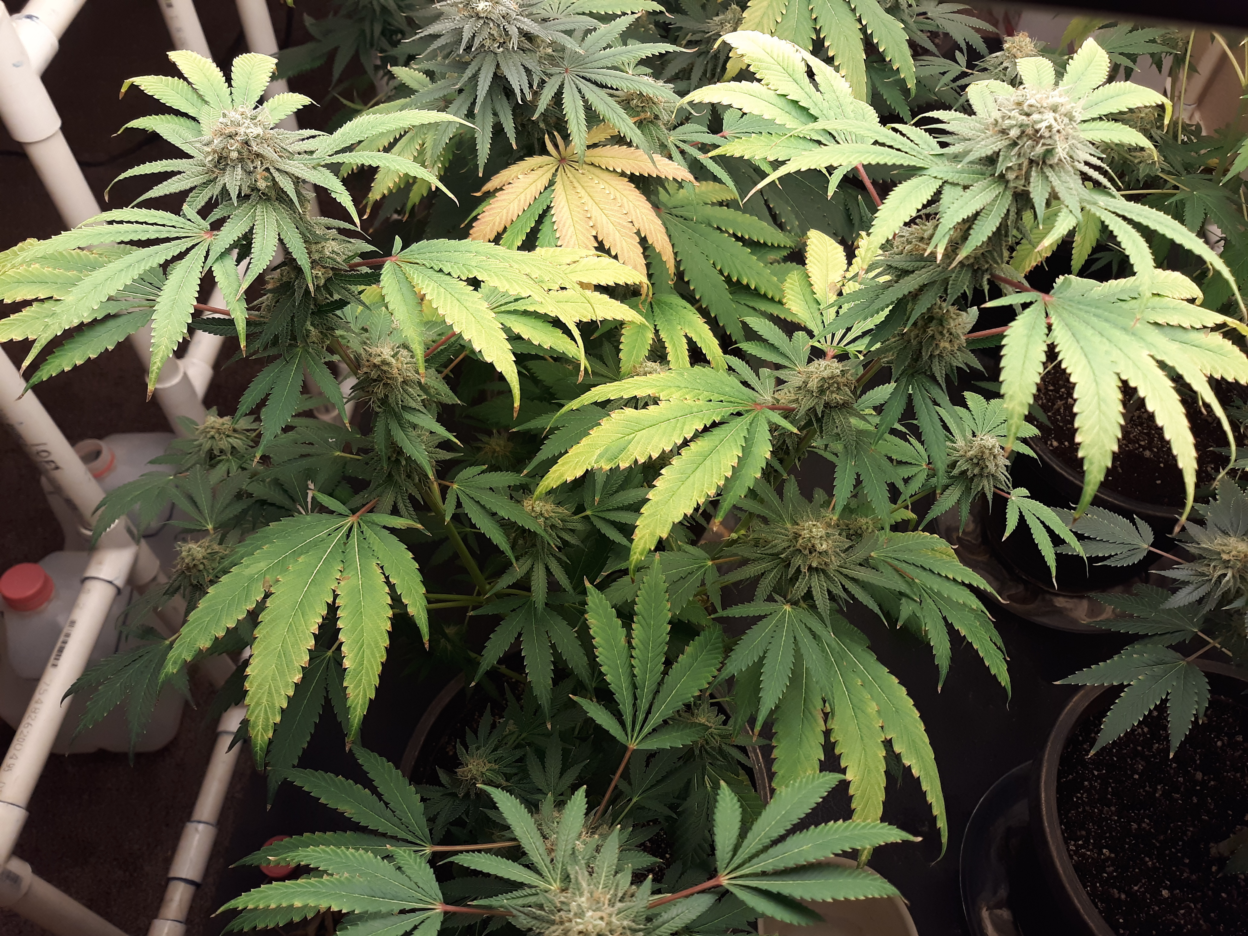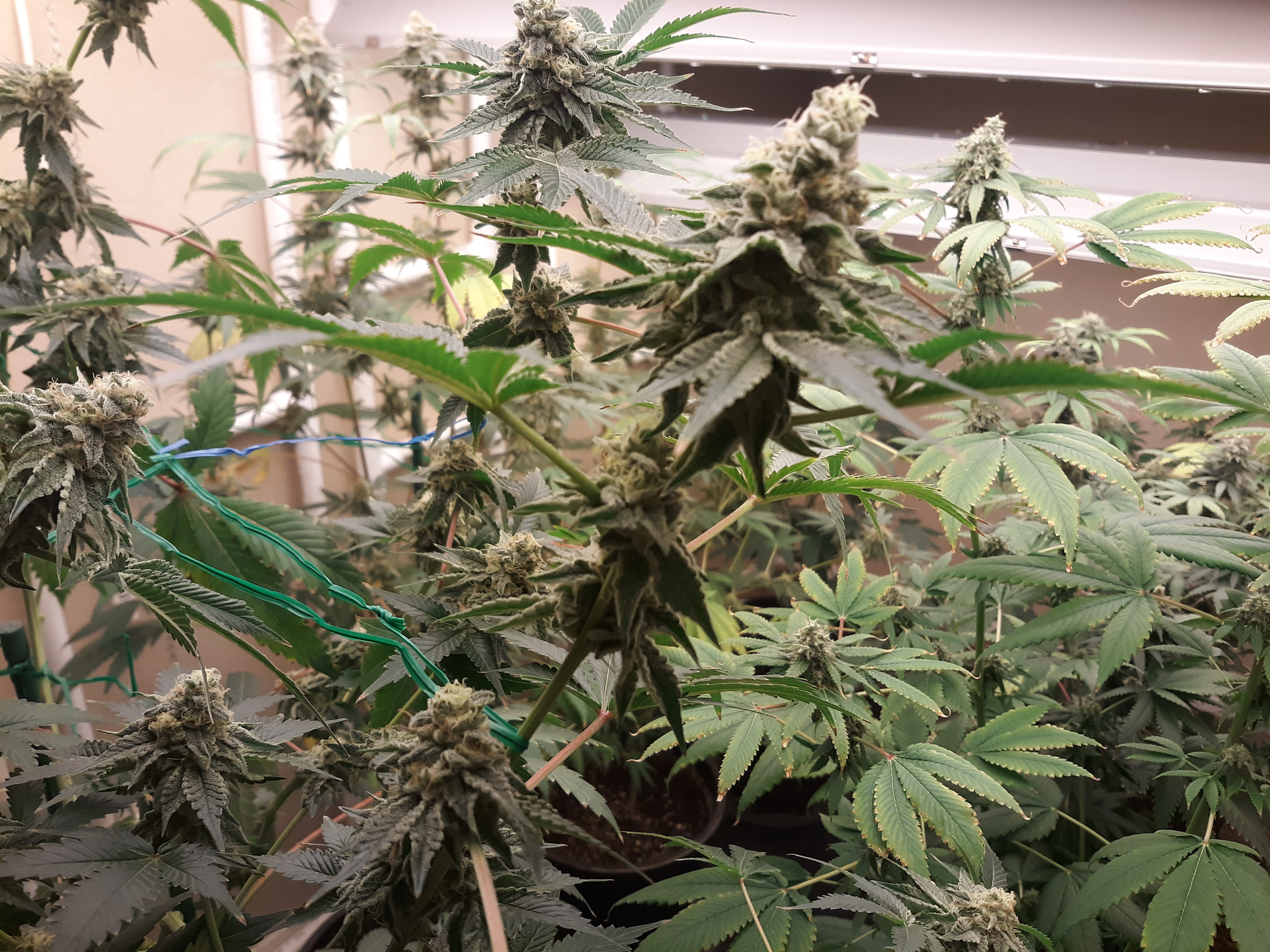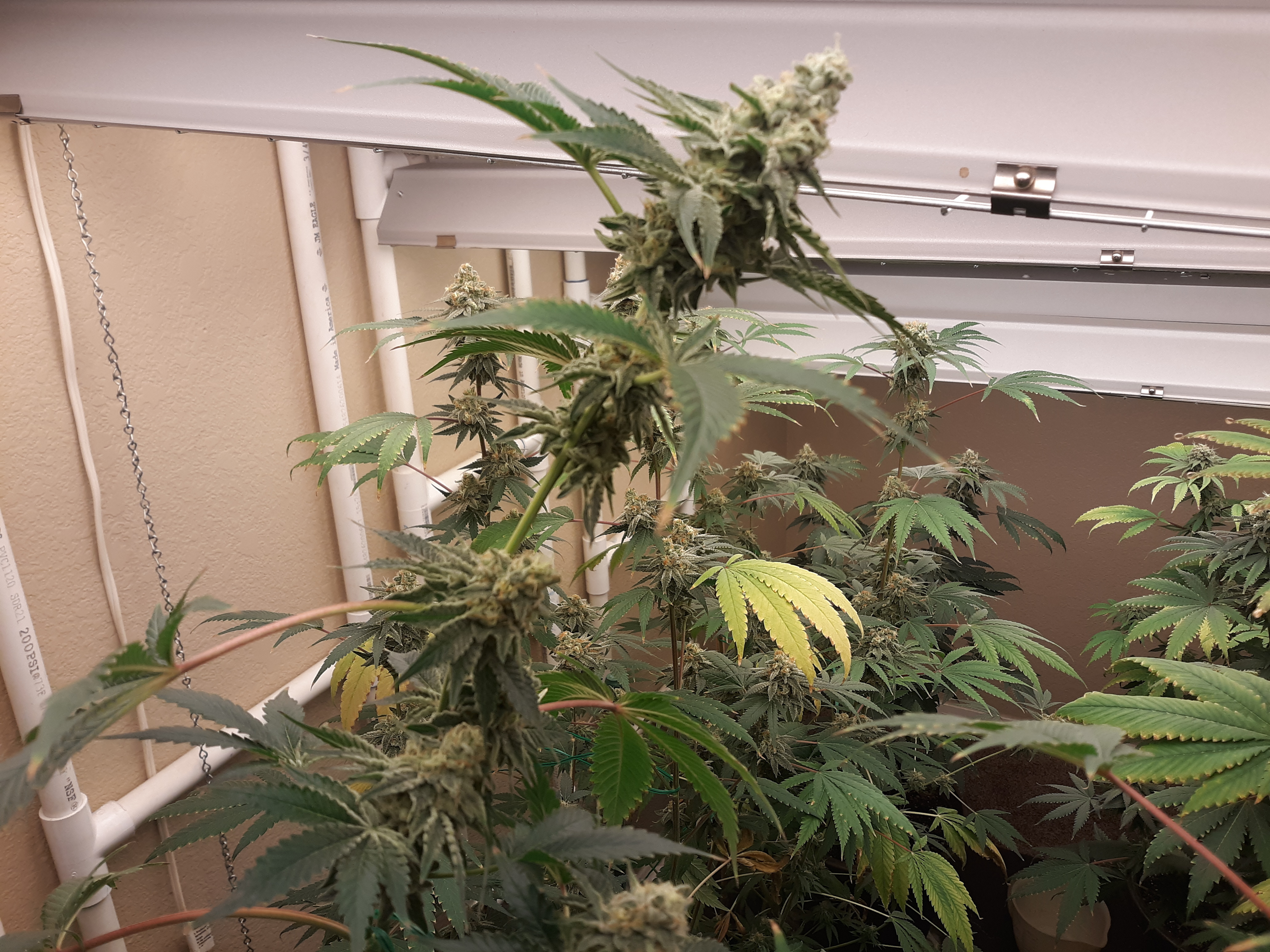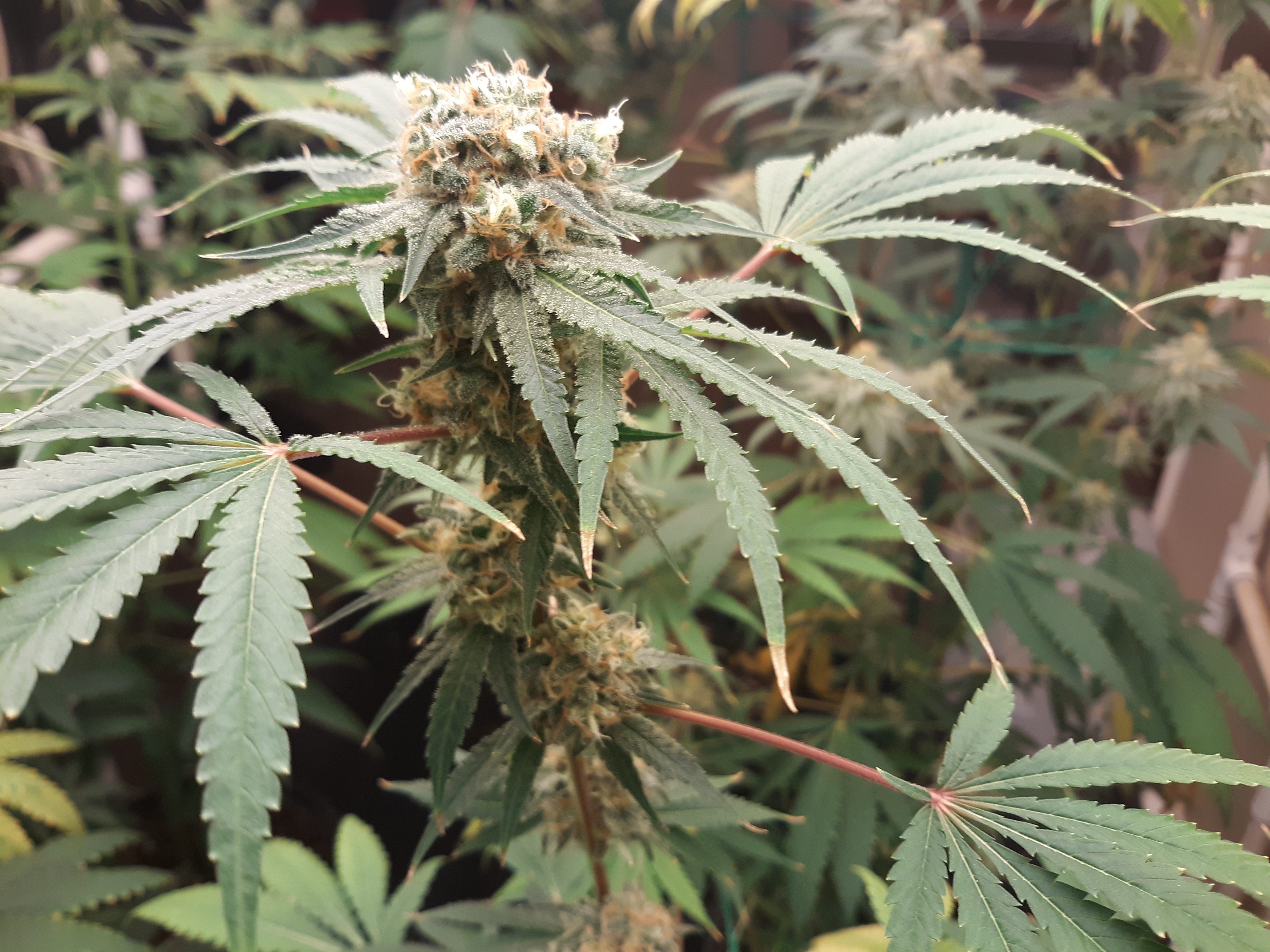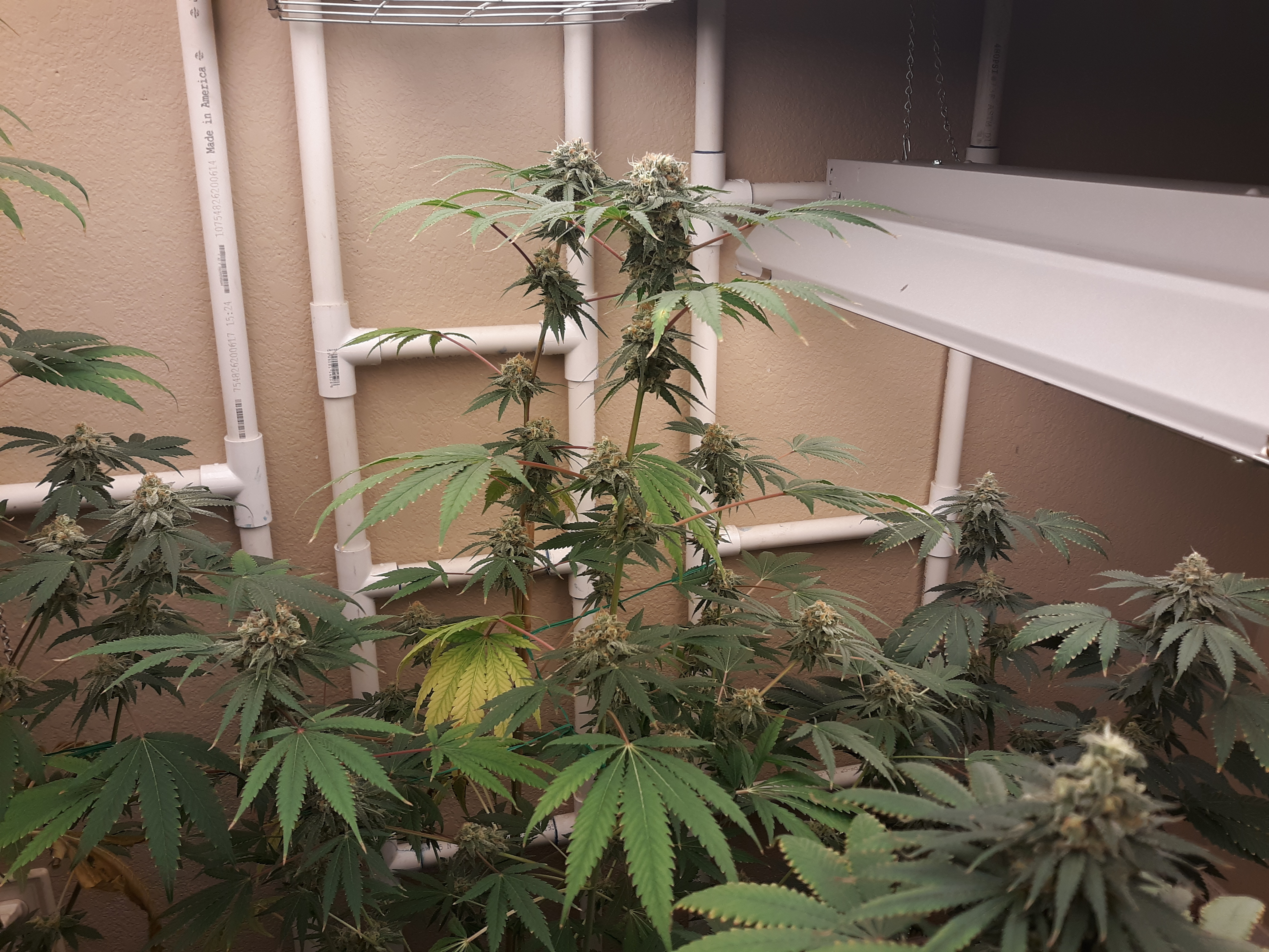 The others are for sure all Sativa and at different stages of maturity (these are at 8 weeks and 1 day into flower as well). There was 1 Sativa I did trim up (lower branches, wasted plant energy) at 6 weeks old, let the popcorn buds dry in a tray for a couple of days and WOW!!! The flavor, taste, smell, and burnability was all 5 stars!!! No choking or hacking, smooth to the palate. And what a buzz! Wake up smiling, ready to go!!! And the buzz lasts quite a long time!!!