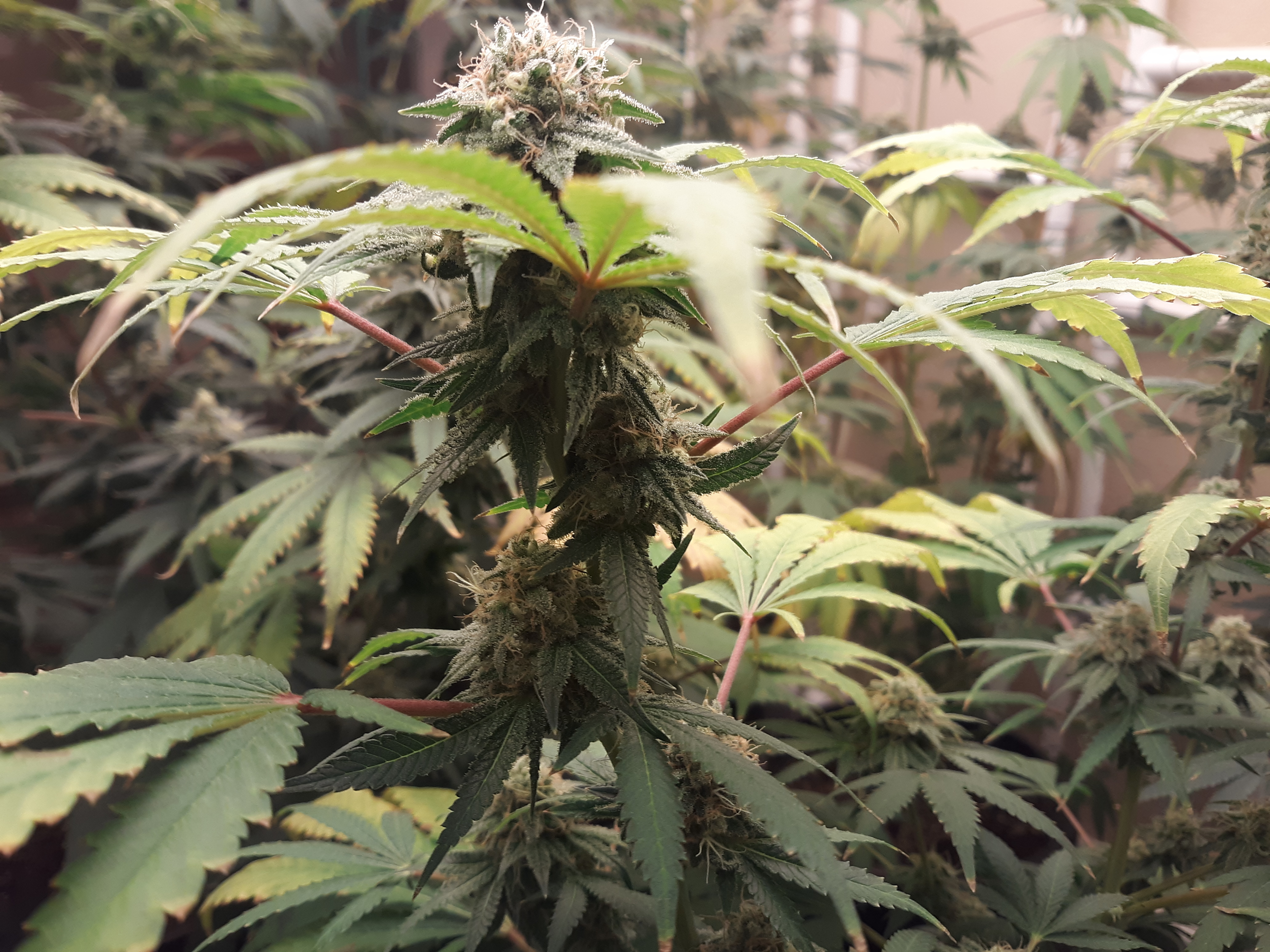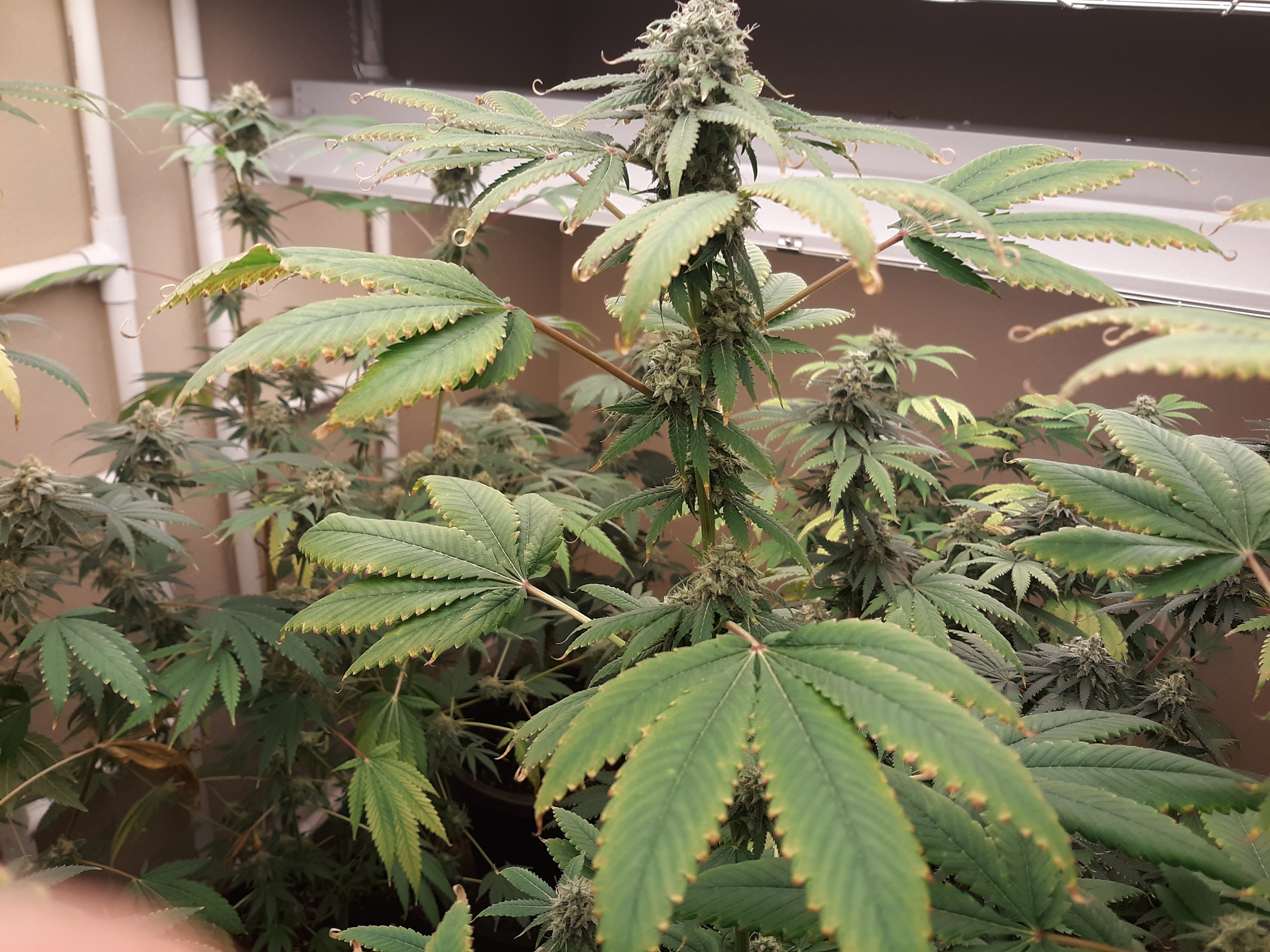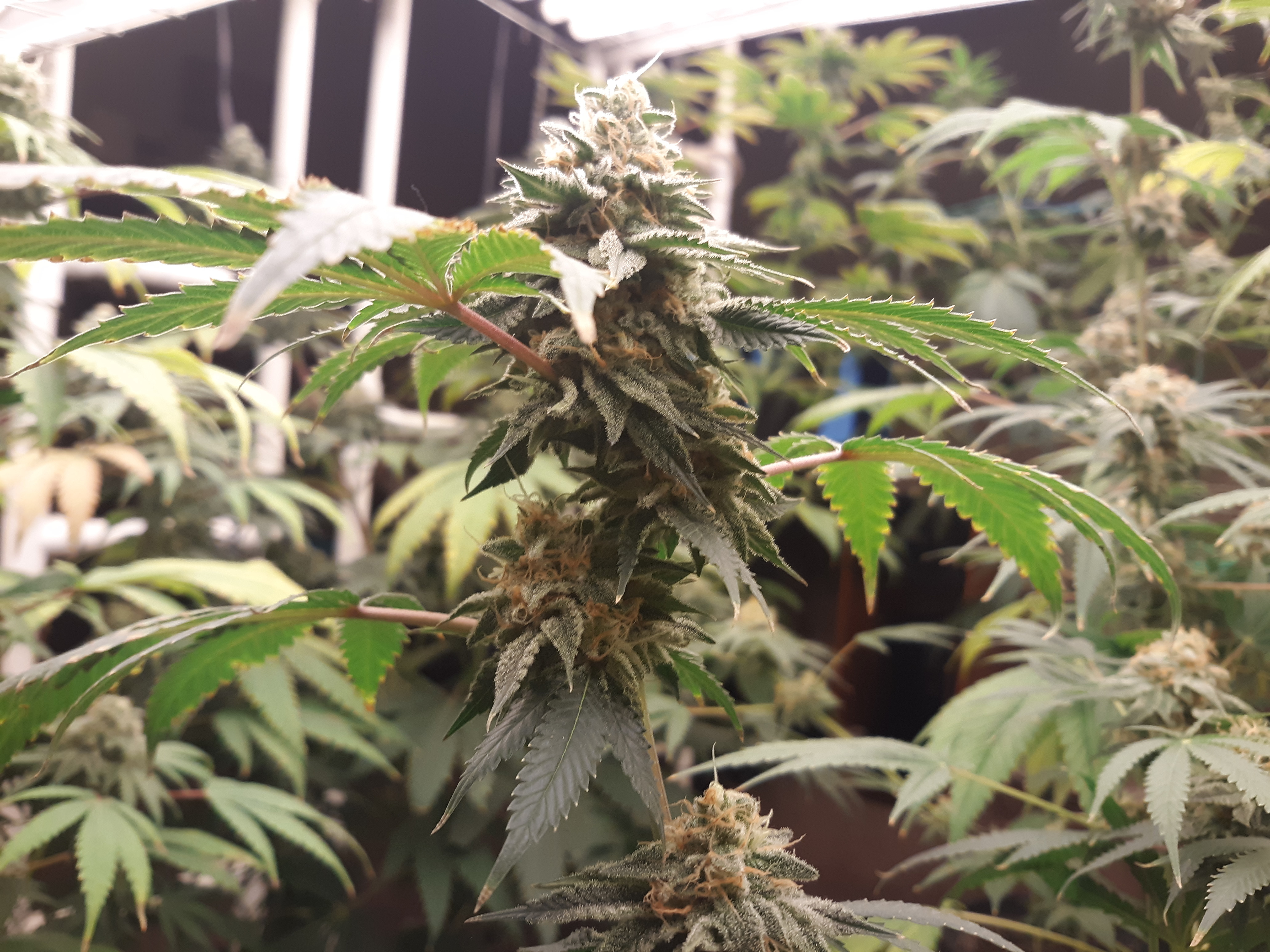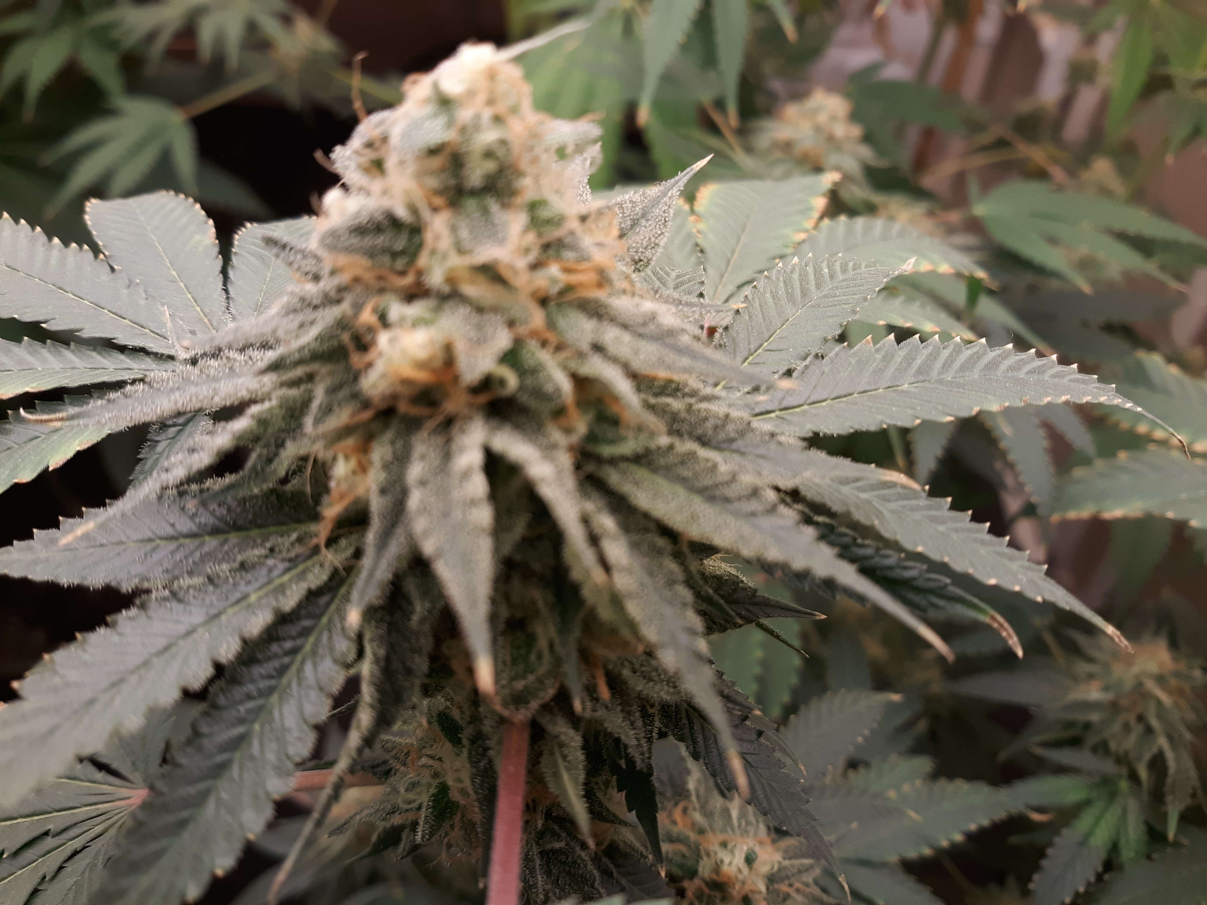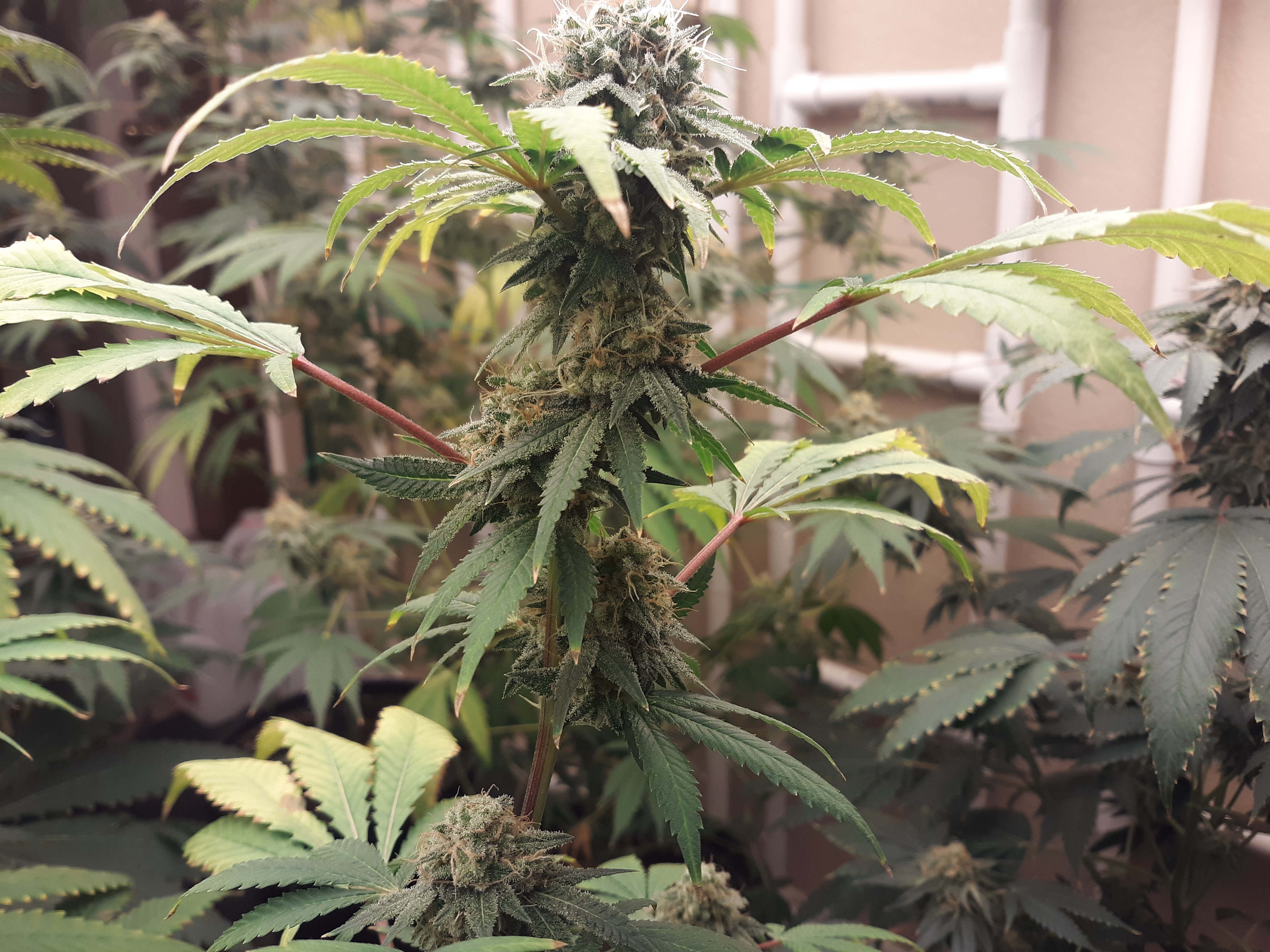 The others are for sure all Sativa and at different stages of maturity (these are at 8 weeks and 1 day into flower as well). There was 1 Sativa I did trim up (lower branches, wasted plant energy) at 6 weeks old, let the popcorn buds dry in a tray for a couple of days and WOW!!! The flavor, taste, smell, and burnability was all 5 stars!!! No choking or hacking, smooth to the palate. And what a buzz! Wake up smiling, ready to go!!! And the buzz lasts quite a long time!!!