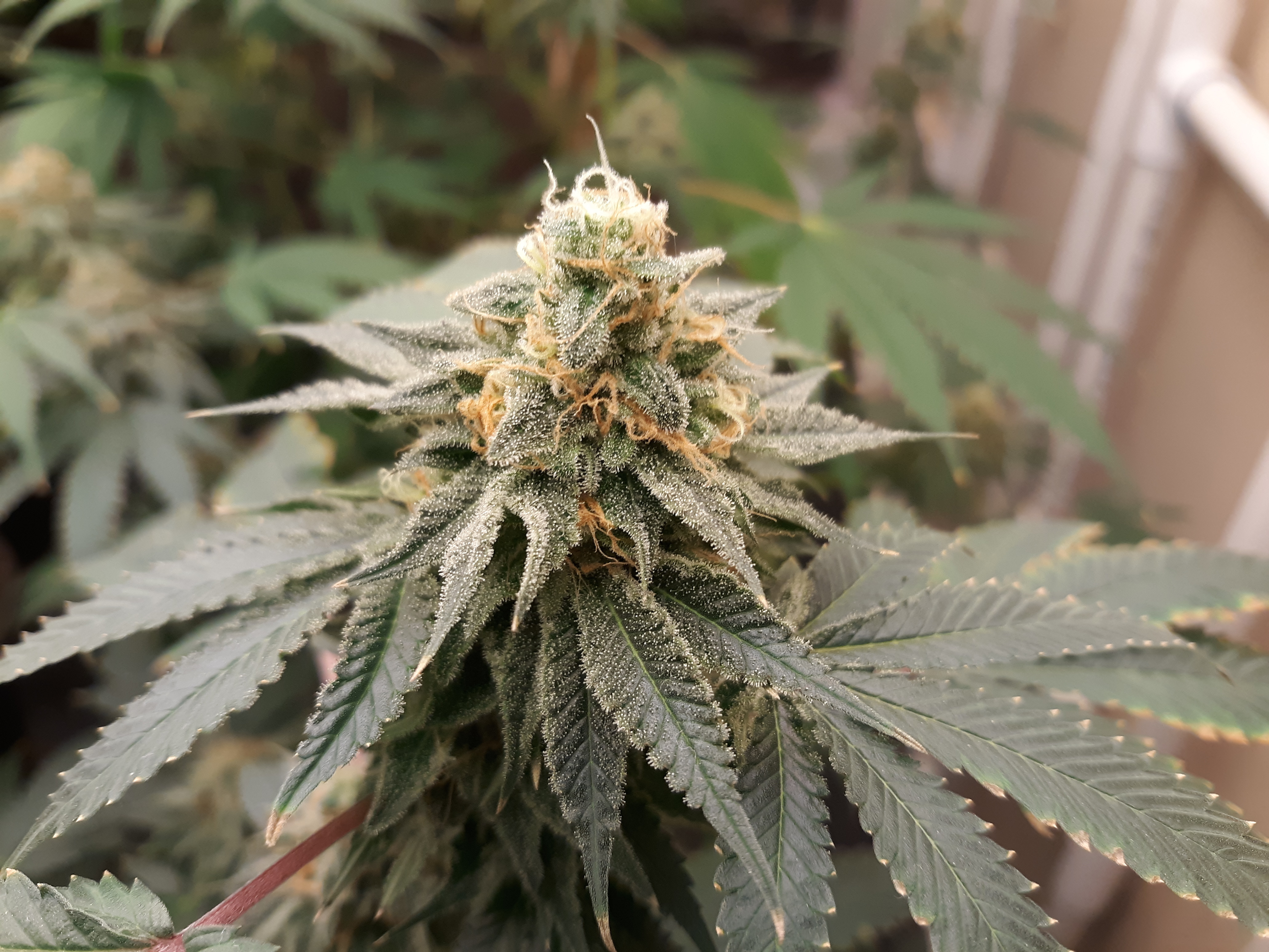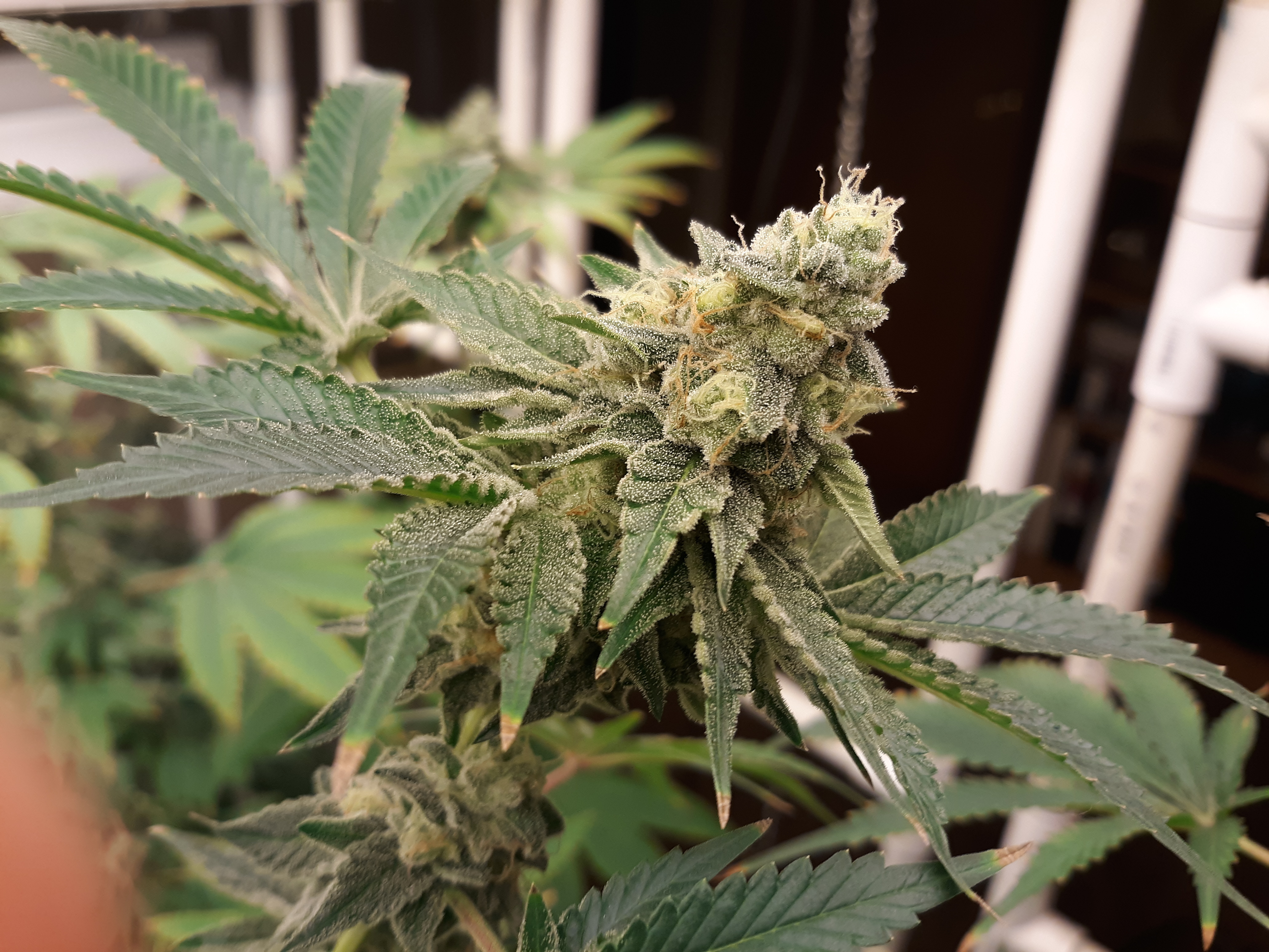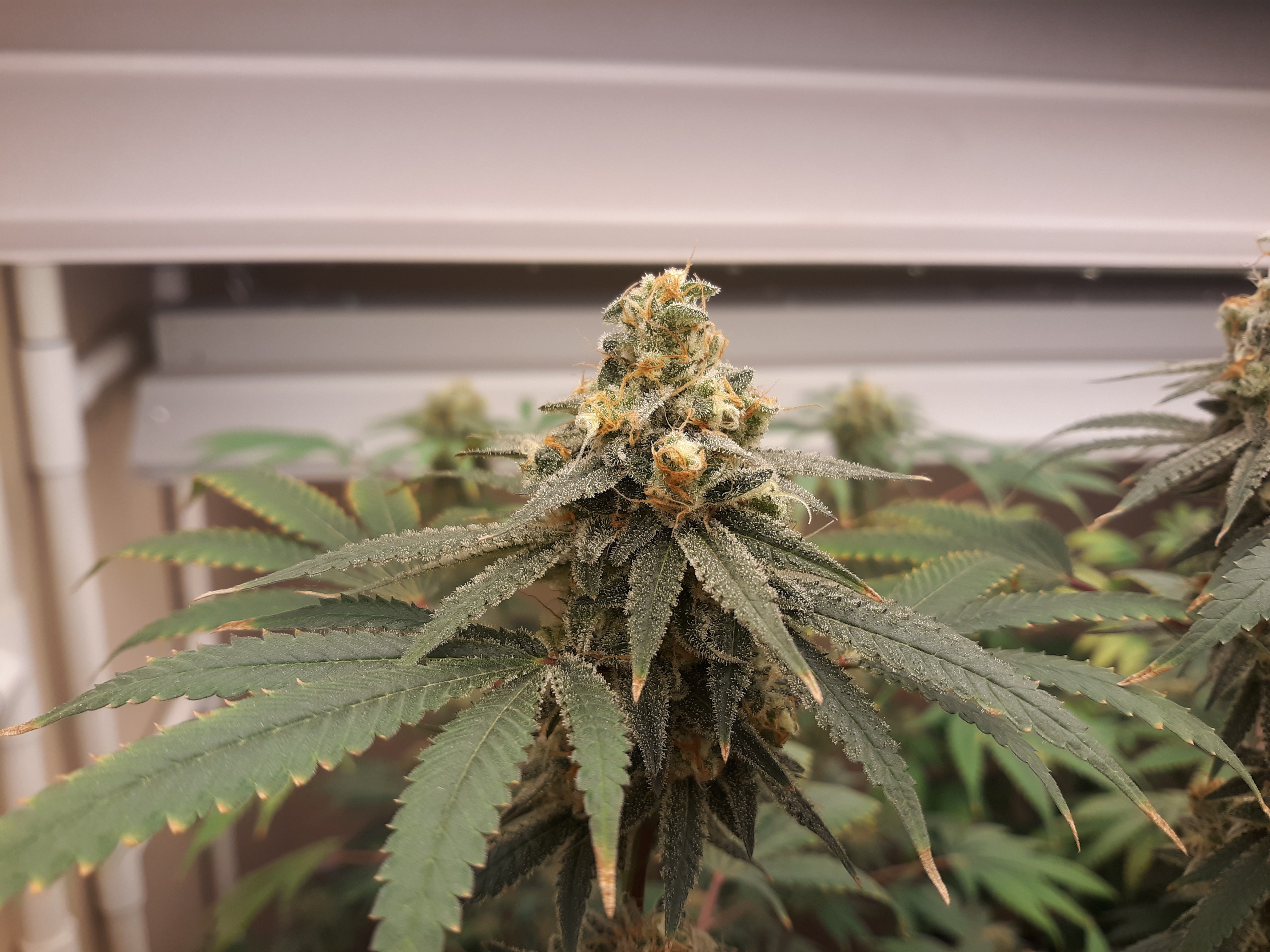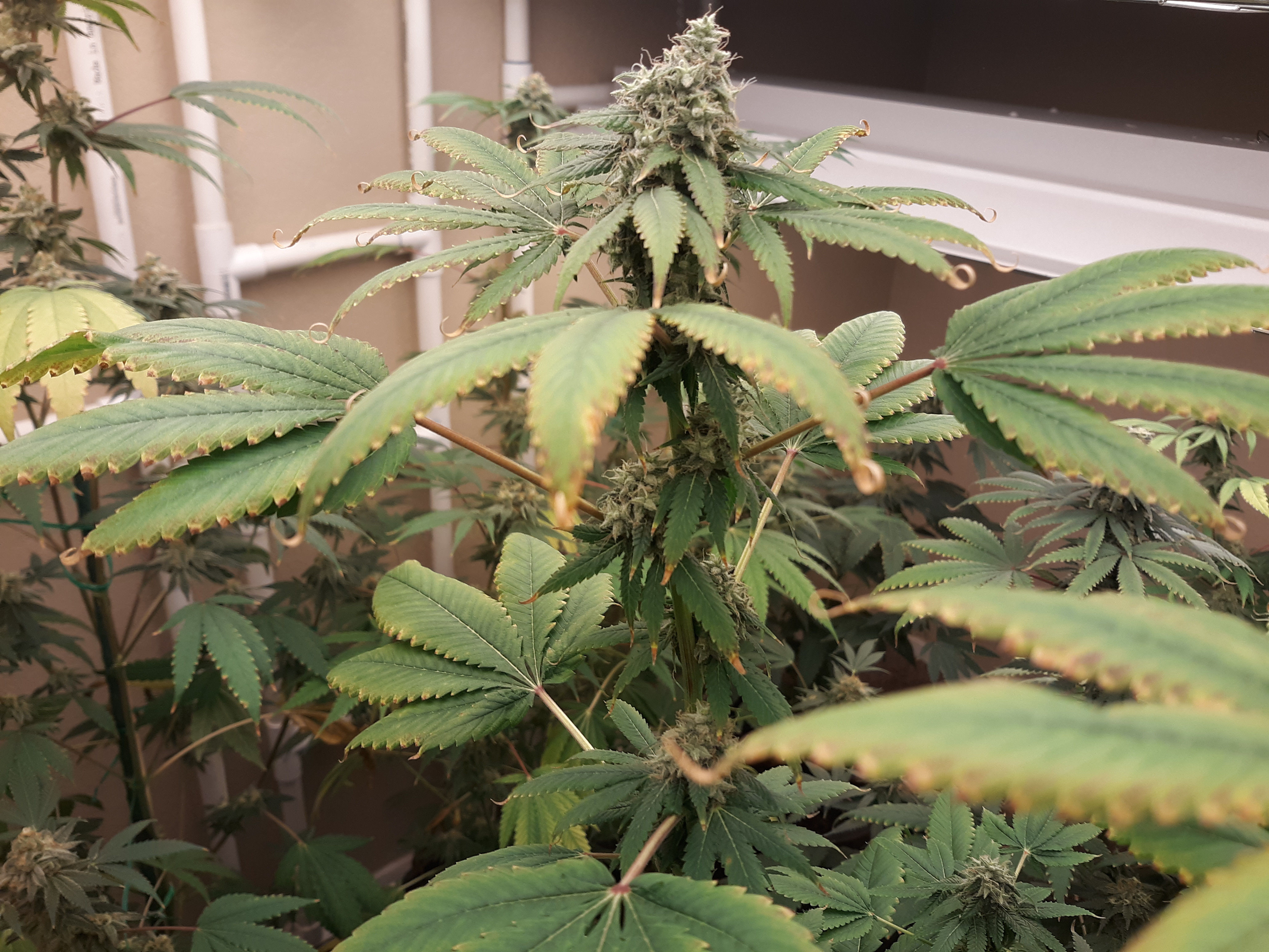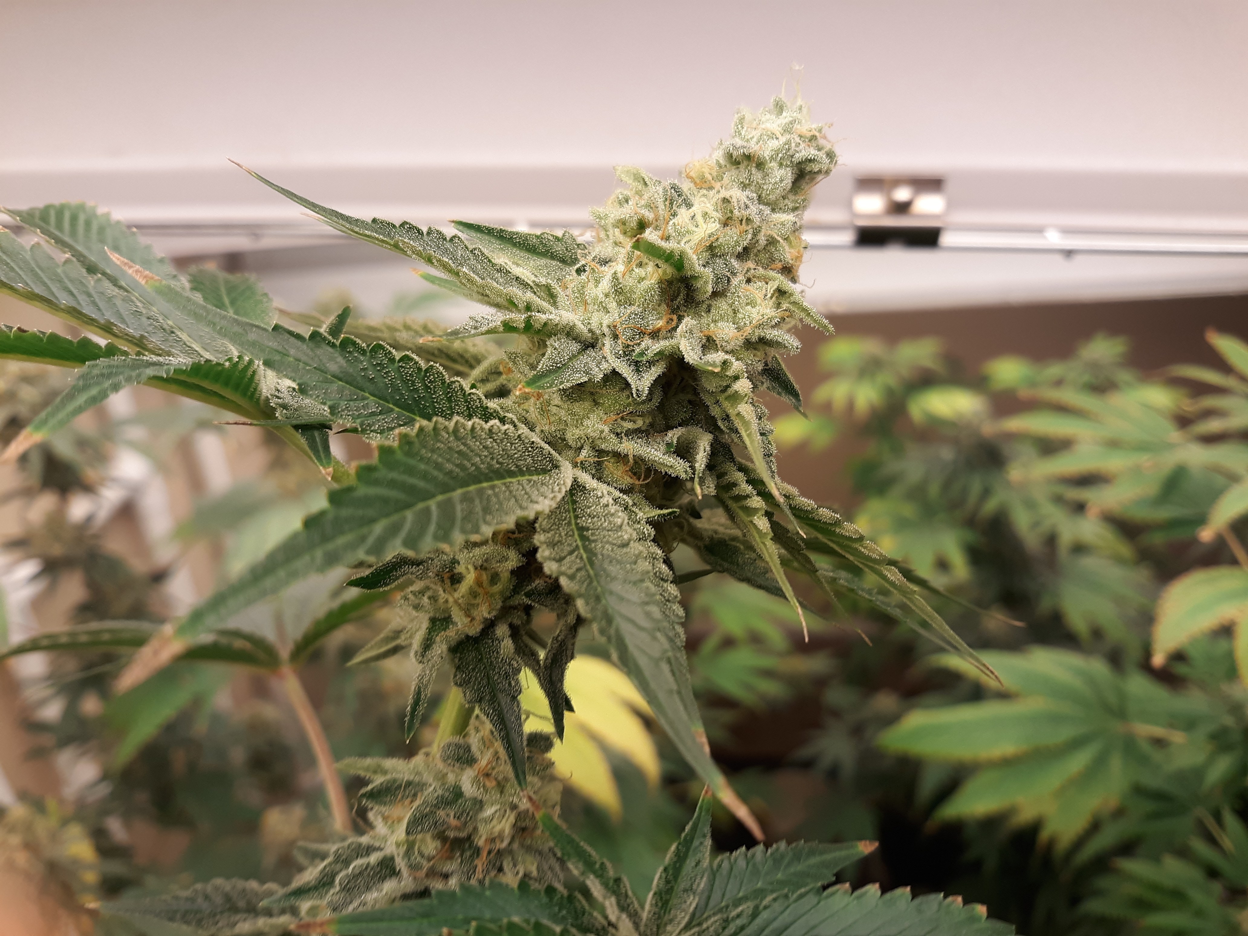 The others are for sure all Sativa and at different stages of maturity (these are at 8 weeks and 1 day into flower as well). There was 1 Sativa I did trim up (lower branches, wasted plant energy) at 6 weeks old, let the popcorn buds dry in a tray for a couple of days and WOW!!! The flavor, taste, smell, and burnability was all 5 stars!!! No choking or hacking, smooth to the palate. And what a buzz! Wake up smiling, ready to go!!! And the buzz lasts quite a long time!!!