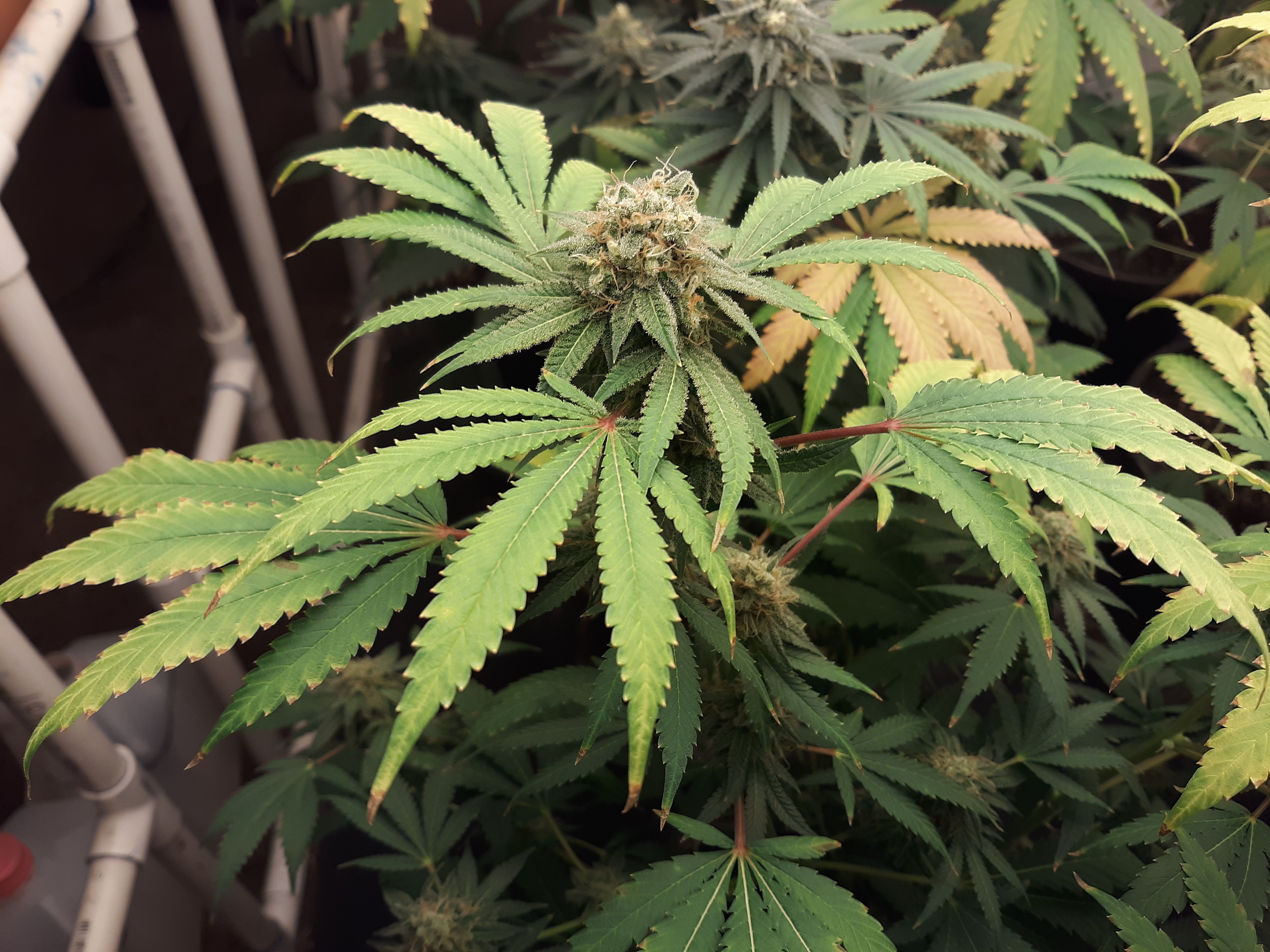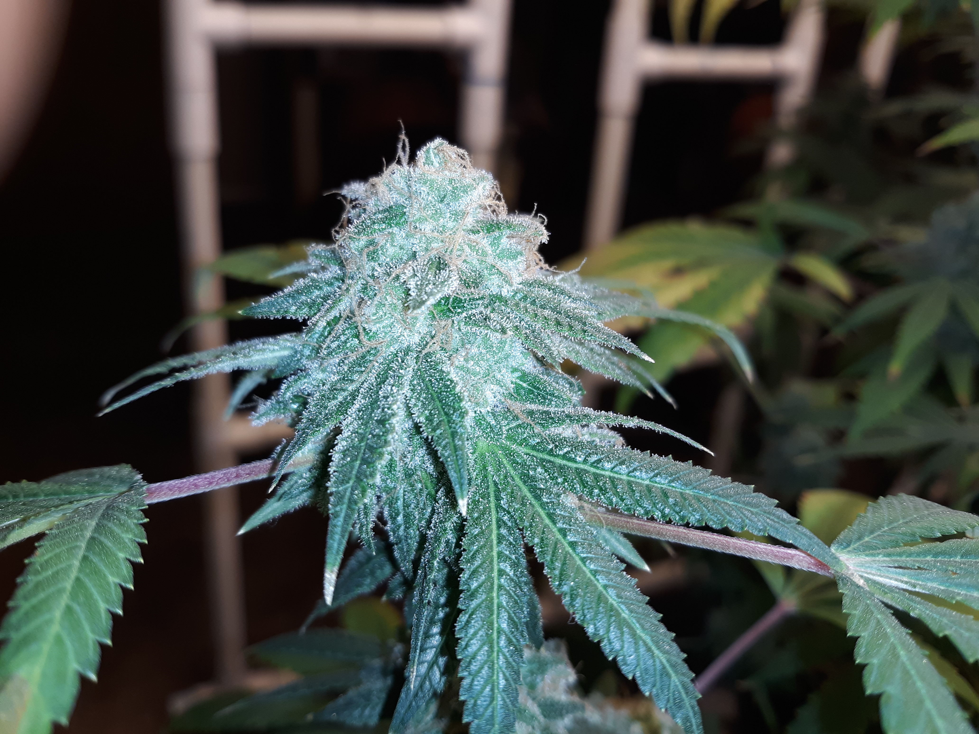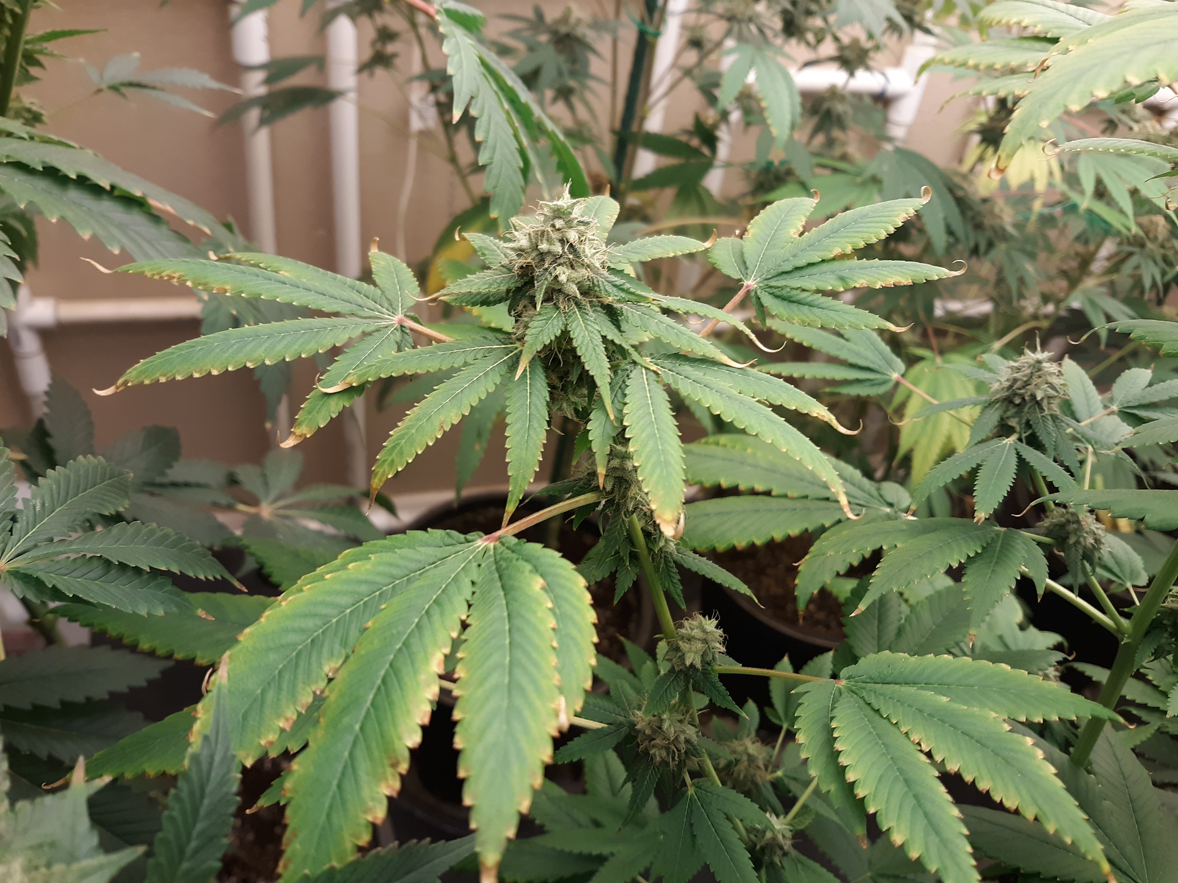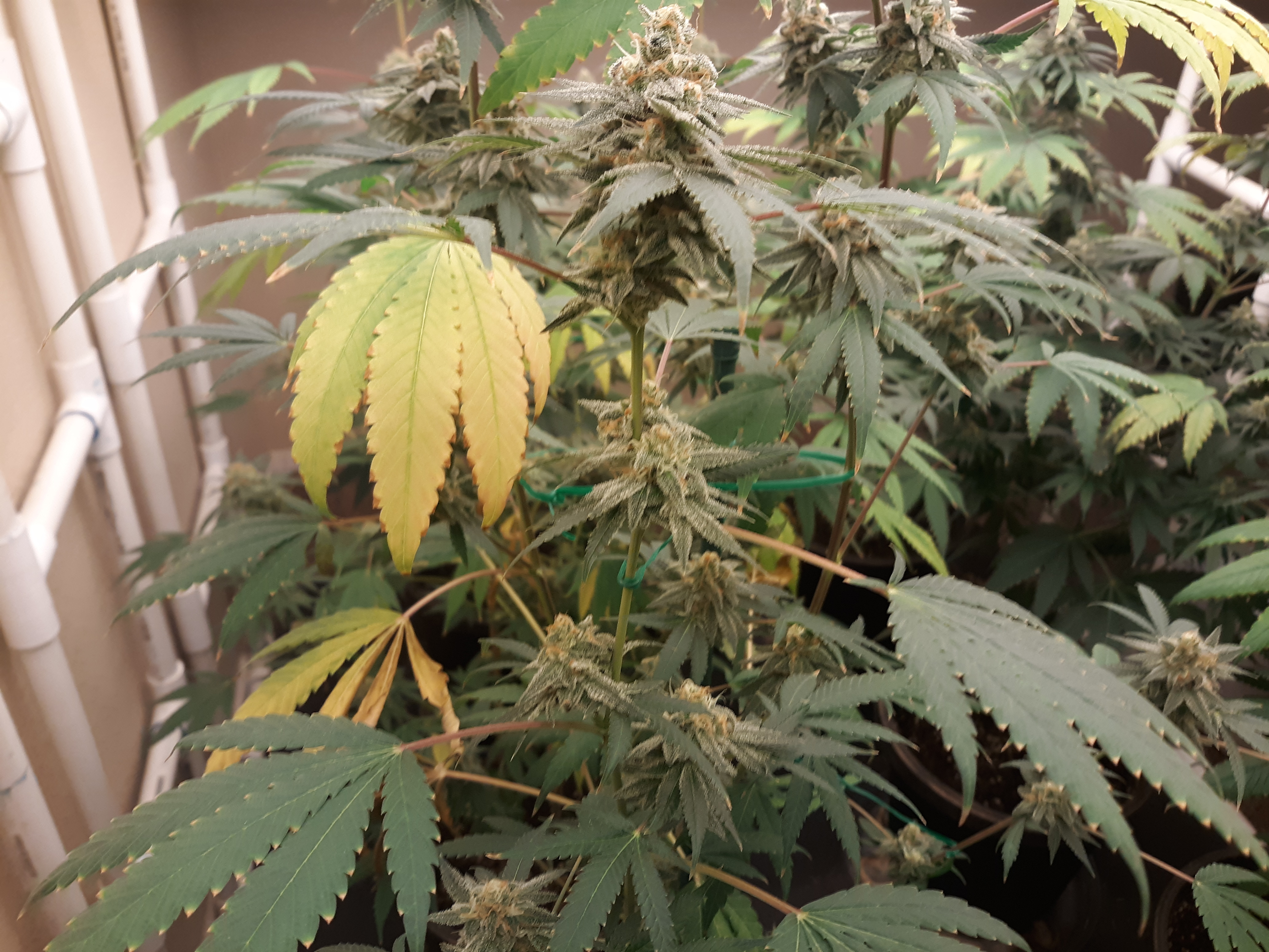 The others are for sure all Sativa and at different stages of maturity (these are at 8 weeks and 1 day into flower as well). There was 1 Sativa I did trim up (lower branches, wasted plant energy) at 6 weeks old, let the popcorn buds dry in a tray for a couple of days and WOW!!! The flavor, taste, smell, and burnability was all 5 stars!!! No choking or hacking, smooth to the palate. And what a buzz! Wake up smiling, ready to go!!! And the buzz lasts quite a long time!!!