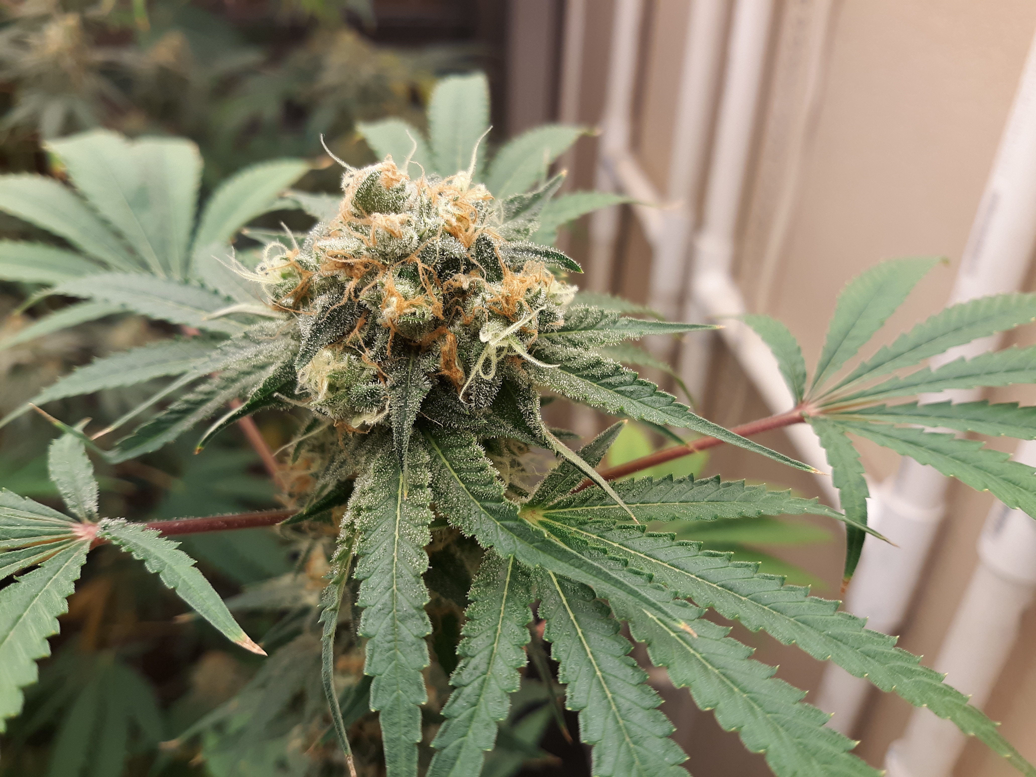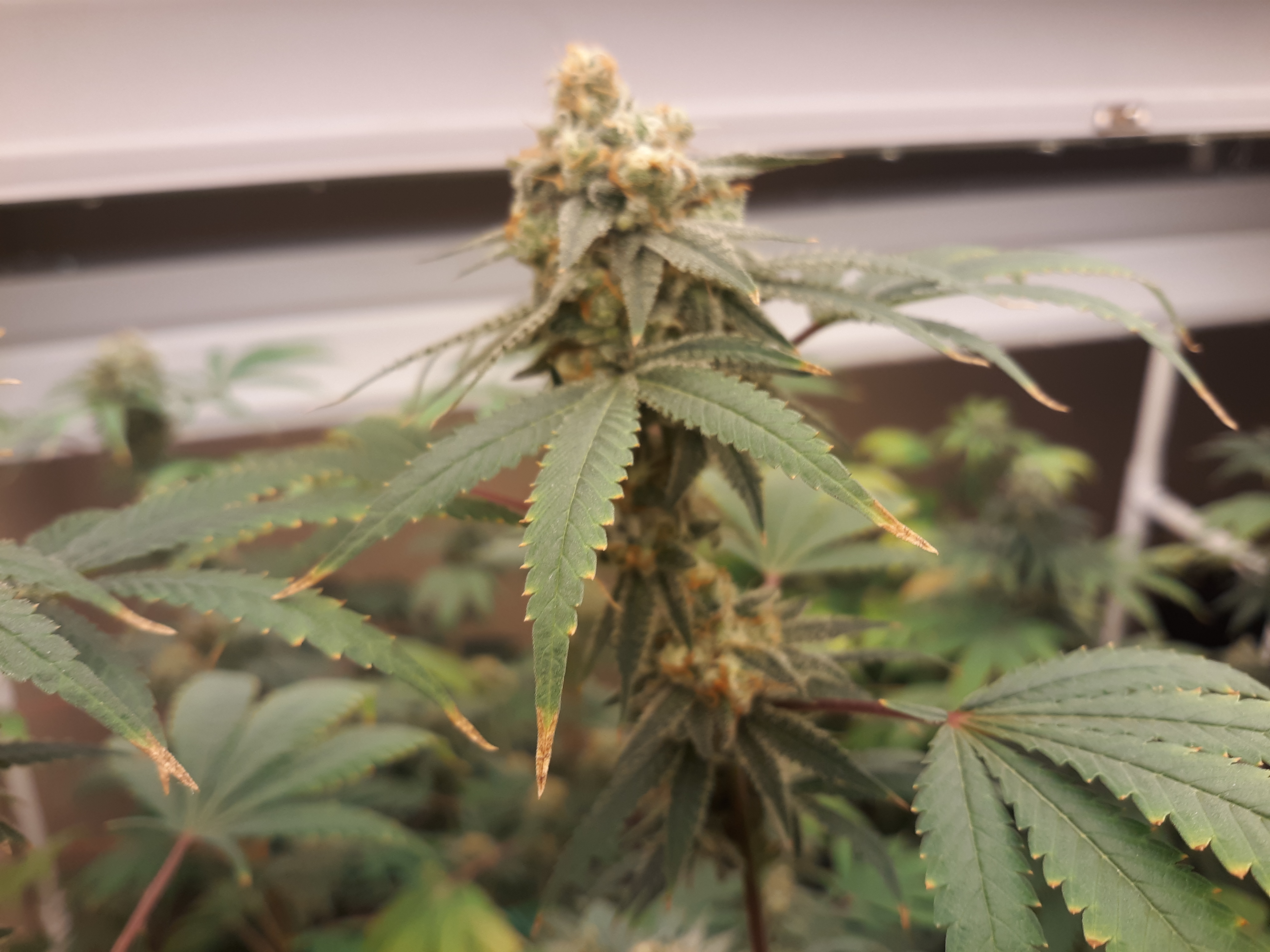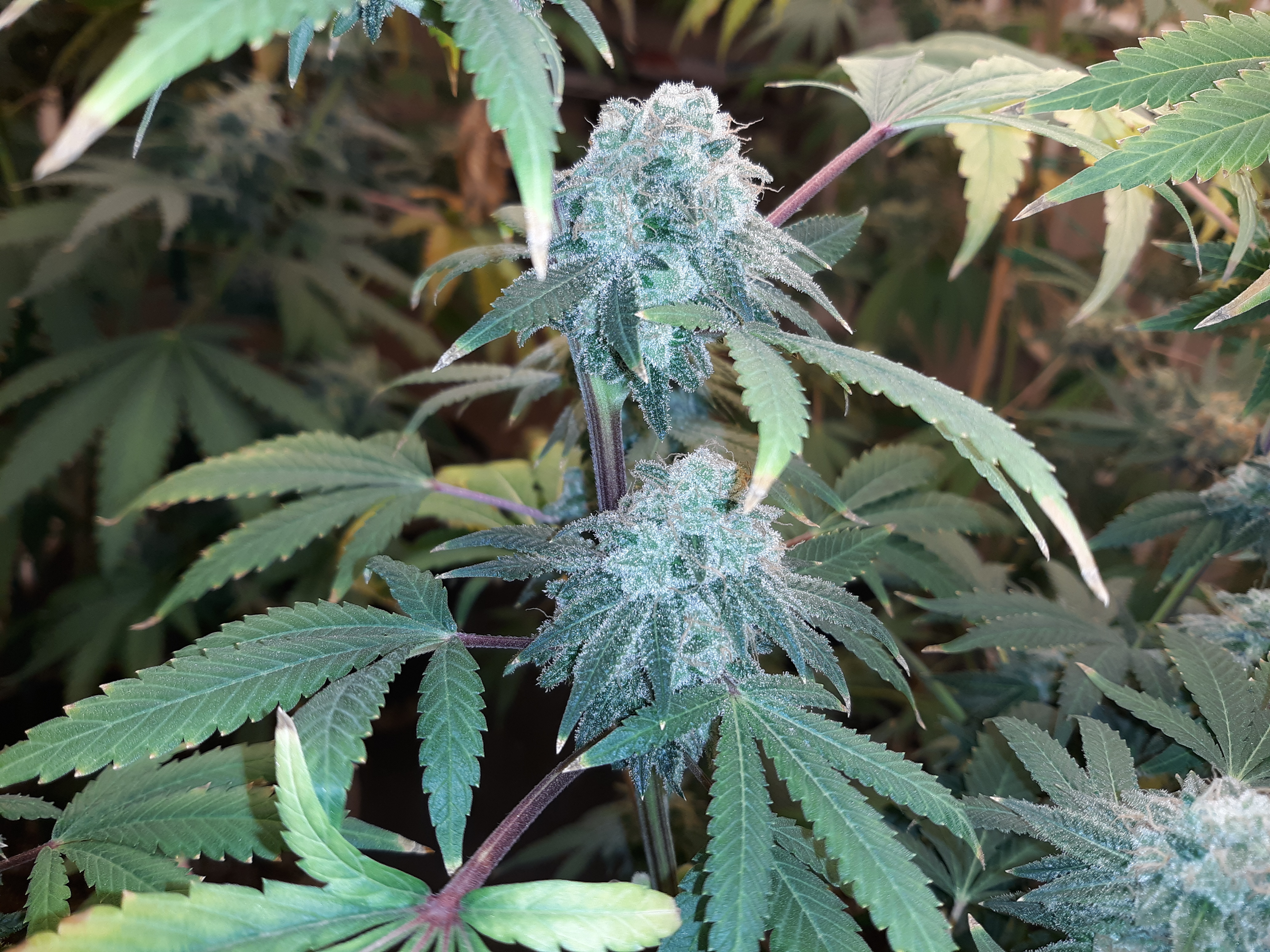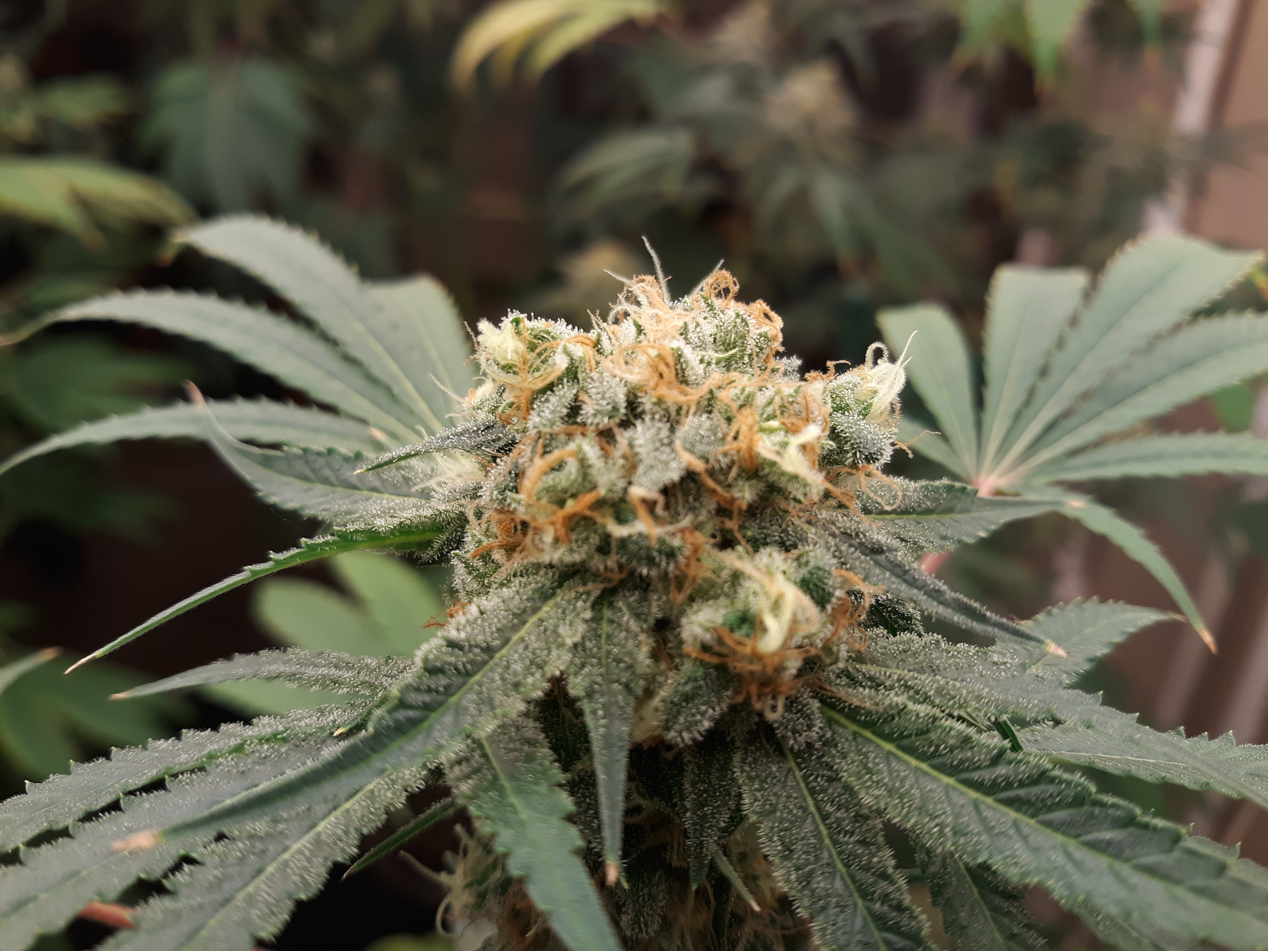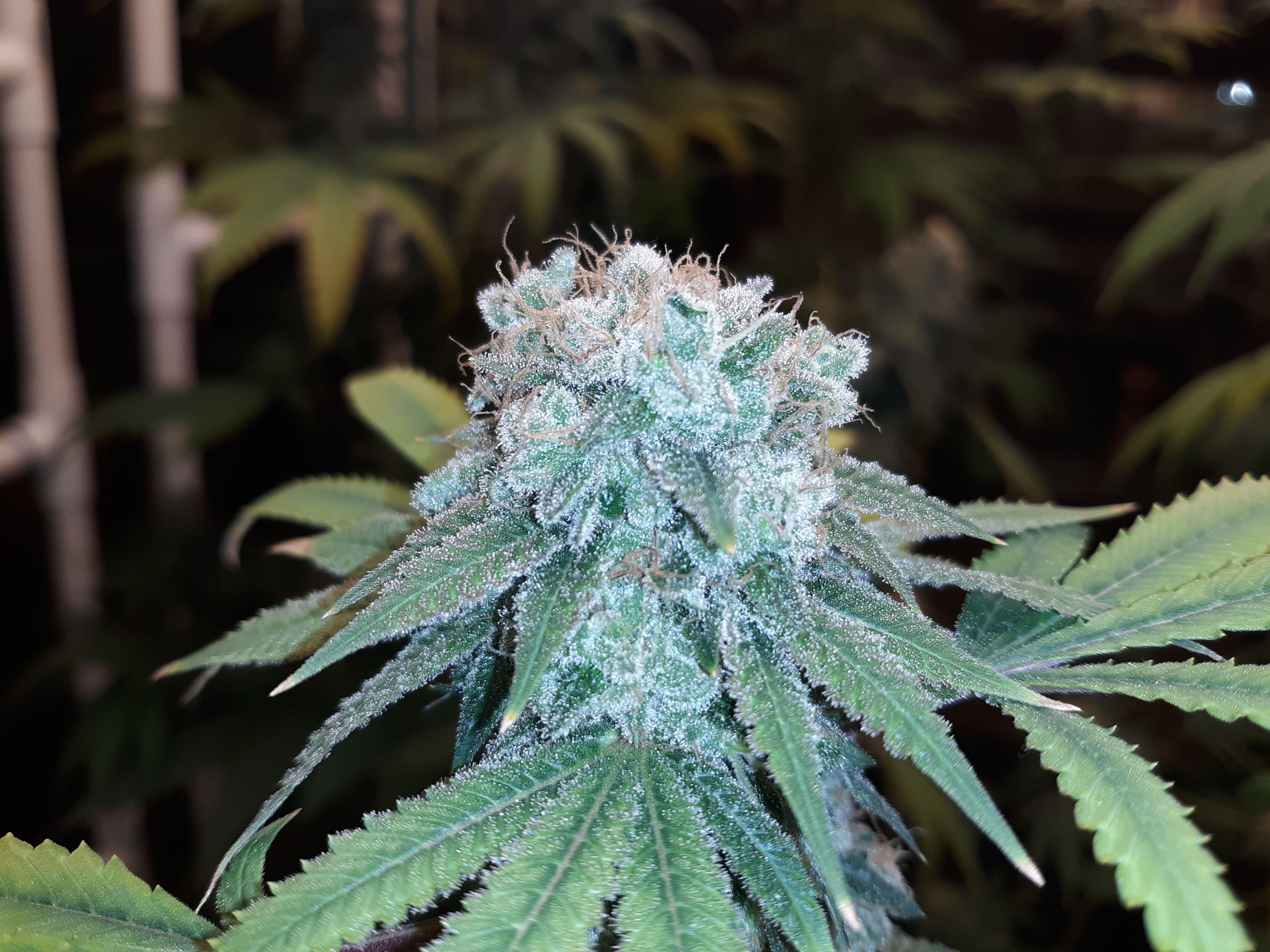The others are for sure all Sativa and at different stages of maturity (these are at 8 weeks and 1 day into flower as well). There was 1 Sativa I did trim up (lower branches, wasted plant energy) at 6 weeks old, let the popcorn buds dry in a tray for a couple of days and WOW!!! The flavor, taste, smell, and burnability was all 5 stars!!! No choking or hacking, smooth to the palate. And what a buzz! Wake up smiling, ready to go!!! And the buzz lasts quite a long time!!!