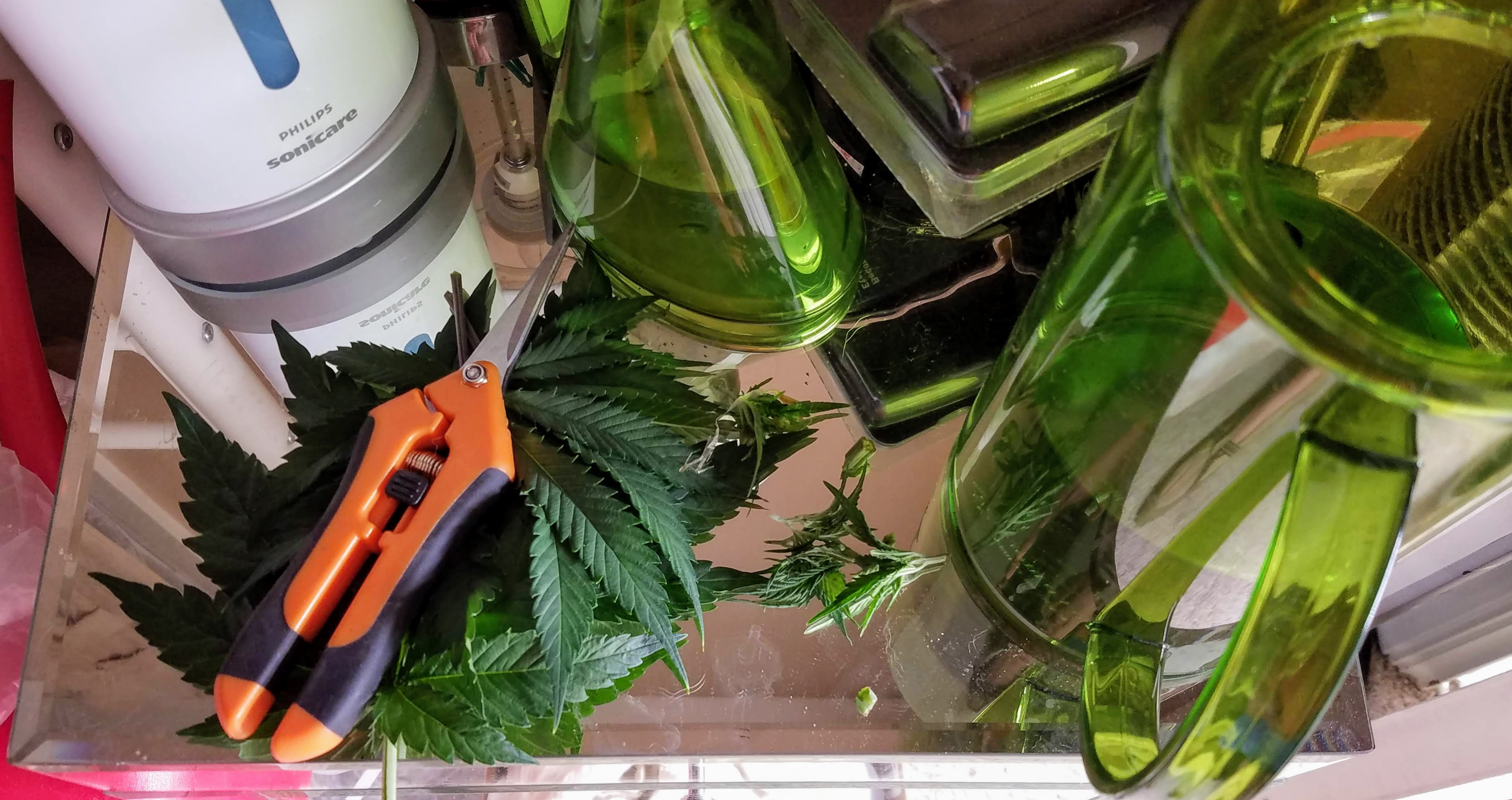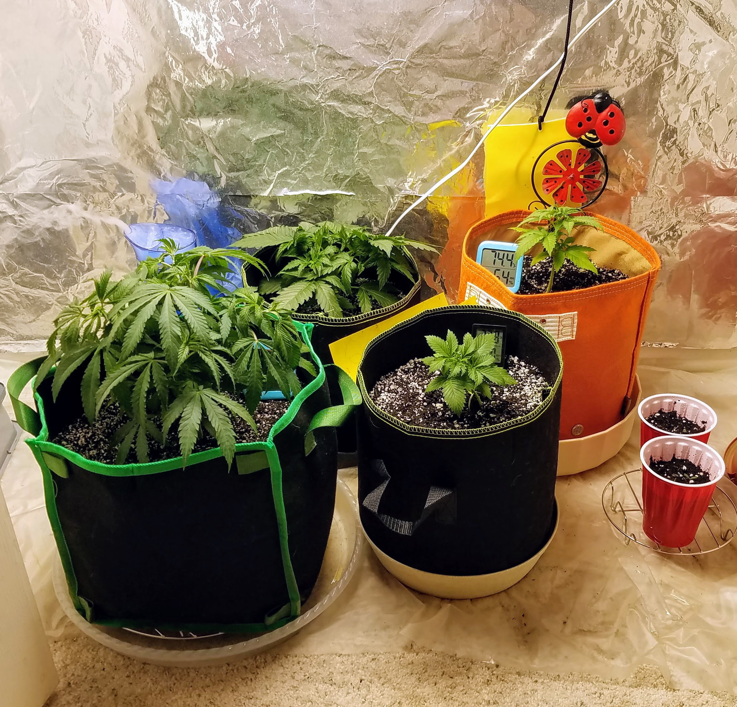On 9/11 I topped Wild Thai and White Widow Fast #1, and watered everyone. I moved the humidifier toward the corner and bunched the plants together under the light. I felt like poop all weekend, hopefully I can work on them tomorrow, and they need watering. I put the two tops in a small glass of water on top of the fridge (cat-free zone, so far) and forgot about them. There are a few roots growing out of both stems. I need energy, coffee isn't worth the headache. If anyone would like to pick a plant and tell me how they'd train it I'm game, I can follow directions. Adopt-a-Plant Training and Naming Rights. Wild Thai needs to be ready to flip as soon as I can. The transplanted White Widow Fasts are coming along, the one that's missing parts due to cat wants to grow sideways, not as tall as it's birth mate in orange.